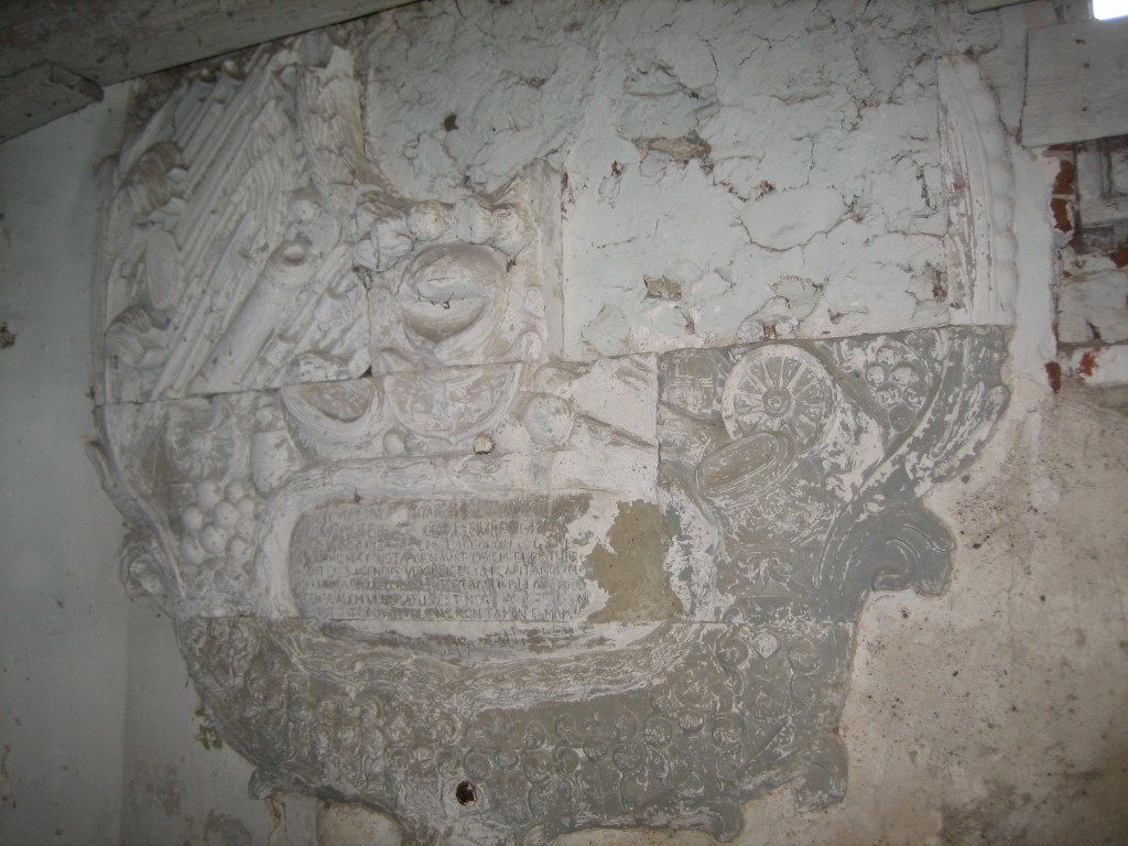 Leider wurde das Kunstwerk zusammen mit den Innenwänden mit einer weißen Kalktünche überzogen. Neben ornamentalem Schmuck sind militärische Utensilien wie Gewehrläufe, ein Kanonenrohr und ein Wagenrad zu erkennen. Eine lateinische Inschrift in einer mit einem Ornamentband umsäumten Kartusche skizziert das Leben des Kirchengründers.