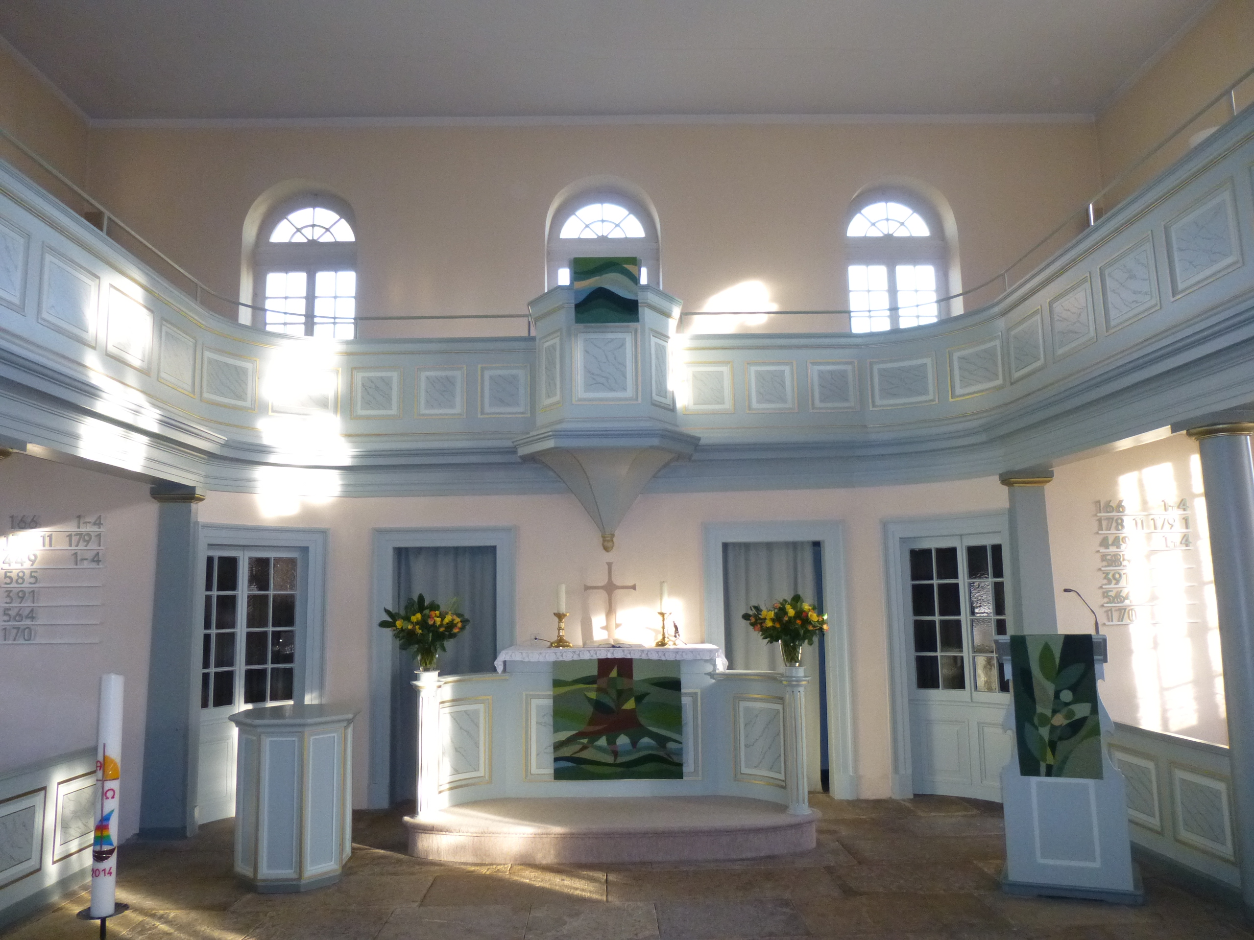 Ein lichtdurchfluteter Kirchenraum war für Hellners protestantisches Liturgieverständnis unabdingbar. In Alt-Garbsen wird der für 220 Besucher konzipierte Innenraum durch je vier wandlange Fenster an den Längsseiten erhellt. An den Schmalseite sorgen geschosshohe Fenster für Tageslicht. Diese „Lichtflut“ kommt besonders bei tiefstehender Sonne in den Wintermonaten zur Wirkung, wie meine an einem Februartag gemachten Fotos zeigen.