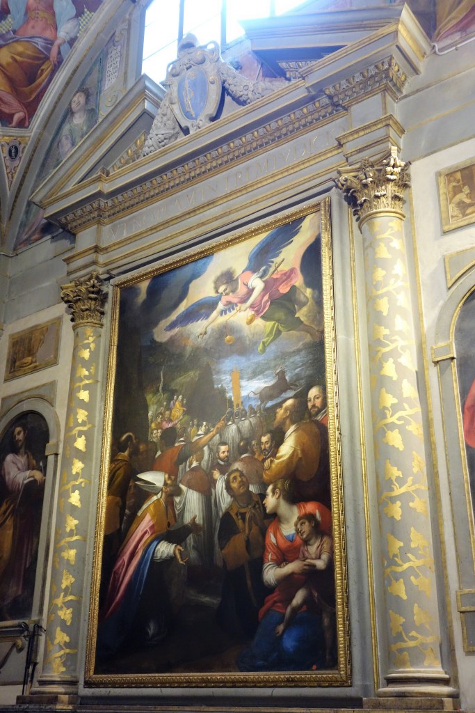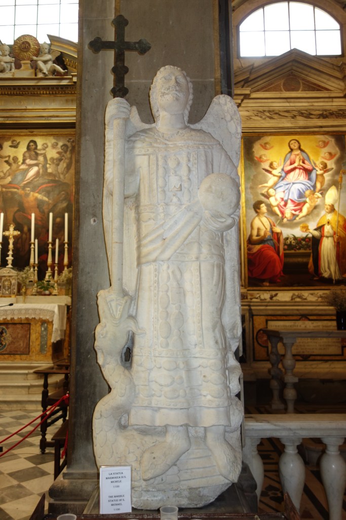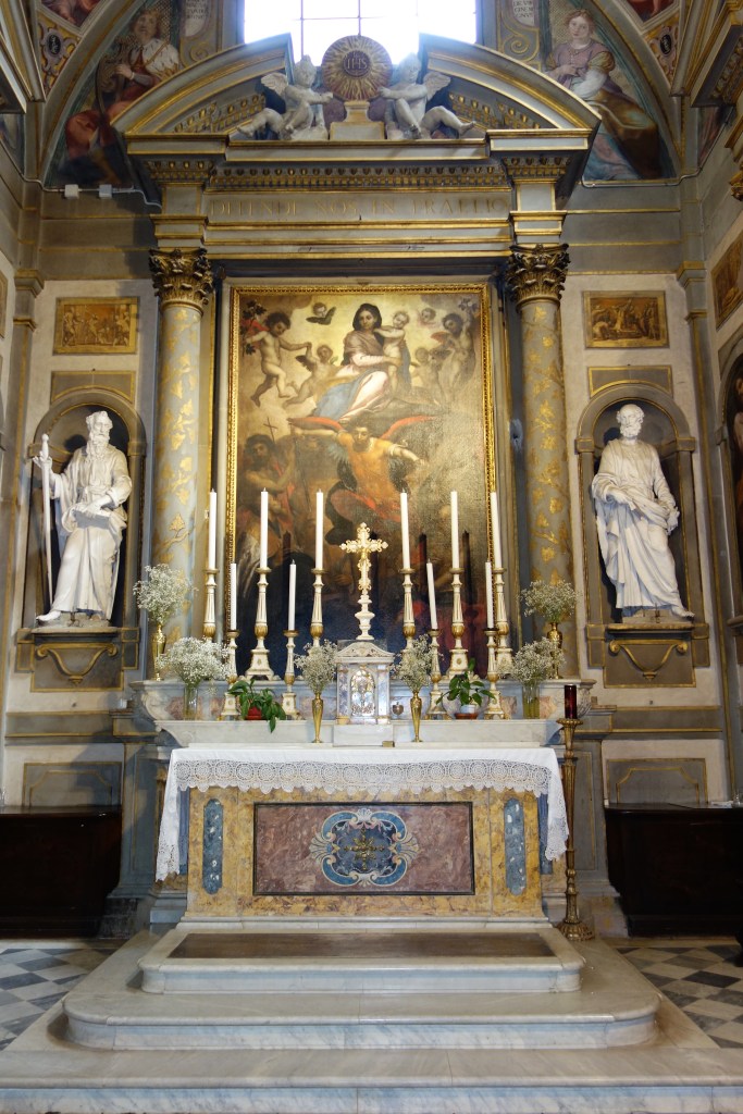 Eine Vielzahl von Heiligenlegenden und biblischen Szenen ist hier in Skulptur, Öl- und Freskomalerei dargestellt. Dem Erzengel Michael, Patron der Kirche, ist die mittlere der Kapellen gewidmet. Das Altargemälde, das Statuen der Apostel Petrus und Paulus flankieren, zeigt Maria umgeben von Heiligen. Die Themen weiterer Ölgemälde sind Episoden aus der Legende des Erzengels.