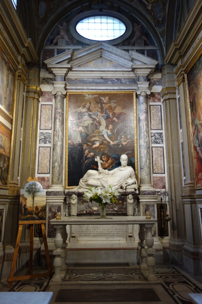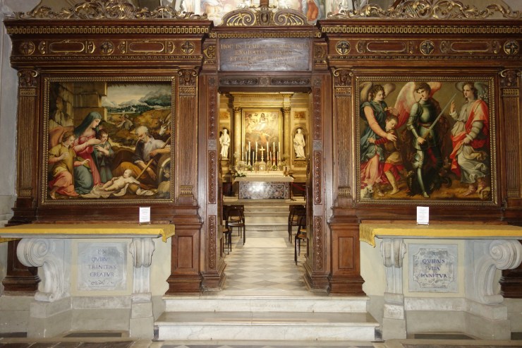 Zwei wappentragende Marmorengel bewachen den Eingang zur linken Kapelle, die dem Ordensgründer gewidmet ist. Eine lebensgroße Skulptur Giovanni Gualbertos ruht darin in halbliegender Position auf einem Sarkophag, ein Kreuz in der rechten Hand haltend. Eines der Ölgemälde zeigt, wie dem Mörder des Bruders des Ordensgründers vergeben wird.