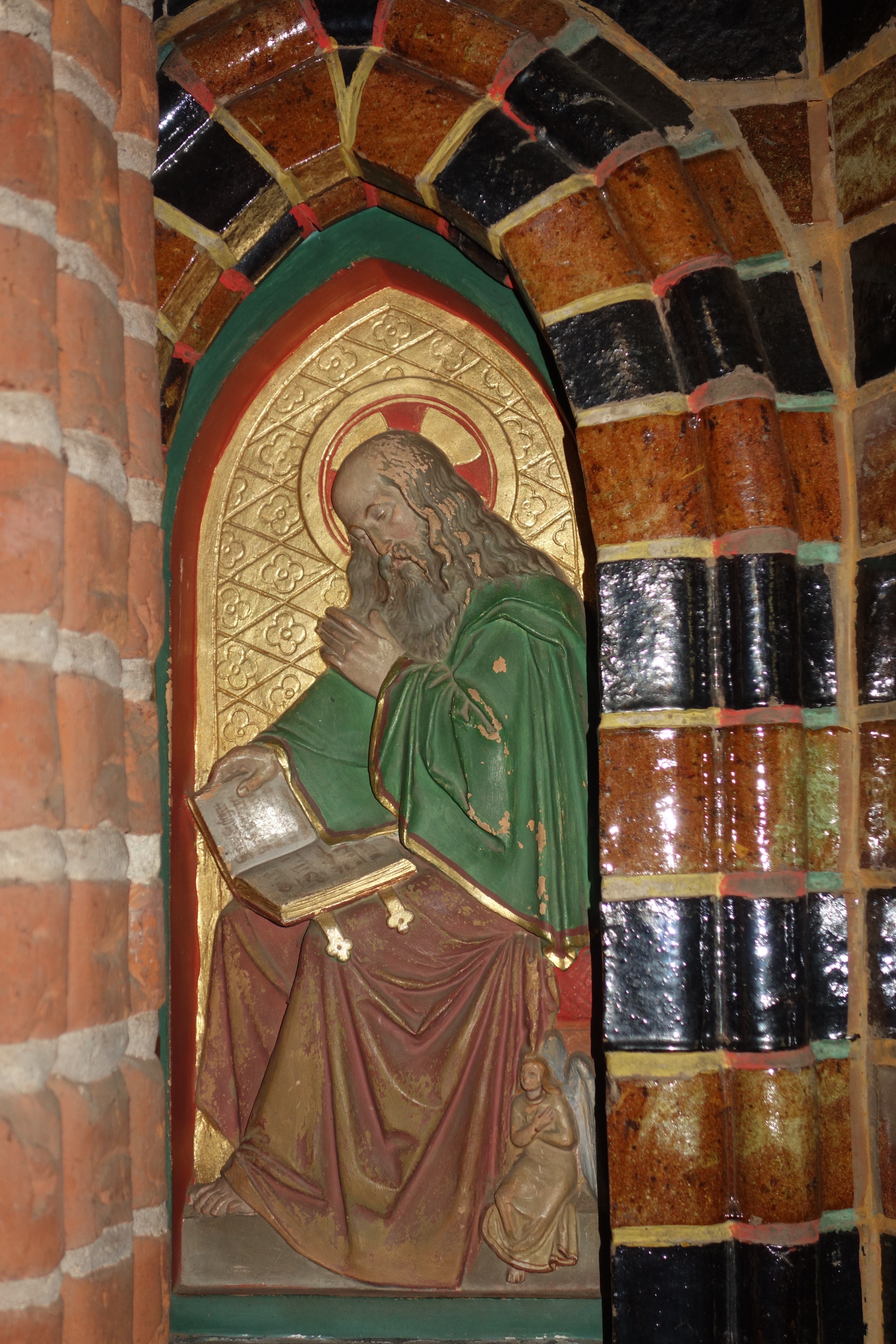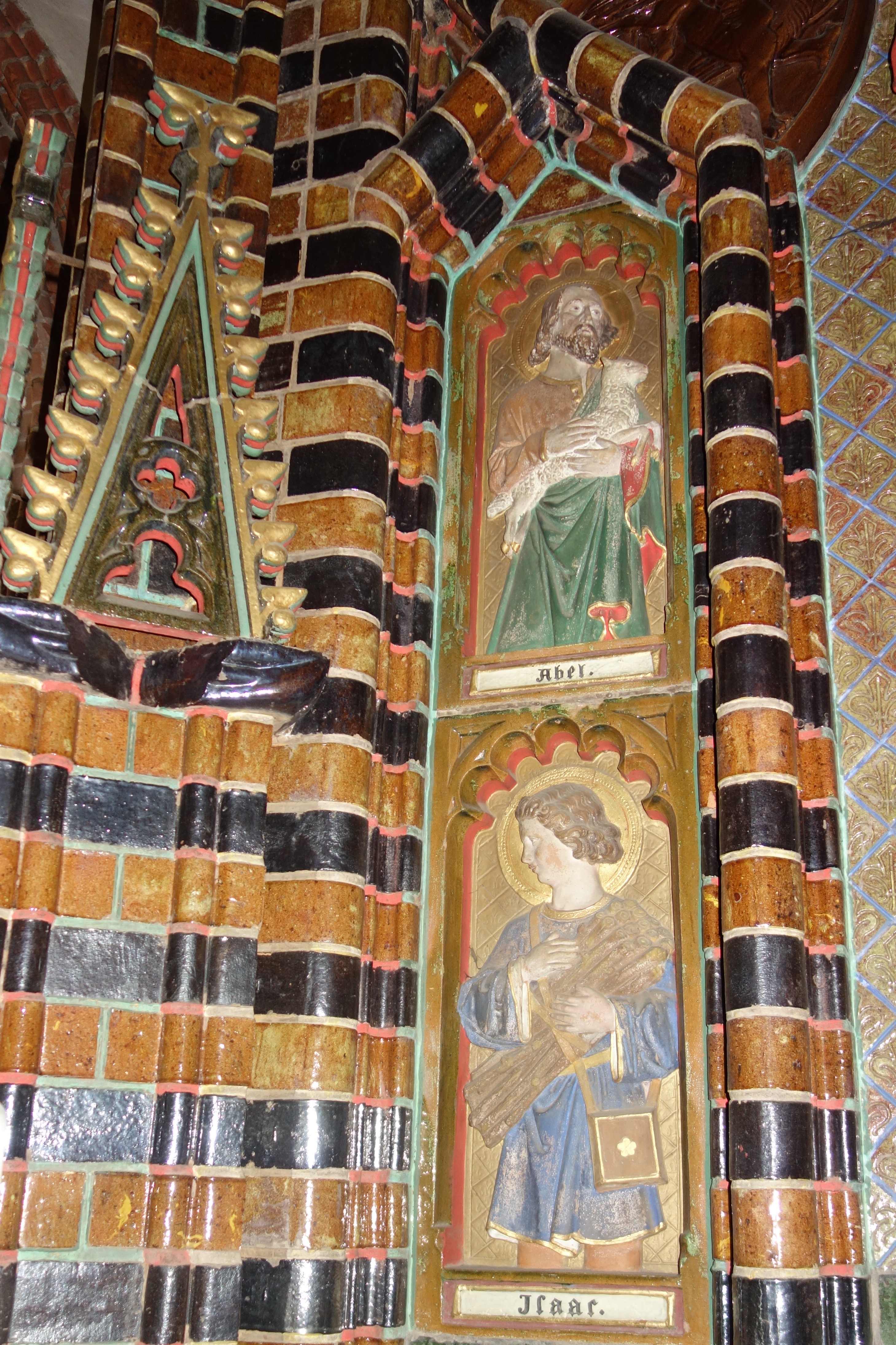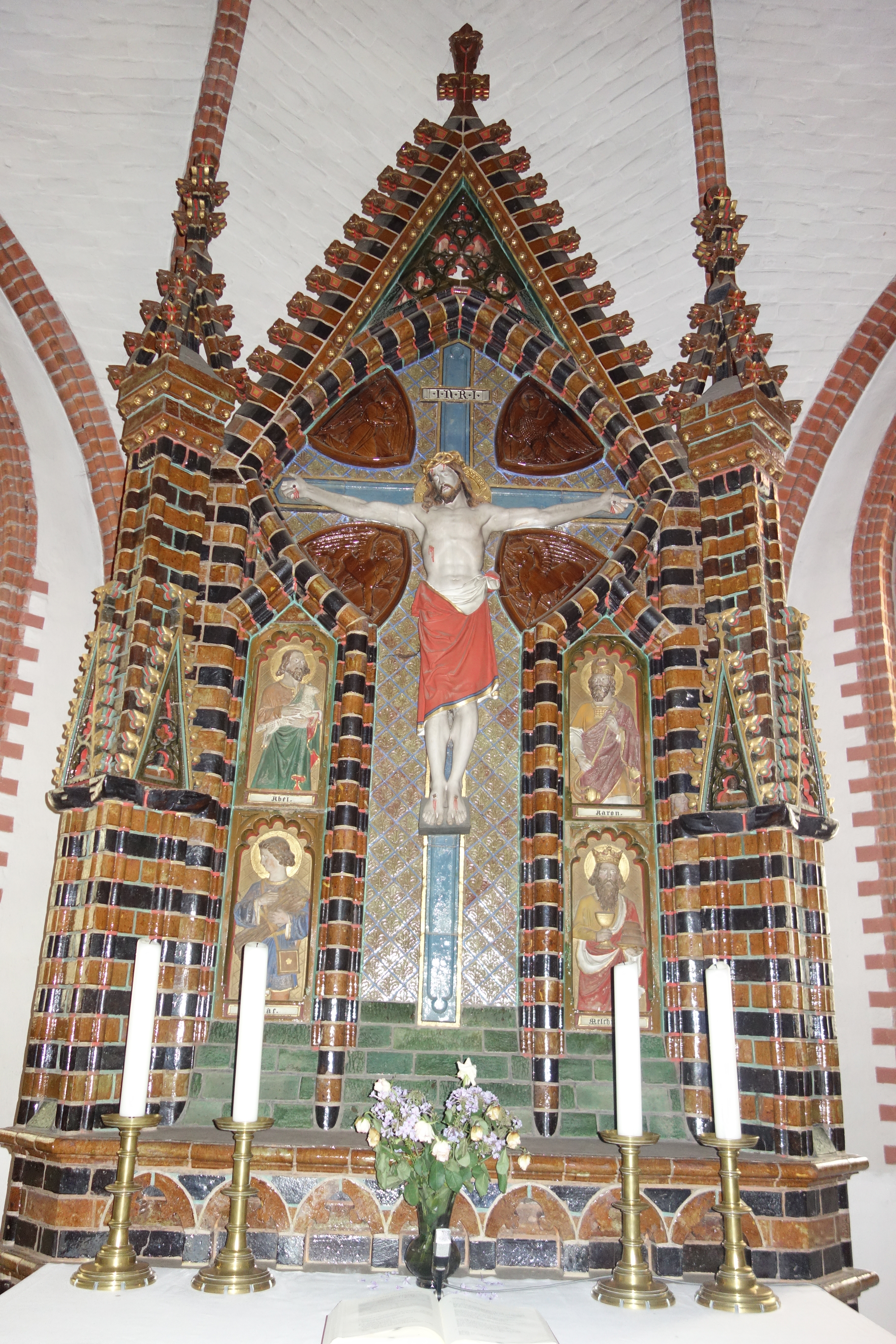 Der filigran gestaltete Altaraufsatz zeigt im Zentrum eines architektonischen Aufbaus Christus am Kreuz. Die Flächen zwischen den Kreuzarmen enthalten tiefrot glasierte Kacheln mit den Symbolen der Evangelisten, die das Haupt Jesu umgeben.