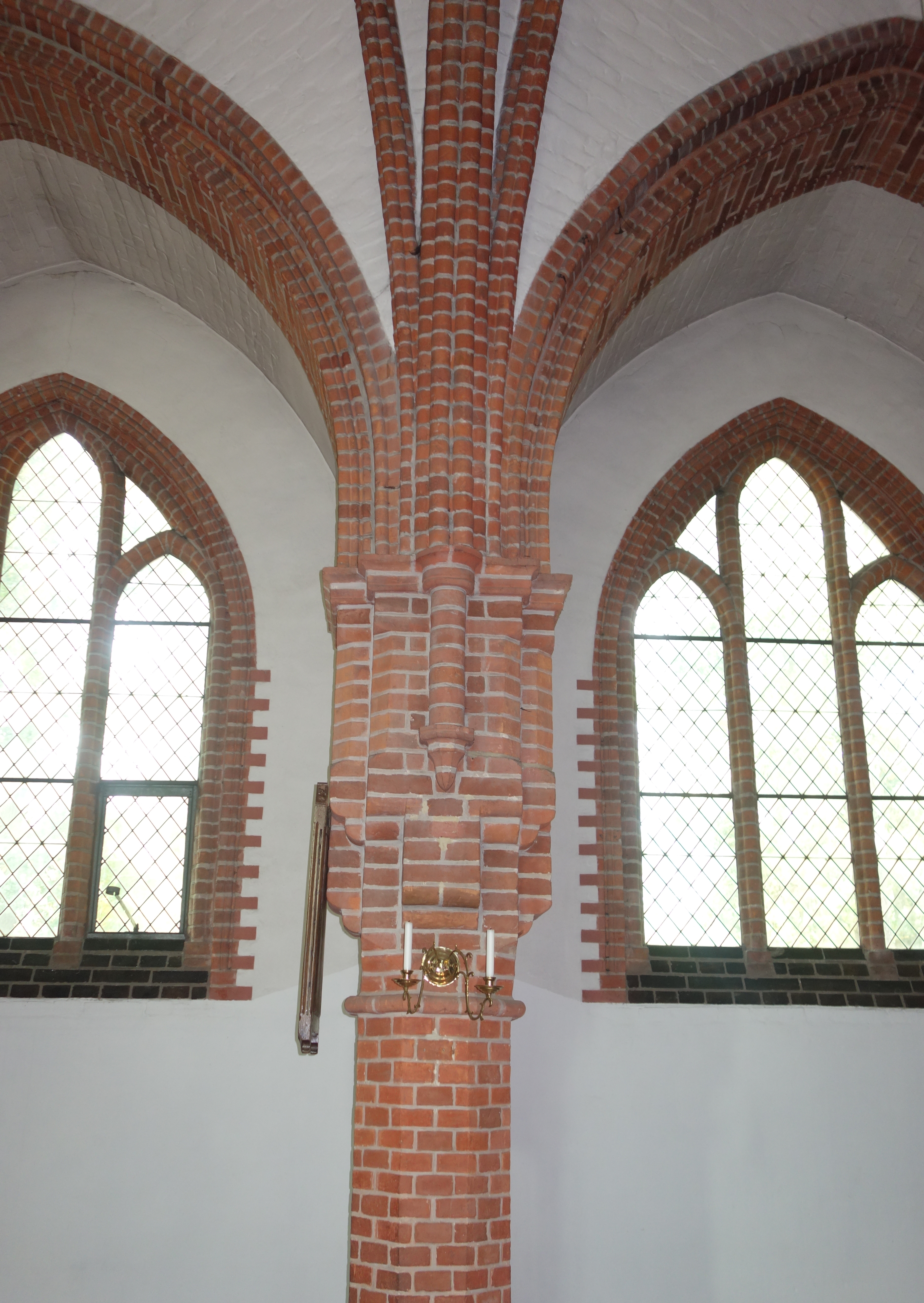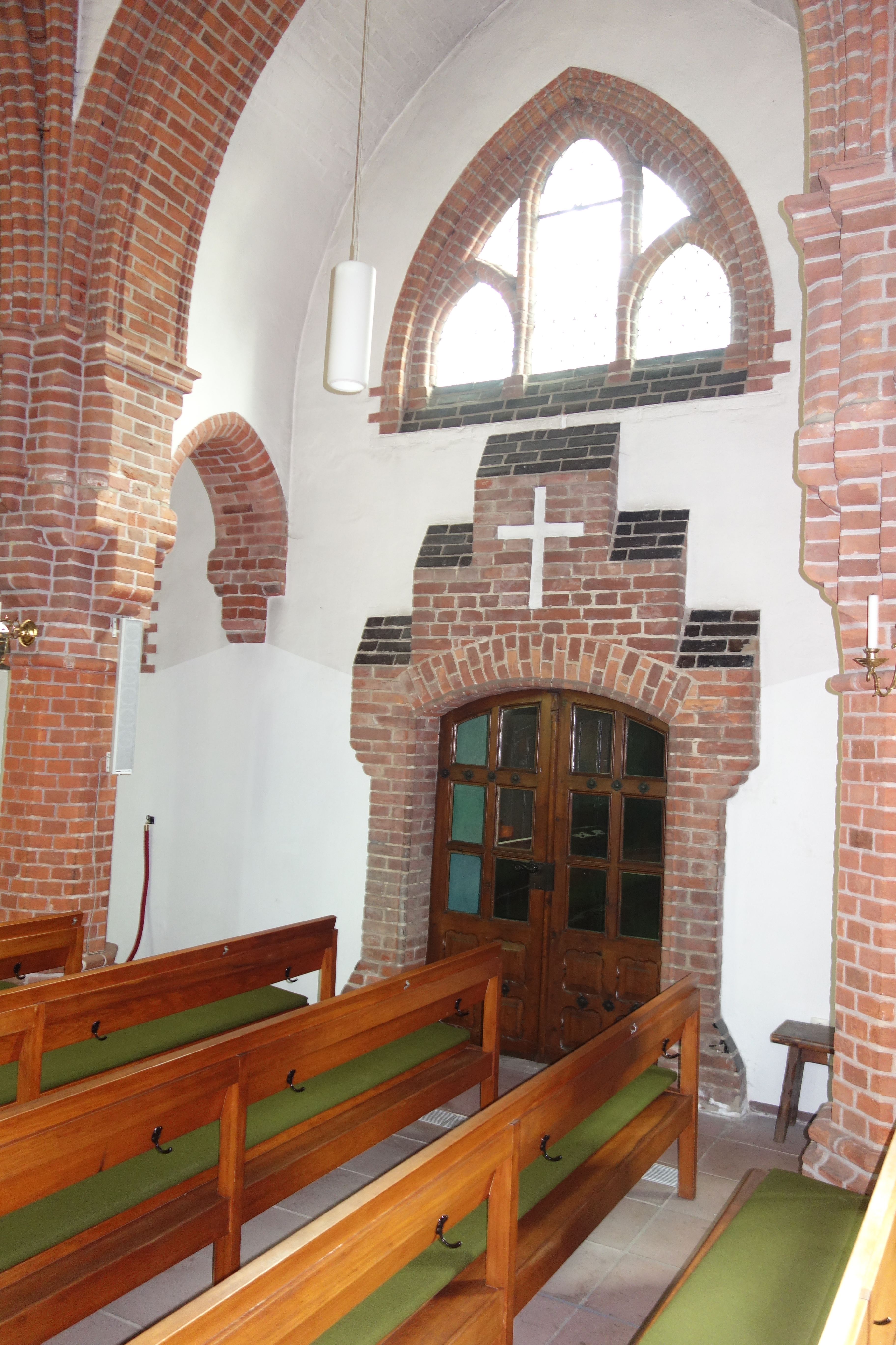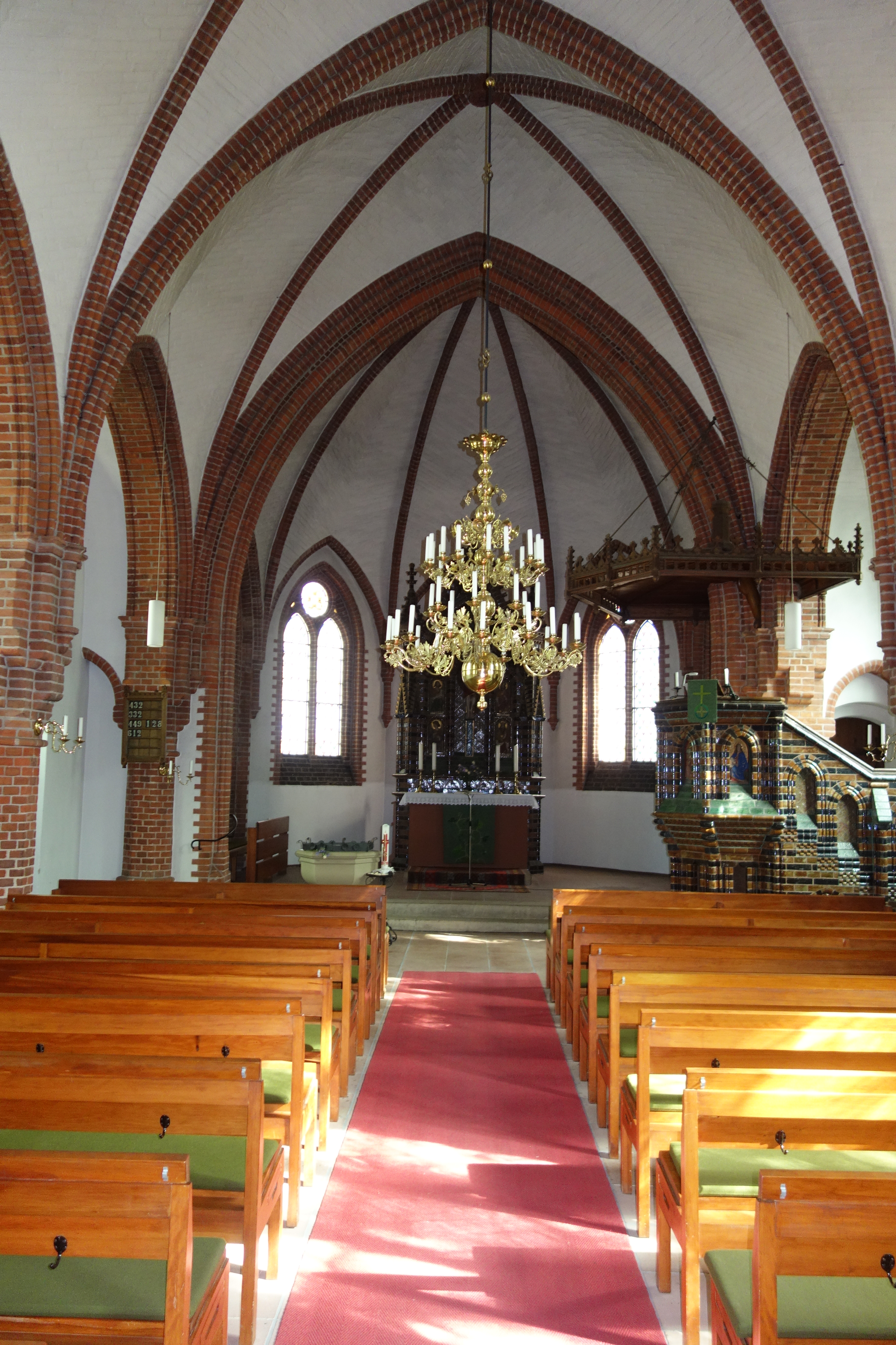 Das Innere des Kirchenschiffs und der eingezogene Chor schließen mit Rippengewölben ab. Durch zwei Pfeilerreihen werden sehr schmale Seitenschiffe abgetrennt. Der Raumeindruck wird von dem Kontrast zwischen dem Weiß der Wände und Gewölbekappen und dem dunklen Rot der steinsichtigen Bauteile beherrscht.