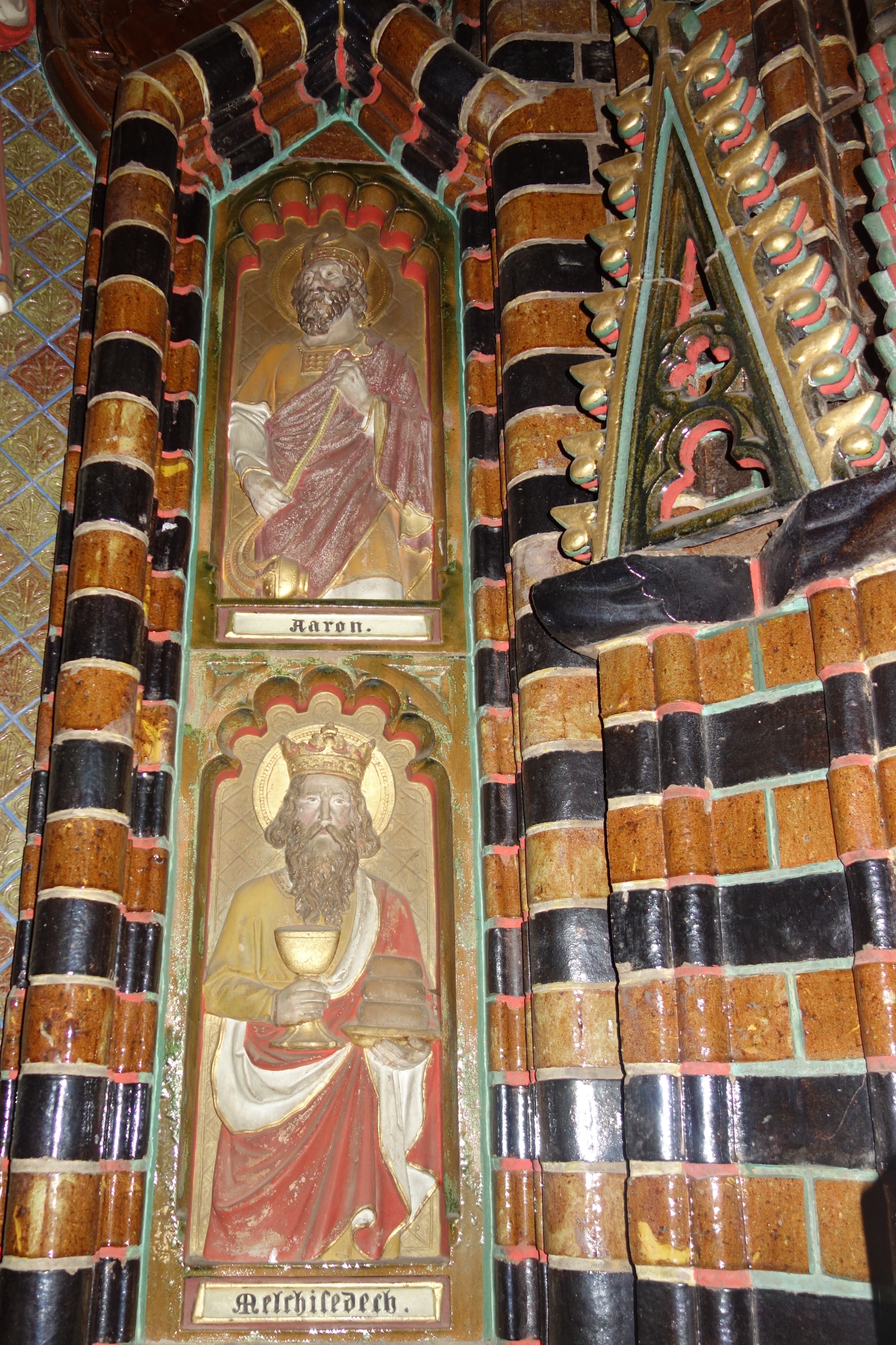 Melchisedeck schließlich, der Abraham mit Brot und Wein empfängt, leitet über zum christlichen Abendmahl, das am Altar eingenommen wird. Als König trägt er eine Krone auf dem Haupt. In den Händen hält er den Kelch und das Brot.