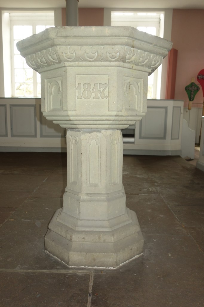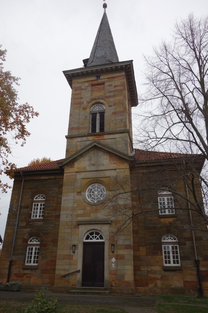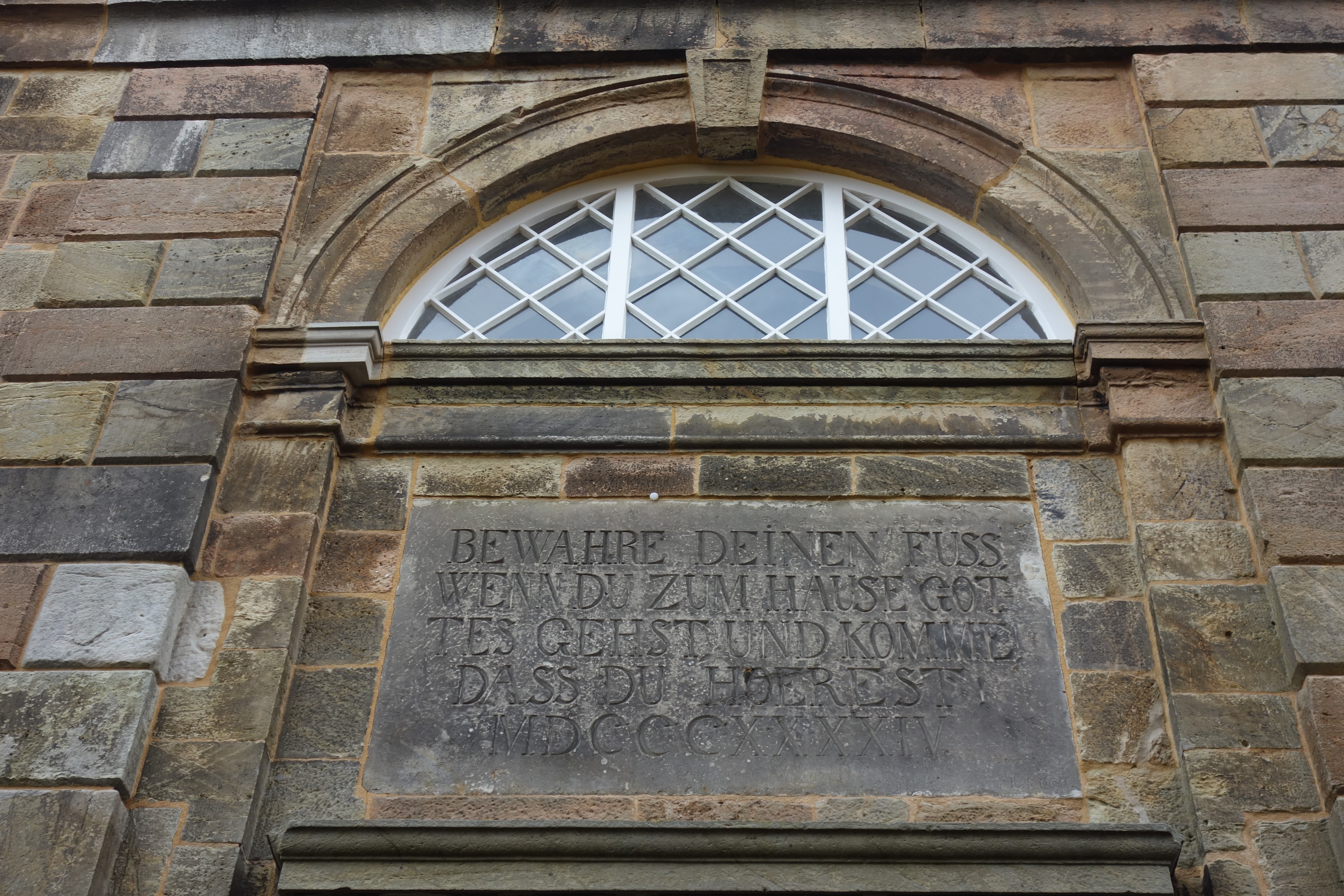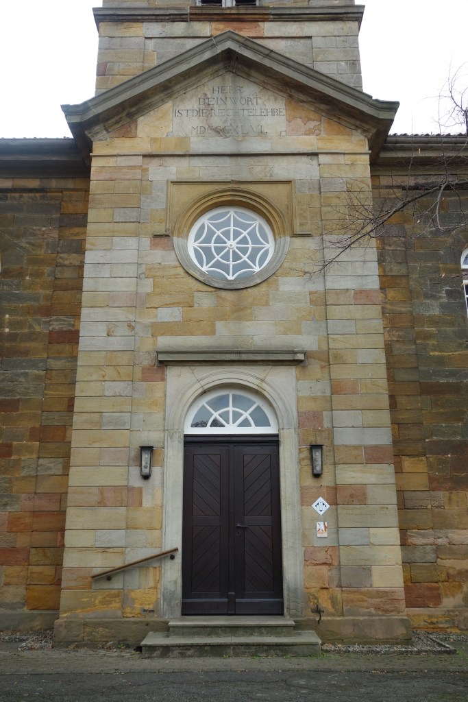 Die Eingangspforte befindet sich im breiten Westriegel des Gebäudes, dem der Turm wie ein Dachreiter aufsitzt. Auch hier ist über der Tür eine Schrifttafel eingelassen. Beim Lesen des Textes meint man ähnlich wie in Gielde den erhobenen Finger des dozierenden „Predigers“ vor Augen zu sehen:
