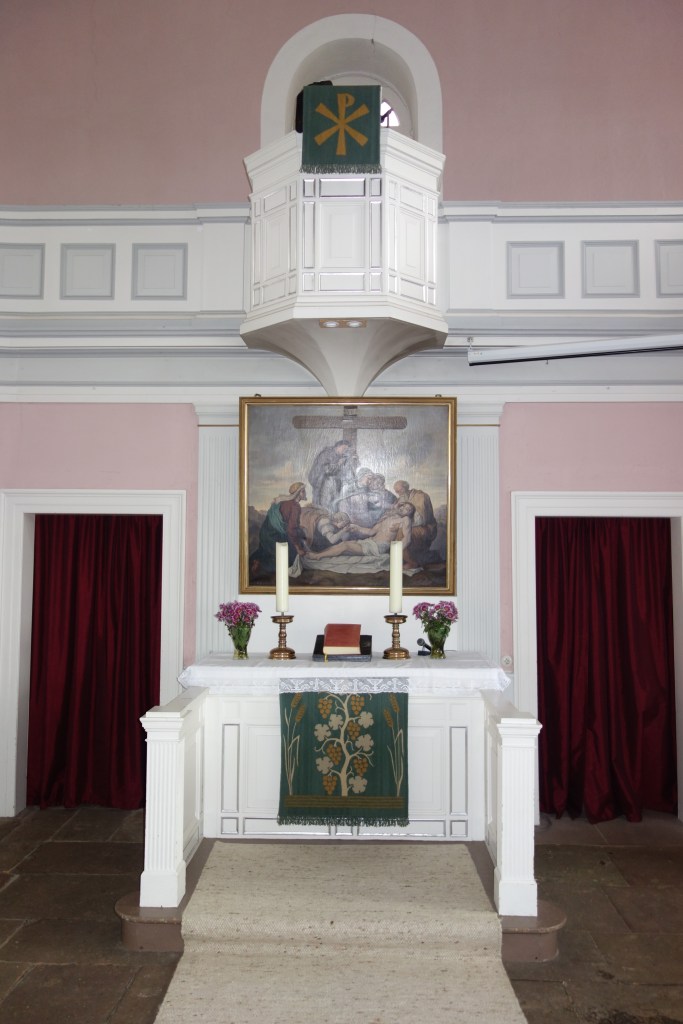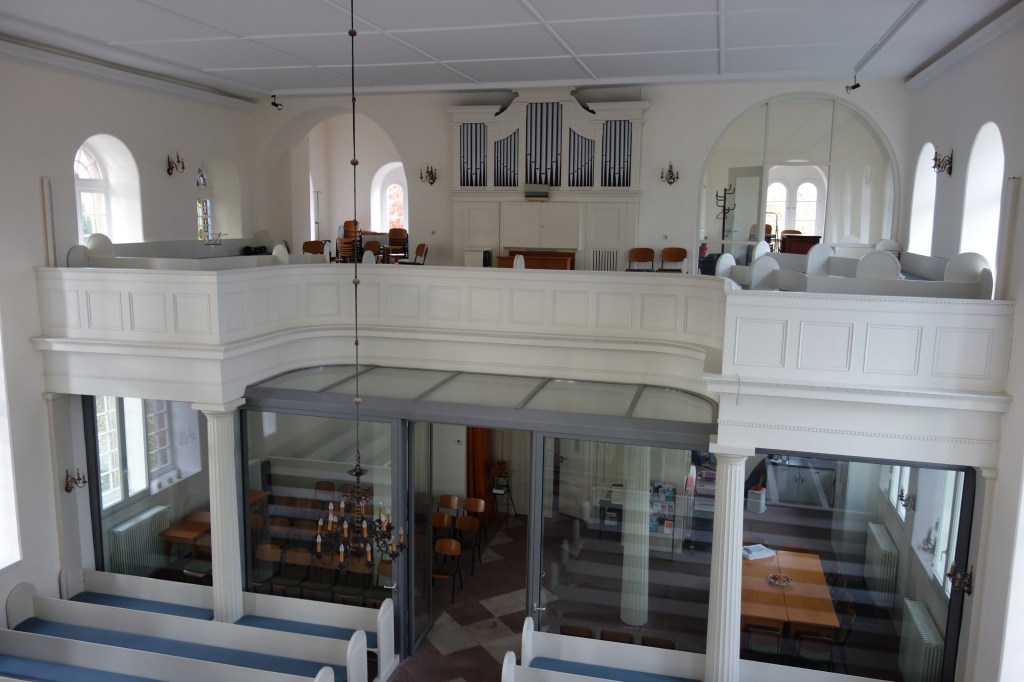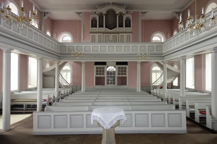 Der Raum ist wie in Gielde flach gedeckt, Emporen finden sich nur an den Schmalseiten, wobei unter der Orgelempore durch Verglasungen eine Winterkirche abgetrennt wurde. Die Kanzelaltarwände, in anderen Entwürfen des Baumeisters prachtvoll gestaltet, sind in beiden Kirchen nahezu puristisch ausgeführt. Auch in früheren Zeiten standen den meisten Gemeinden schließlich keine unbegrenzten Finanzquellen zur Verfügung.