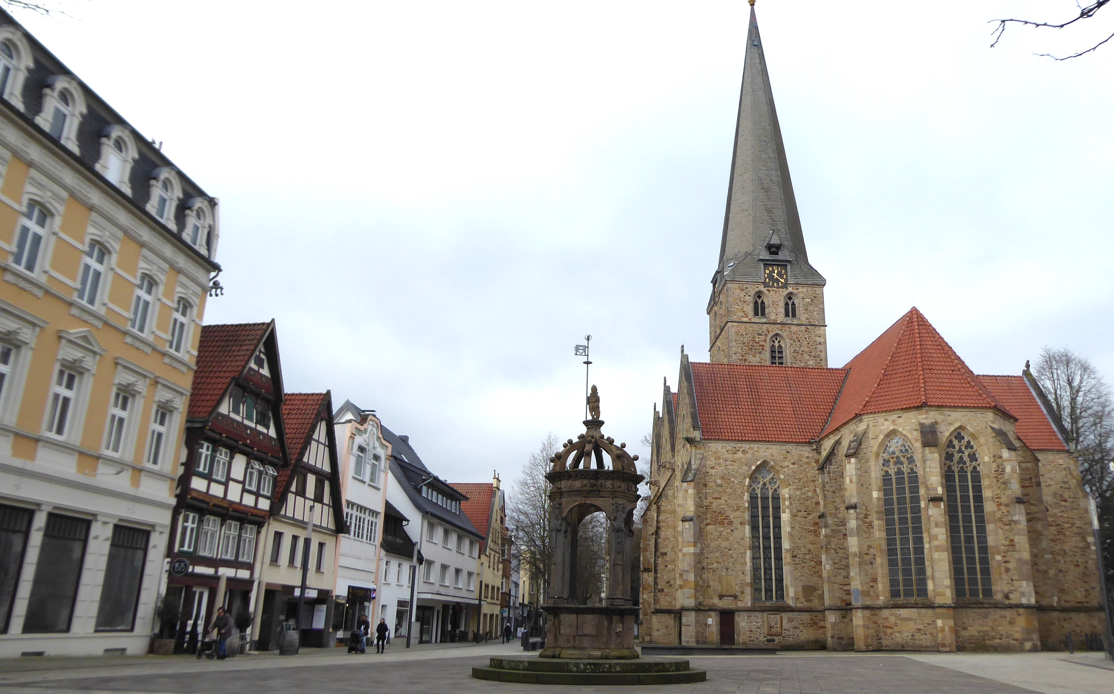 Die St. Johanniskirche in Herford wurde im 13. und 14. Jahrhundert, in der Zeit der Gotik, erbaut. Wasserspeier in Gestalt von Tieren, Fabelwesen und Dämonen sind typische Details der Bauten dieser Epoche. In Herford schaut dieser Teufel mit einem Dreizack aus großer Höhe herab. Er steht für die bösen Mächte, die die Welt bedrohen.