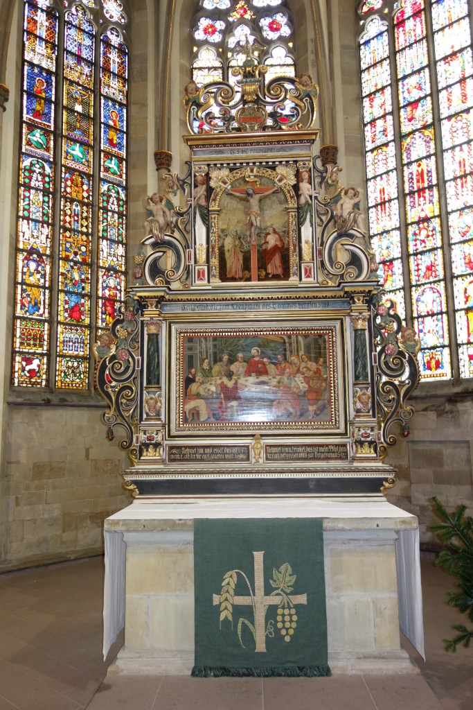 Umgeben von hohen Fenstern, deren Glasmalereien zu großen Teilen noch aus dem Mittelalter stammen, dominiert im Chor der noch aus dem 16. Jahrhundert stammende Altar. Sein Bildprogramm wird, ganz den Empfehlungen Luthers entsprechend, vom Gedenken an den Opfertod Jesu Christi bestimmt. Unter einer Kreuzigungsszene im oberen Geschoss befindet sich ein großformatiges Gemälde des letzten Abendmahls mit den Einsetzungsworten.