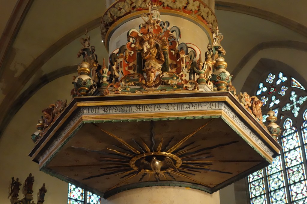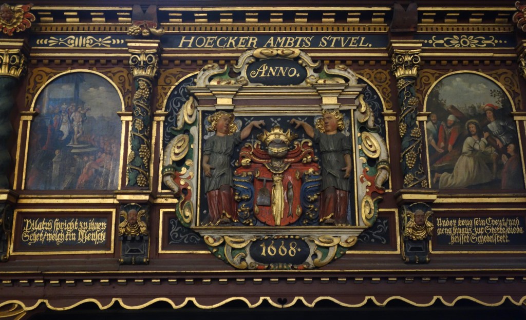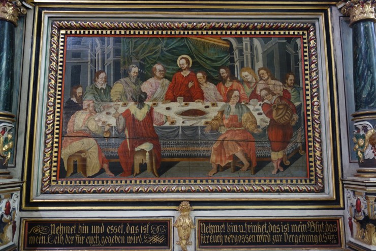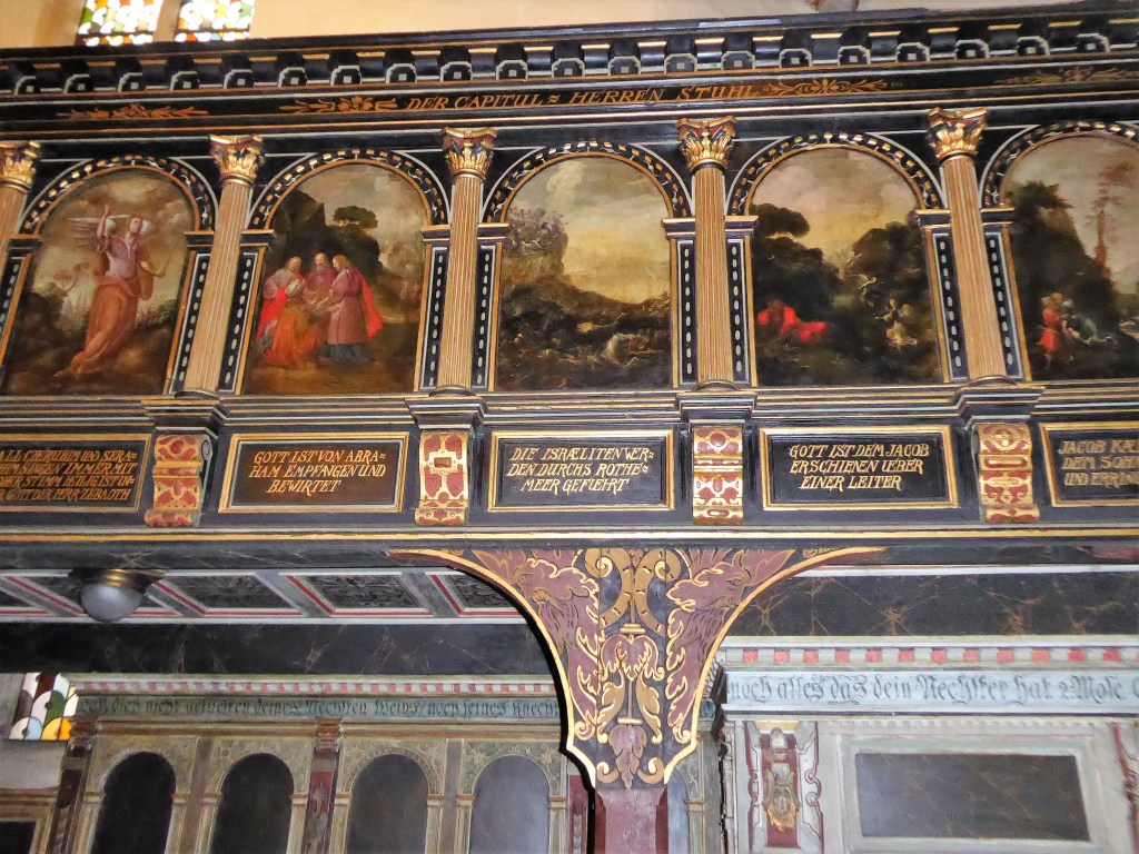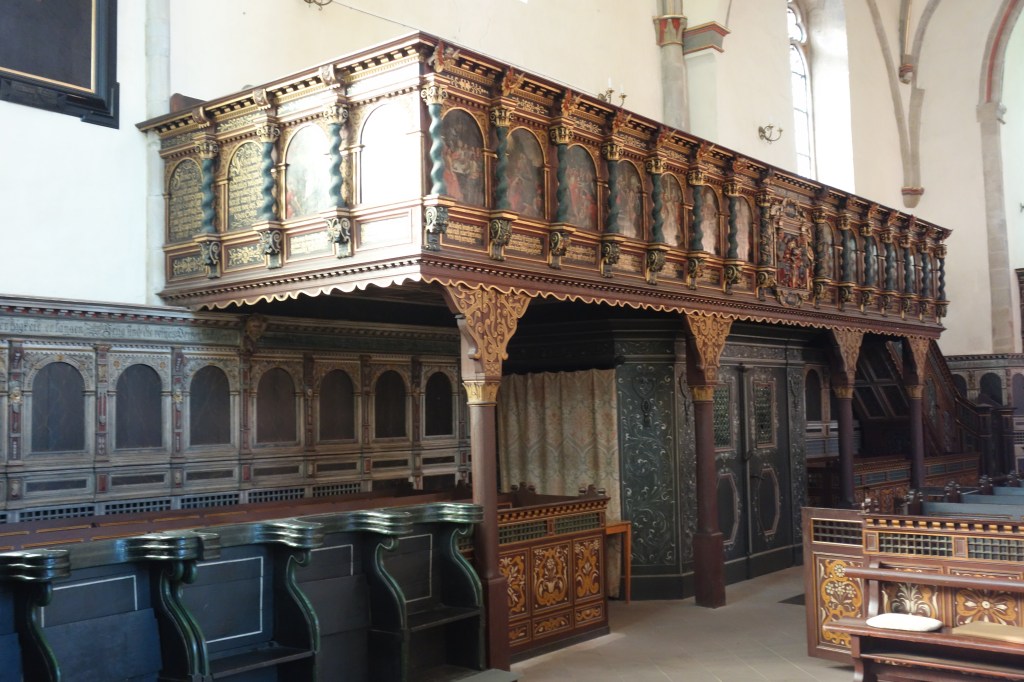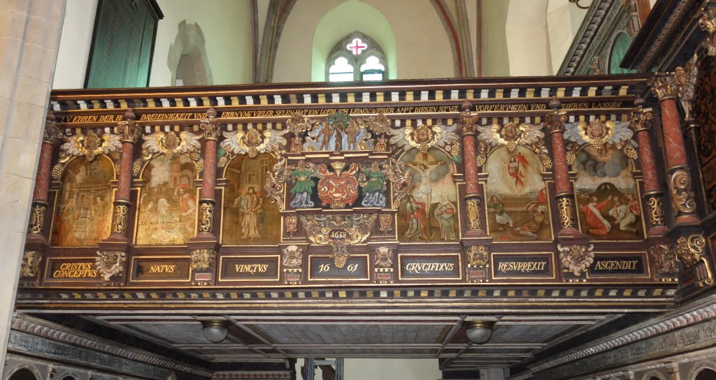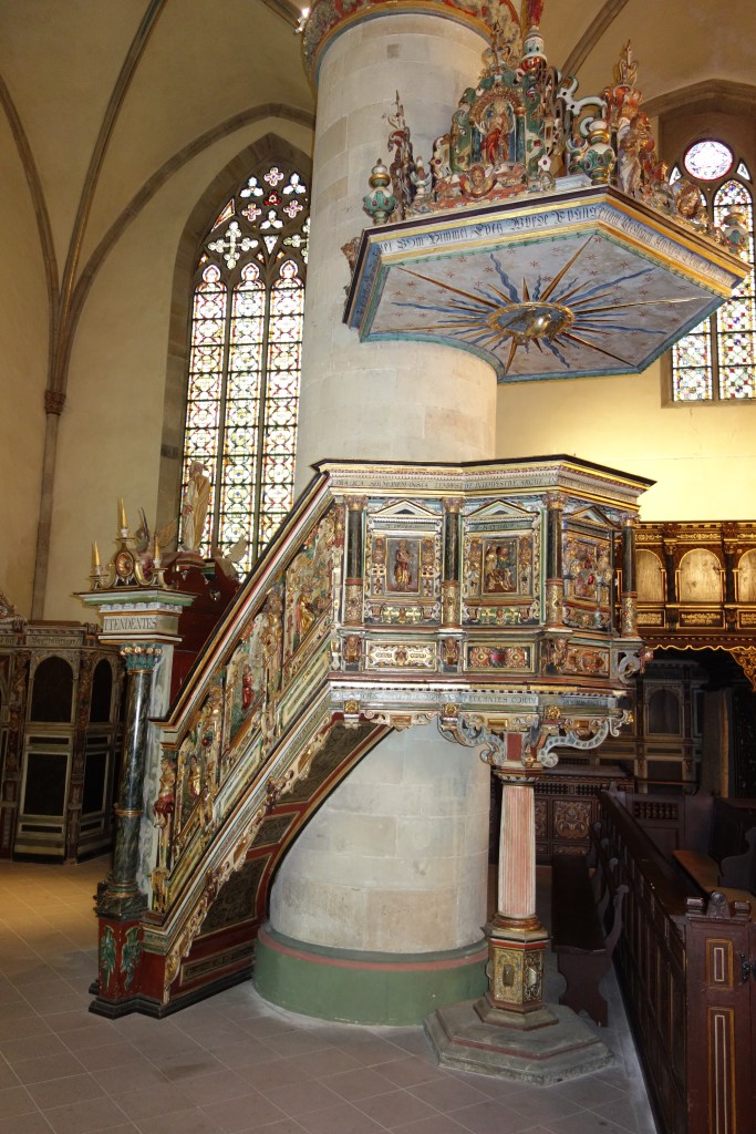 Die Verbindung von Bild und Text, die auch die Gestaltung der Kanzel und der Emporen prägt, setzt sich auch hier fort. Die stilreine Ausstattung aus der Zeit der Renaissance entfaltet vor dem Besucher ein vielschichtiges illustriertes Evangelium und bietet ihm ein besonderes Raumerlebnis in der gotischen Kirche.