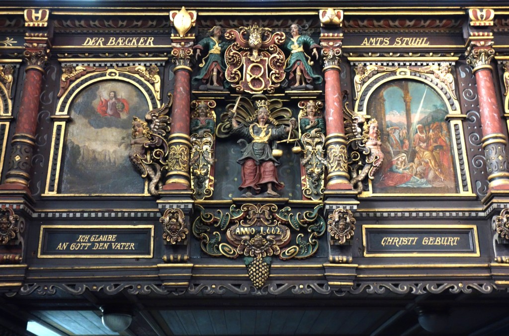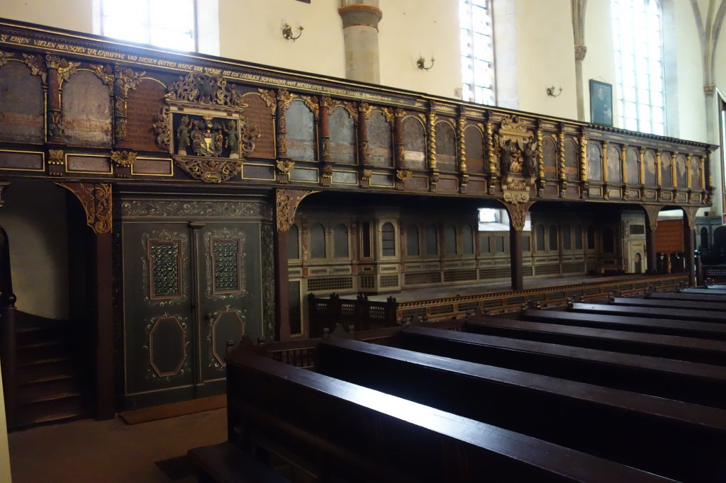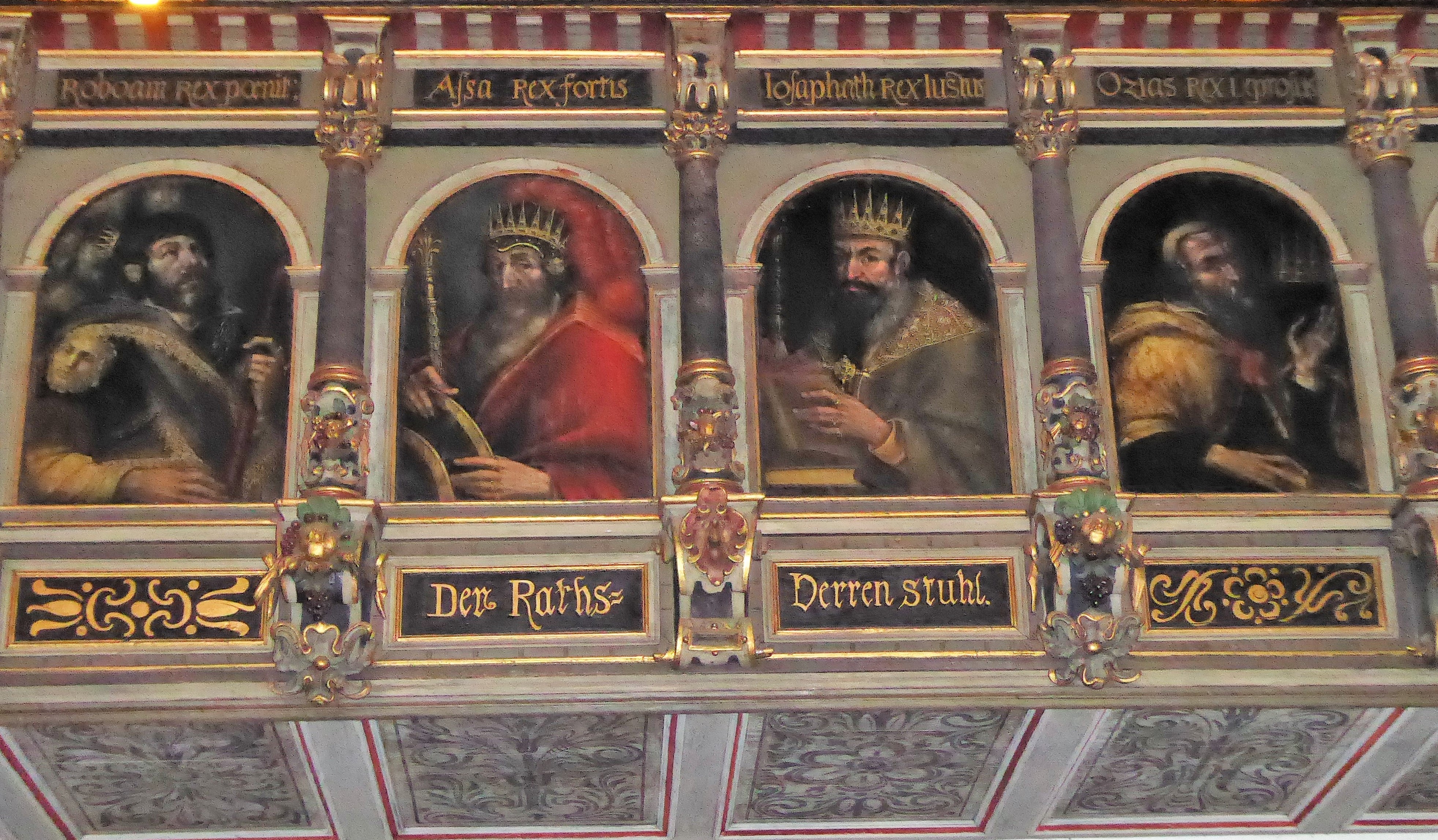 Den Ratsherren als Führungsspitze der Stadt wurde ein besonders exponierter Platz für ihre Teilnahme am Gottesdienst eingeräumt. Im Westen, direkt über dem Mittelgang bot sich ihnen der unverstellte Blick auf den Altar und die Kanzel. Sicher wurden nicht zufällig Könige des alten Testaments als Thema für die Gemälde der Brüstung gewählt.
