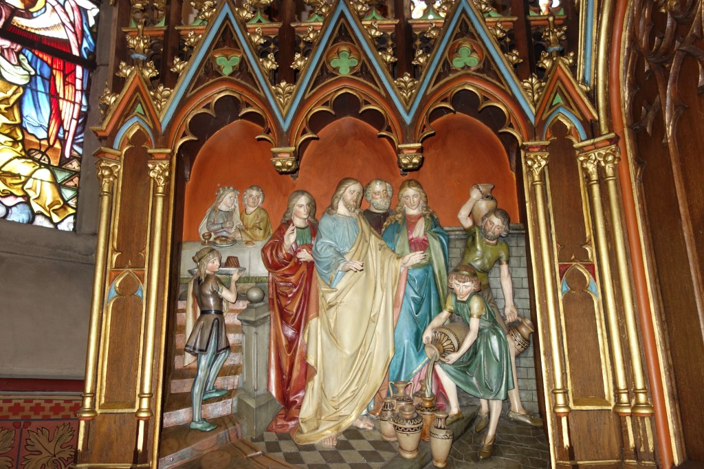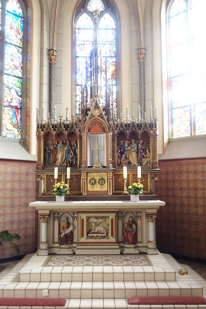 „Seht das Lamm Gottes!“ Der Ausspruch Johannes‘ des Täufers ist auf der Vorderseite der Altarmensa zu lesen. Das Lamm, das auf dem Buch mit sieben Siegeln liegt, das Altarkreuz, der Pelikan, der seine Jungen scheinbar mit seinem eigenen Blut nährt – die Bilder stehen für den Opfertod Jesu, an den bei der Feier der Eucharistie erinnert wird. Zwei reliefartige Darstellungen im Altaraufsatz, die Hochzeit zu Kana und die Brotvermehrung, weisen auf die Symbolik von Brot und Wein bei der Feier der Eucharistie hin.