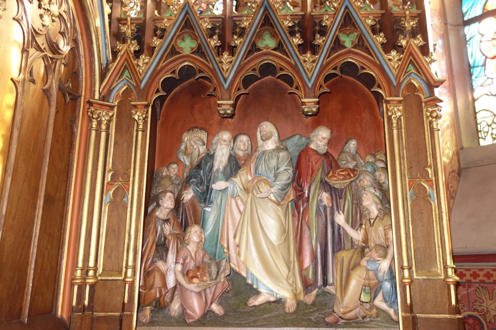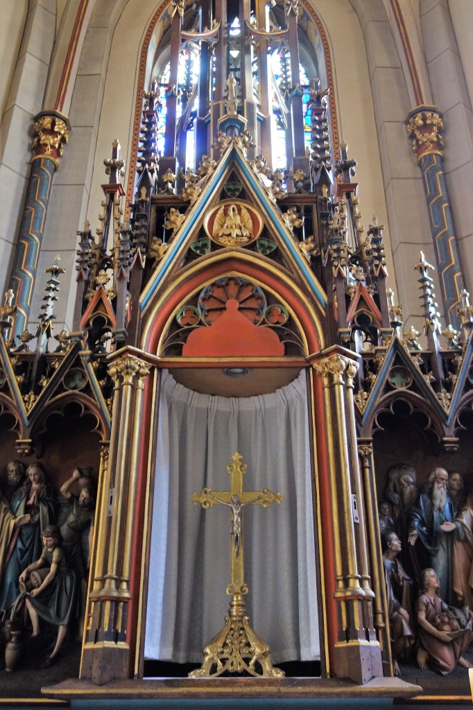 Auf den Opfertod Jesu deutet auch die Gestaltung des früheren Hochaltars hin, dessen Bildprogramm das Sakrament der Eucharistie in den Mittelpunkt stellt.