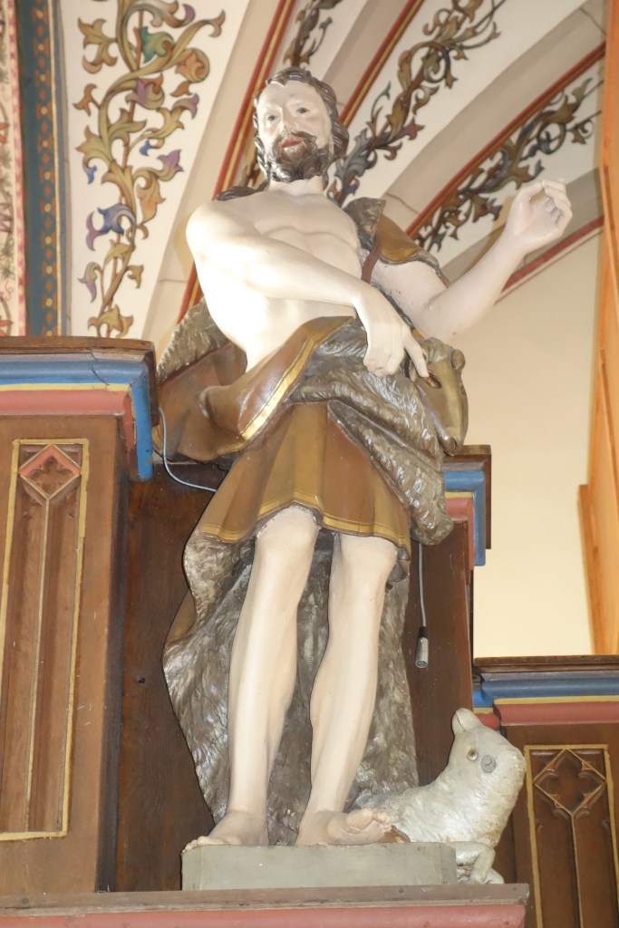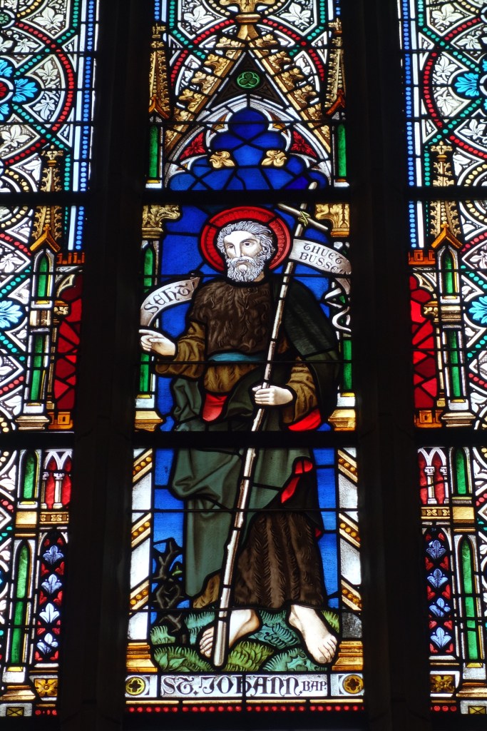 Das gegenüberliegende Fenster zeigt Johannes den Täufer mit einem Spruchband „Tuet Buße“ an einem Kreuzstab, das Bezug nimmt auf seine Rolle als Bußprediger in der Wüste.