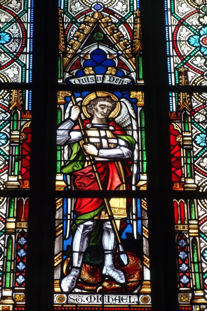 Die Erinnerung an die Schutzheiligen der Vorgängerkirche werden in Klein-Berßen wach gehalten. Der Erzengel Michael, eine Statue aus dem alten Bau, ist in einer gemauerten Nische des Kriegerdenkmals im Außenbereich der Kirche zu sehen. Der Drachen zu seinen Füßen symbolisiert das Böse, das der Erzengel besiegt hat. Die Waage in seiner rechten Hand deutet auf seine Rolle als Seelenwäger beim Jüngsten Gericht hin. Als Ritter mit Rüstung, Schild und Lanze ist er auch in einem der spitzbogigen Glasfenster der Südwand dargestellt.