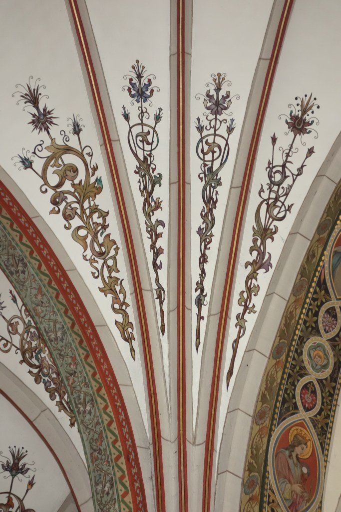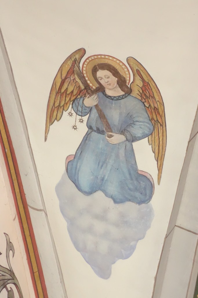 Vom Sterngewölbe des Chors blickt eine Schar von Engeln herab, die in ihren Händen Marterwerkzeuge tragen. Stilisierte Blüten der Passionsblume, deren Teile als Symbole der Leidenswerkzeuge gesehen wurden, schmücken die Langhauswände. Ihre Blätter und Ranken sind in den Gewölben dargestellt.
