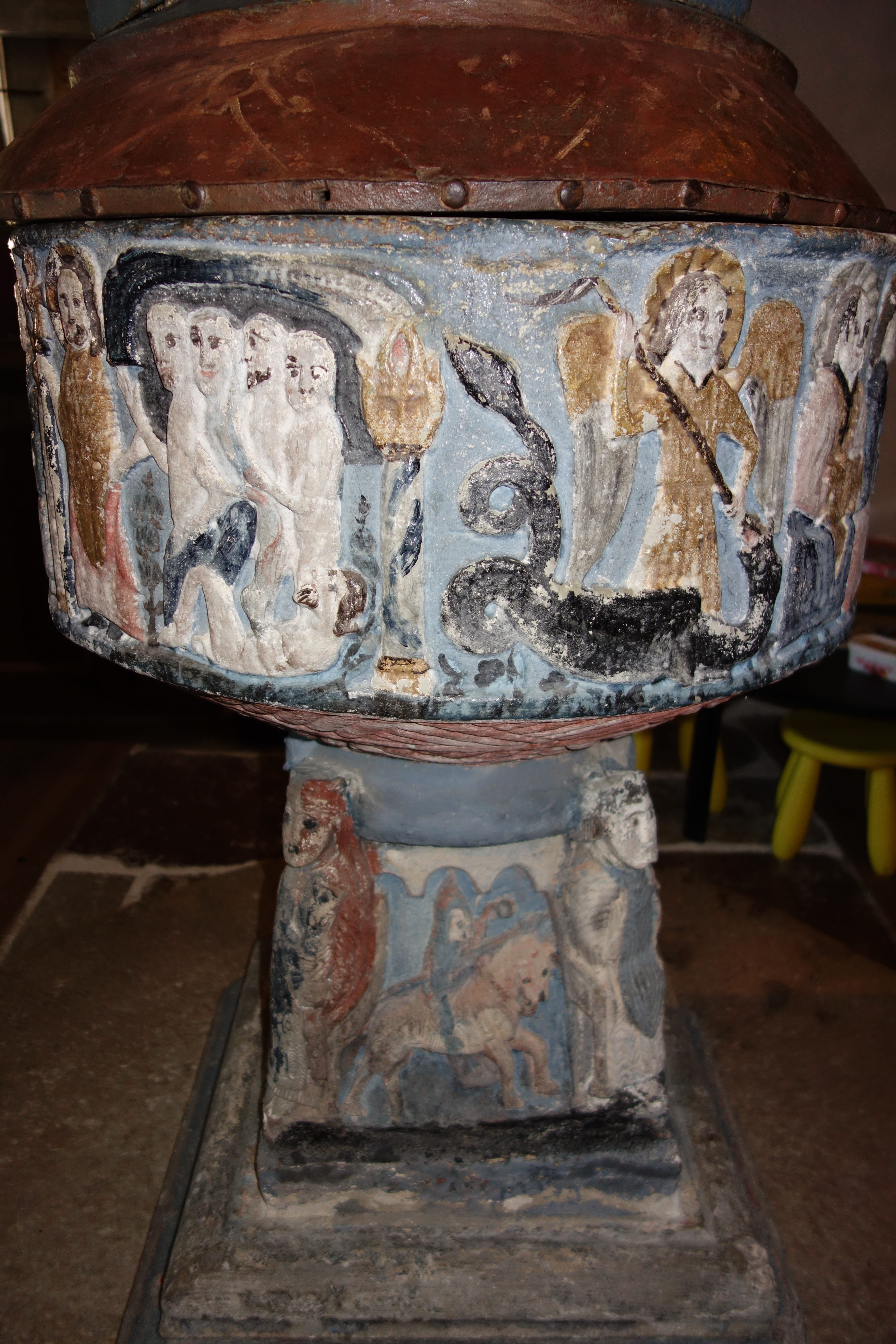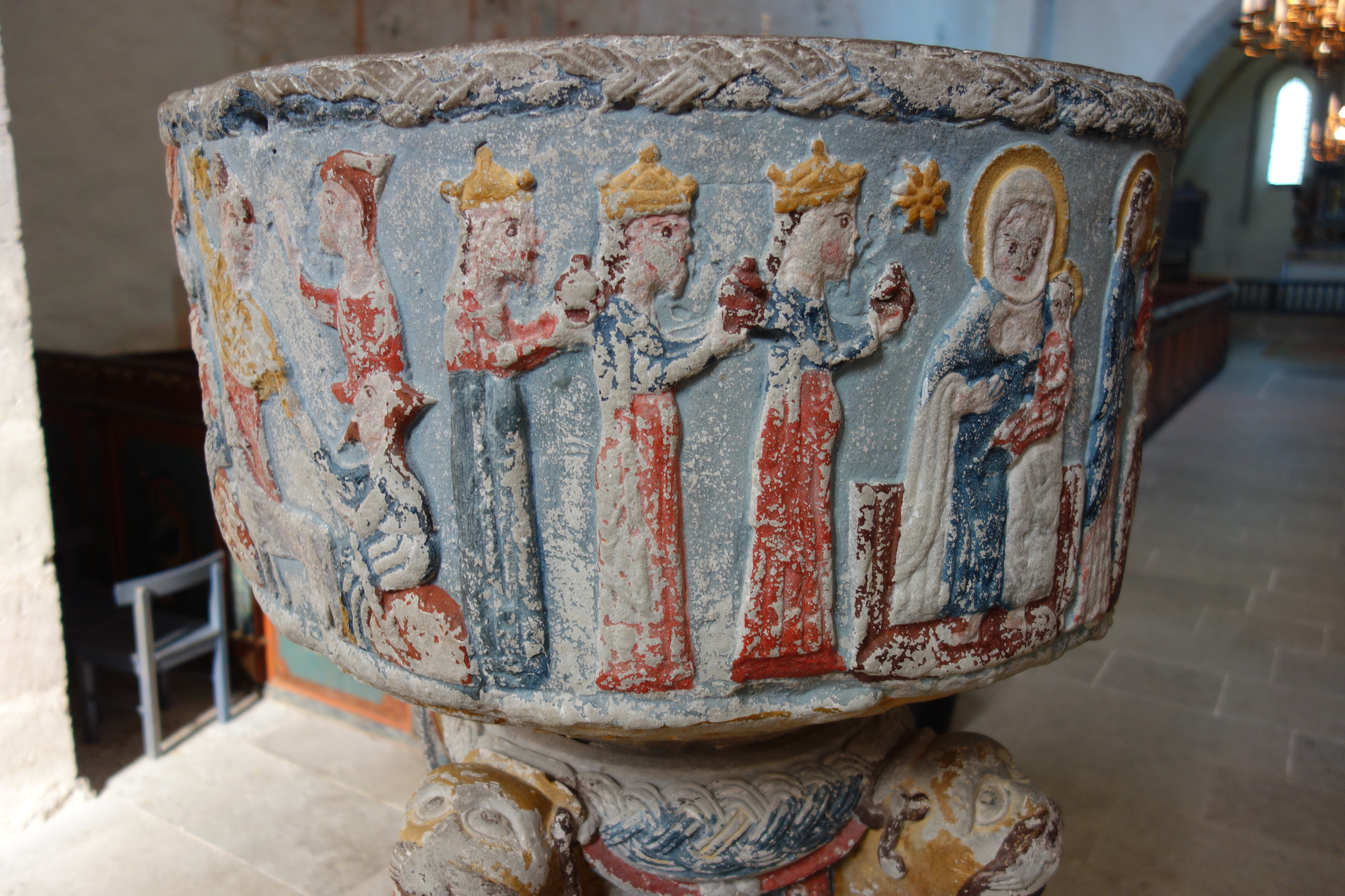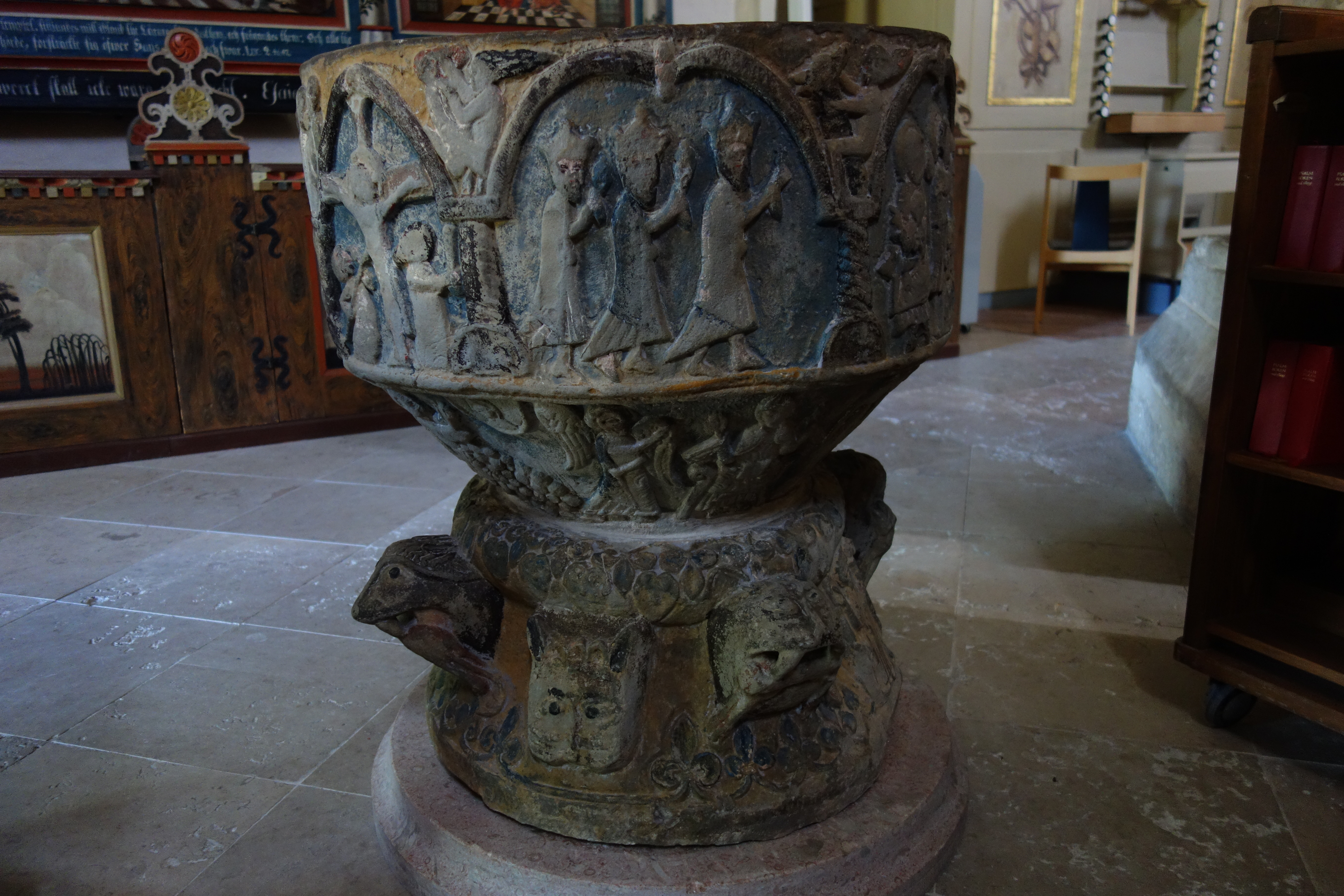 Auf die besondere Bedeutung der Taufe, bei der uns schon am Anfang unseres Lebens Gottes Gnade und die Vergebung der Sünden zugesprochen werden, weisen die vielen Taufsteine der Inselkirchen hin. Als wesentlicher Ausstattungsgegenstand stammen viele von ihnen bereits aus der Zeit der Gründung und Erbauungszeit der Kirchen. Von unbekannten Steinmetzen aus heimischem Kalk- oder Sandstein erschaffen, sind sie mit Ornamenten, Aposteln, Heiligenfiguren und biblischen Szenen dekoriert, deren Darstellung oft volkstümliche Züge trägt. Apropos eintauchen: in den Anfangszeiten des Christentums wurde der „ganze“ Täufling im Taufbecken eingetaucht.