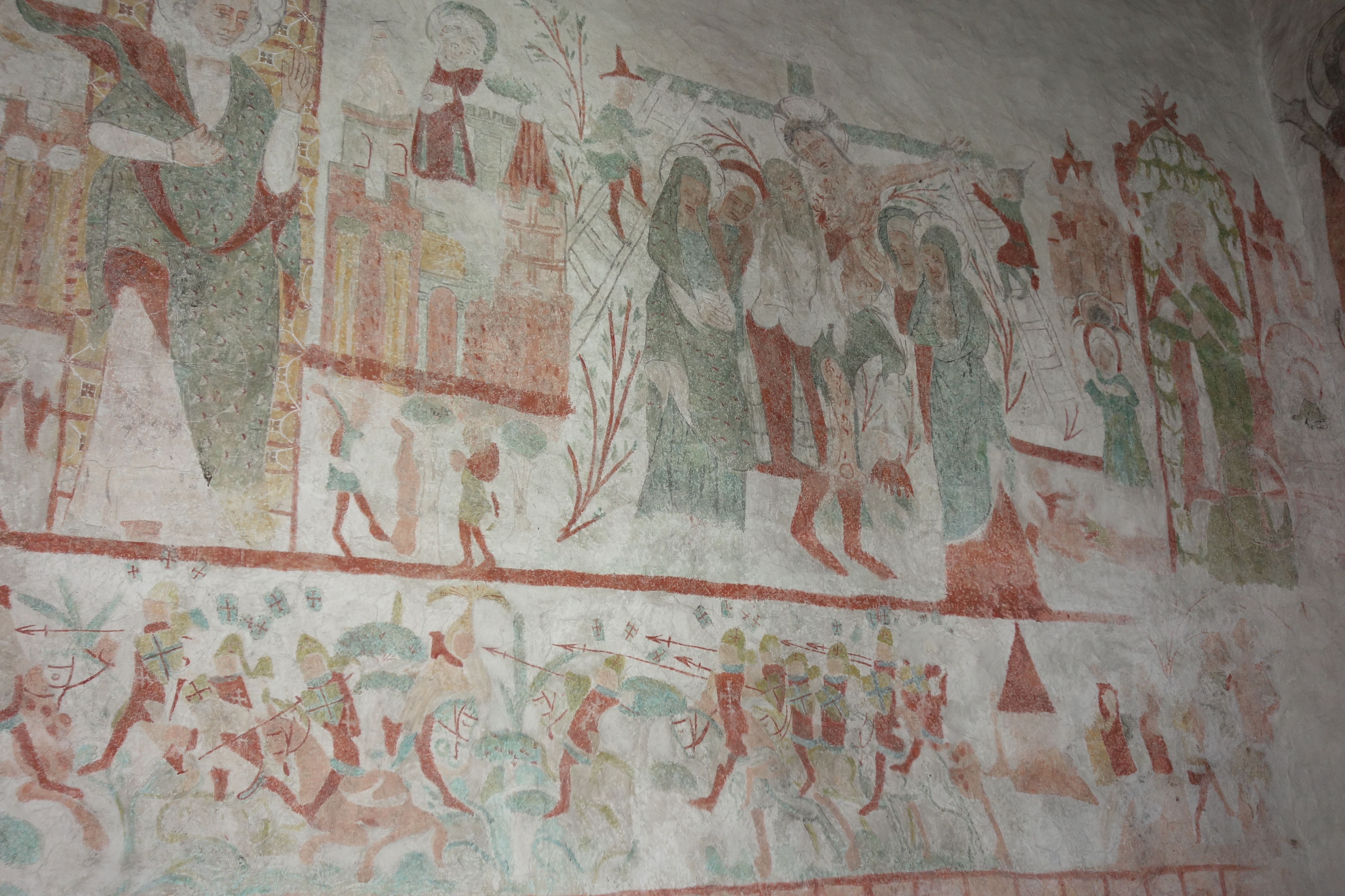 Das Bildprogramm der Steinplastik von Portalen und Taufsteinen setzt sich im Kirchenraum fort. Die hohen Wände und Gewölbe boten umfangreiche Flächen für Ausmalungen, die den Besucher noch heute in eine illustrierte Glaubenswelt versetzen. Die Malereien erfüllten didaktische, gelegentlich rein „unterhaltende“ Funktionen oder dienten schlichtweg zur Dekoration. Die Kirche in Masterby ist eine derjenigen, in denen ein großer Teil der Ausmalung erhalten ist.