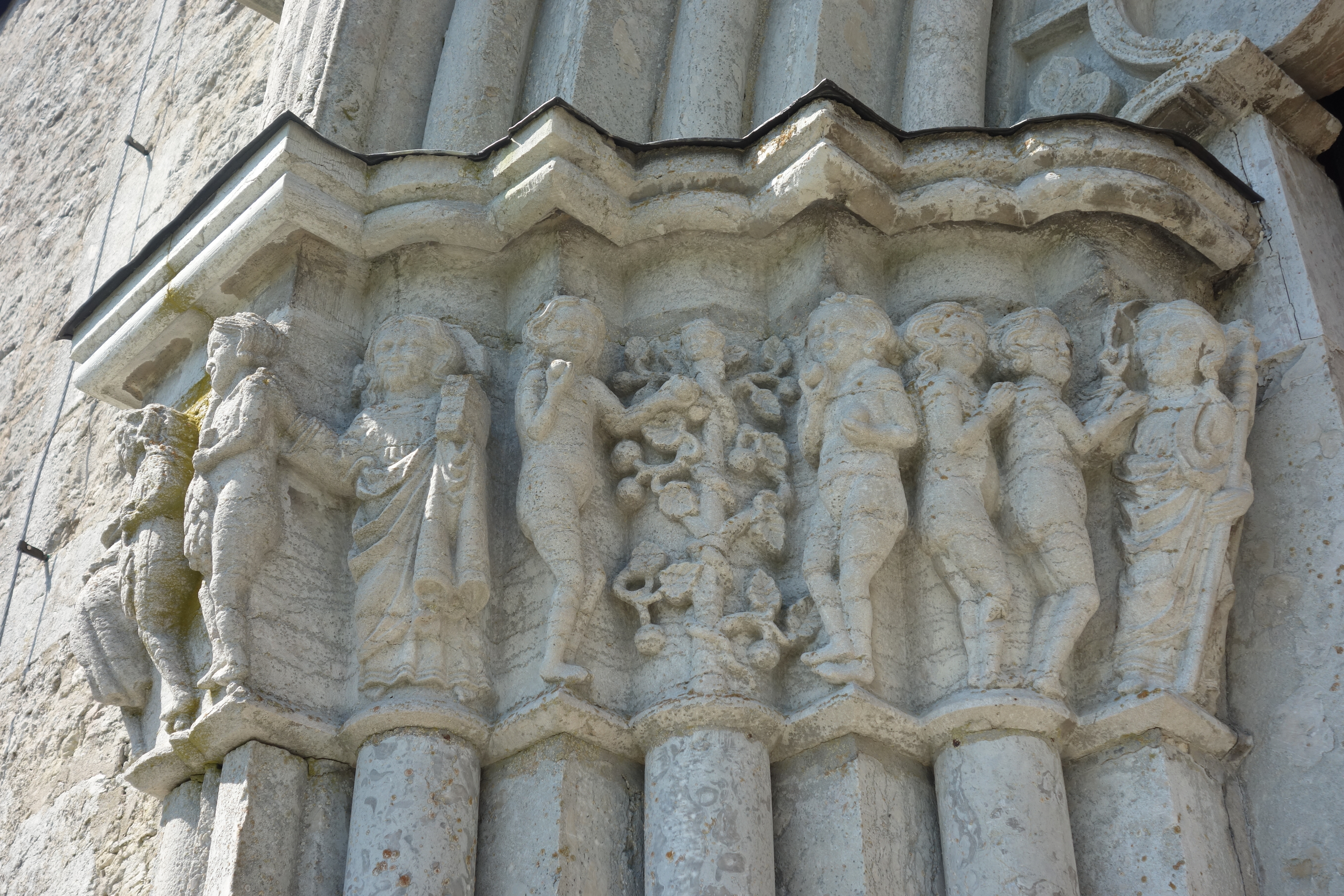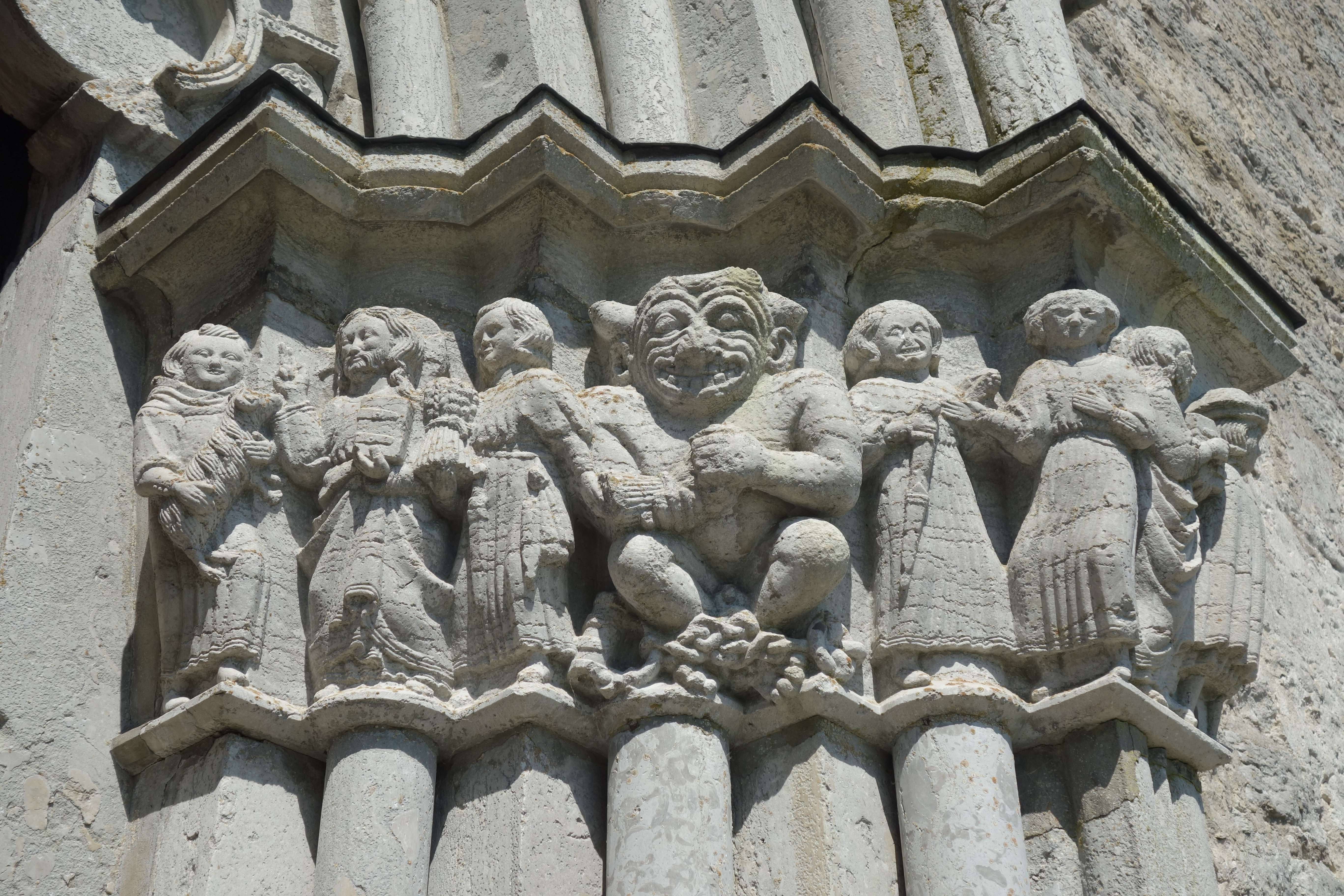 Am Langhausportal in Gammelgarn werden dem Eintretenden gleich zwei biblische Schlüsselszenen vor Augen geführt. Neben dem Sündenfall Adam und Evas mit der Vertreibung aus dem Paradies ist hier der Brudermord des Kain dargestellt. Die personifizierte Sünde in Gestalt eines Dämons mit weit aufgerissenen Mund (dem allerdings Ketten angelegt sind) sticht besonders hervor.
