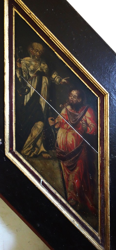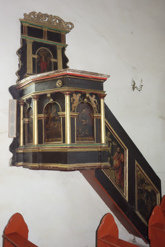 Im Innenraum der kleinen Saalkirche sind viele Teile der Vorkriegsausstattung erhalten. Die Brüstung der Orgelempore zeigt auf zwölf Feldern gemalte Bildnisse von biblischen Propheten. Die ihnen zugeordneten Bibelsprüche in der Unterschrift waren bis vor einigen Jahren noch von kleinen Tafeln mit den polnischen Namen der Propheten abgedeckt. Die rechte obere Aufnahme stammt aus dem Jahr 2017. Vier Jahre später waren die deutschen Inschriften freigelegt worden. In der Mitte der Brüstung findet sich ein Schriftzug mit der Jahreszahl 1686 und der Widmung „Der Knechte Freigebigkeit“ als Hinweis auf großzügige Stifter.