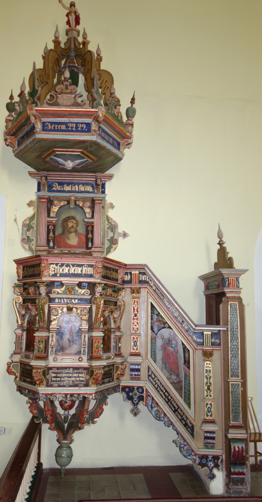 Ein verändertes Glaubensverständnis, das allein die Schrift zur Grundlage hat, zeigt die mit reichhaltiger Schnitzornamentik gestaltete Kanzel aus „evangelischer Zeit“. Der Ort der Verkündigung des Wortes ist hier zugleich selbst mit Bibeltexten versehen. Unter den Bildnissen der vier Evangelisten finden sich ausgewählte Verse aus den jeweiligen Evangelien. Bänder mit Bibelsprüchen laufen entlang des Aufgangs, während man sich beim Schalldeckel aus Platzgründen auf die Angabe einzelner Textstellen beschränkt hat.