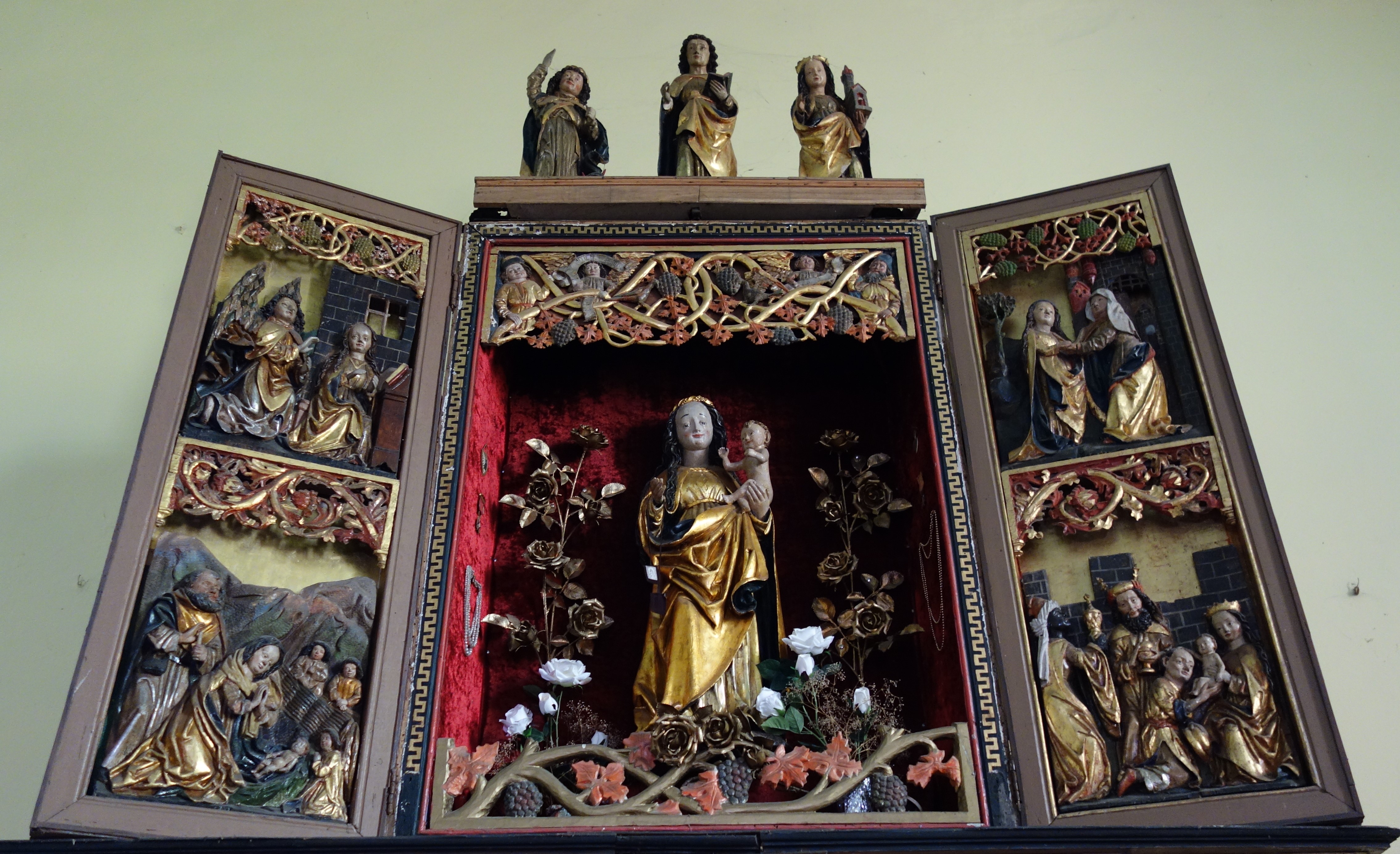 Die künstlerische Gestaltung des Altars veranschaulicht die Bedeutung der Marien- und Heiligenverehrung in der Zeit vor der Reformation. Der Mittelschrein, bekrönt von drei Heiligenfiguren (Georg, Barbara, Johannes der Evangelist), zeigt die Muttergottes mit dem Kind, umrahmt von Weinlaub und Reben. Auf alten Aufnahmen sind an ihren Seiten noch Figuren der Apostel Petrus und Paulus dokumentiert. In polnischer Zeit wurden diese entfernt und durch künstliche Rosen ersetzt, Symbol für die Jungfrau Maria. Die Schnitzarbeiten der Seitenflügel stellen Szenen aus dem Leben Marias dar, ebenso wie die Gemälde auf den Rückseiten.