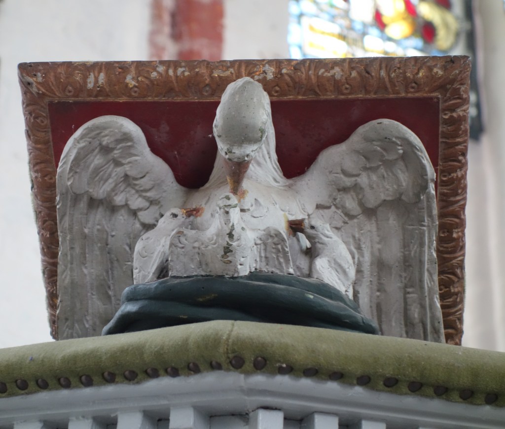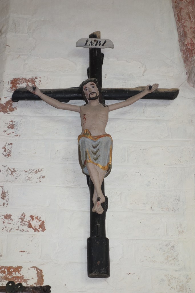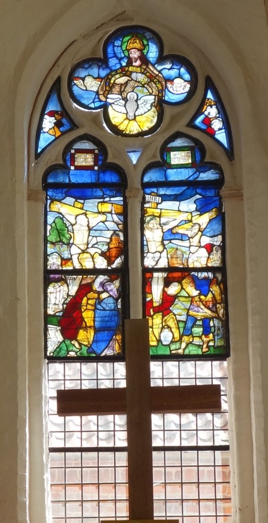 Im lichtdurchfluteten Chor finden sich mehrere Darstellungen des Gekreuzigten. Eine Glasmalerei im mittleren Chorfenster hinter dem Altar zeigt eine Kreuzigungsszene. Direkt darüber, in einem Maßwerkelement im Bogenfeld des Fensters, sind Gottvater und der Heilige Geist in der Gestalt einer Taube abgebildet. Aus dem 14. Jahrhundert stammt ein Kruzifix auf einem Astkreuz. Auch der Pelikan, der seine Jungen scheinbar mit seinem Blut nährt, ist ein Christussymbol. Er gilt als Sinnbild einer sich selbst aufopfernden Liebe. Die aus Holz geschnitzte Figur stützt das Pult der Kanzel. Die Darstellungen des Leidens Jesu Christi mögen den Kranken Zuversicht und Hoffnung auf ein besseres Leben nach dem Tod gegeben haben.