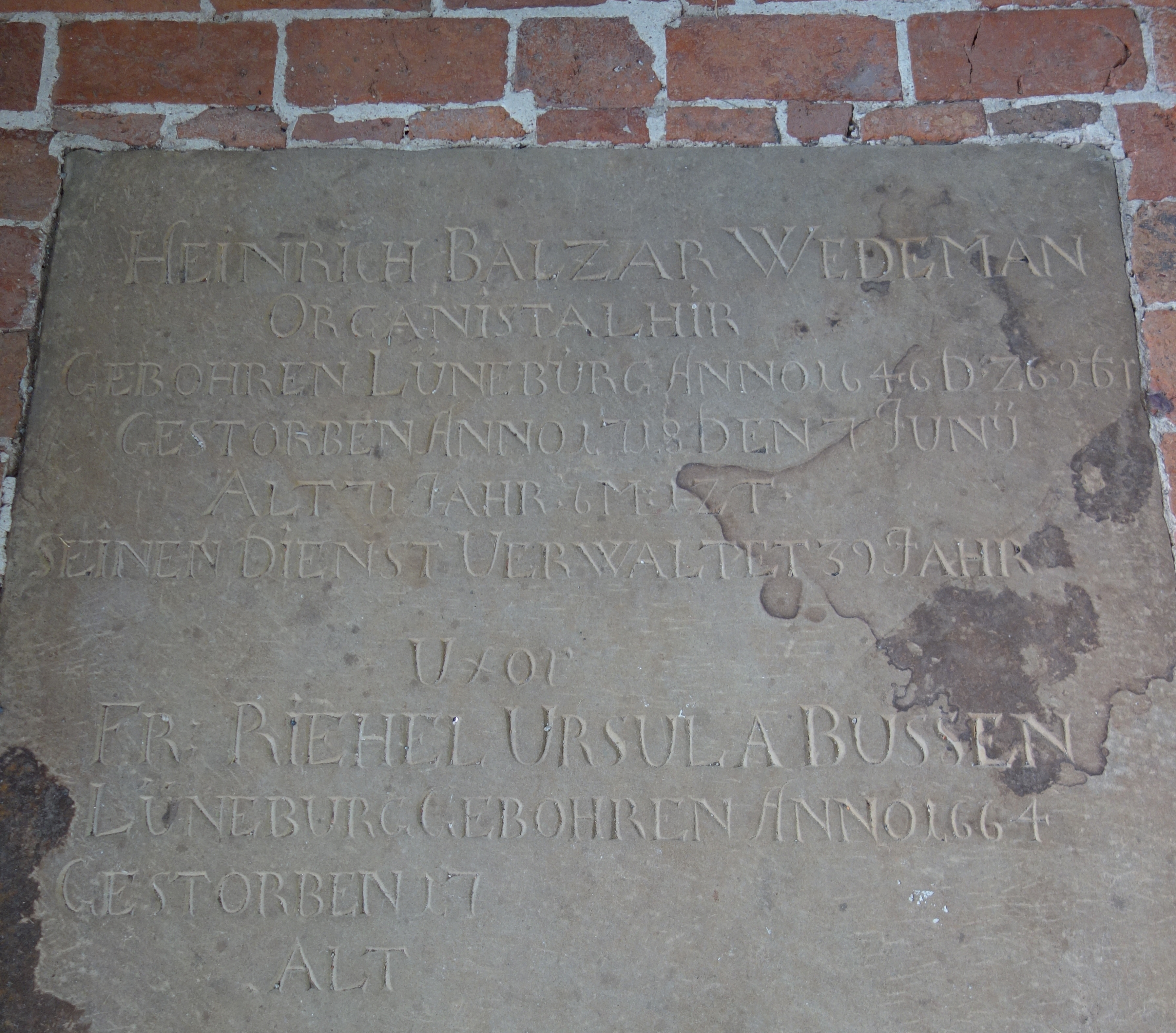 Anderen „wichtigen“ Personen war es sogar vergönnt, in der Kirche bestattet zu werden. Der Organist Heinrich Balzar Wedemann, der „seinen Dienst verwaltet 39 Jahr“, ist hier an der Seite seiner Ehefrau beigesetzt. Mehrere Grabplatten im Fußboden nennen die Namen von Pastoren, die an der Nikolaikirche gewirkt haben. Einer von ihnen, Gregorius Blechs, war Conrektor und Rektor an der Michaelisschule in Lüneburg gewesen, bevor er Pastor in St. Nicolai wurde. Zehneinhalb Jahre nach Amtsantritt ist er im Jahr 1694 „selig entschlafen“. Vielleicht musste schon er, auf der Kanzel stehend, die Uhr im Auge haben, um bei der Predigt im Zeitlimit zu bleiben…