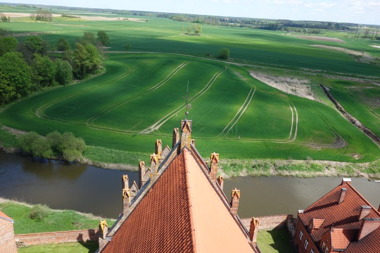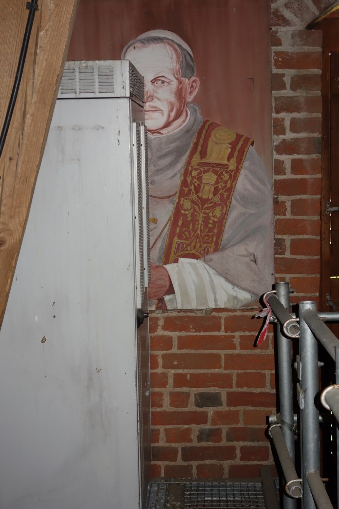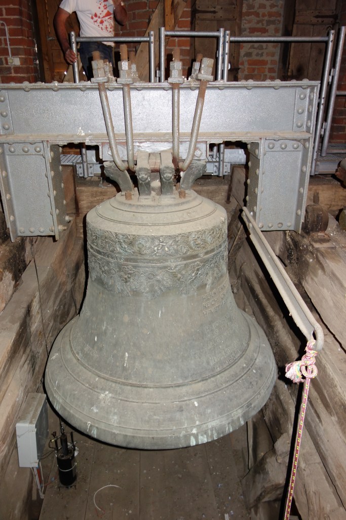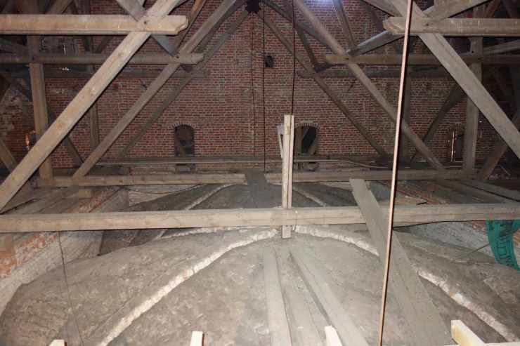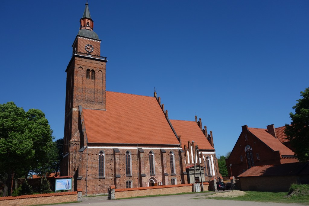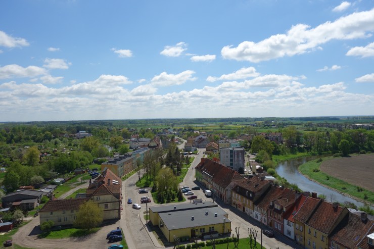 Das ist das Zifferblatt der Kirchturmuhr von Schippenbeil, einer kleinen Stadt im Norden Polens. Die Gelegenheit, einen Kirchturm zu besteigen, direkt unter dem großen Zifferblatt zu stehen und dabei den Glockenstuhl und das Gewölbe von „oben“ zu sehen, bietet sich nicht alle Tage. Trotz meiner Höhenangst konnte ich im Frühjahr 2017 eine spontane Turmbesteigung nicht ablehnen, zu der mich ein junger Mann einlud, der mit Maurerarbeiten am Pfarrhaus beschäftigt war.