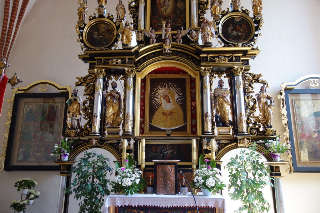 Blickfang im Chor ist der dreistöckige Hochaltar, der die Jahreszahl 1670 in der Bekrönung trägt. Umrahmt von reichhaltigen ornamentalen Schnitzereien und Putten finden sich im mittleren Geschoss Skulpturen der vier Evangelisten. Gemälde in den Mittelfeldern und den zwei seitlichen Medaillons stellen Szenen aus dem Leben Jesu dar. Das Madonnengemälde im Mittelpunkt wurde in polnischer Zeit eingefügt.