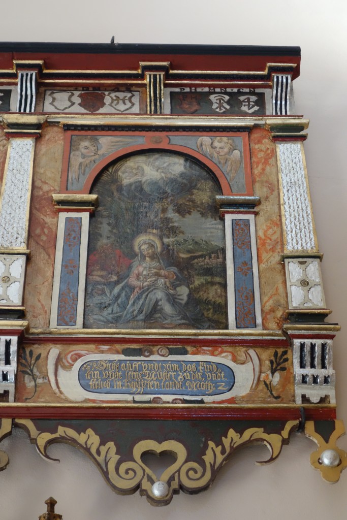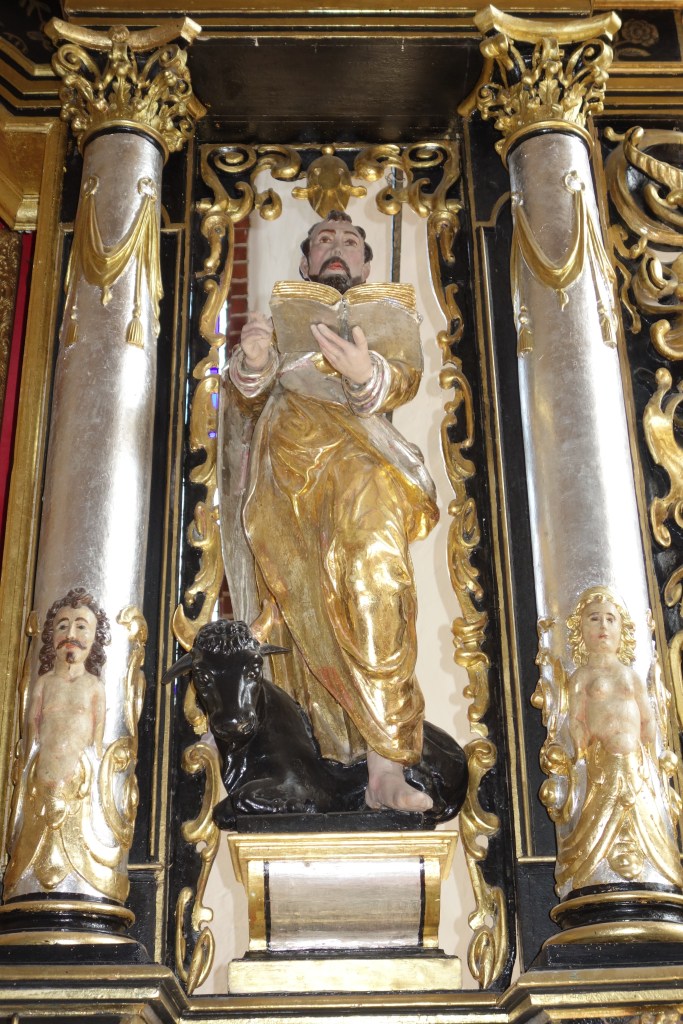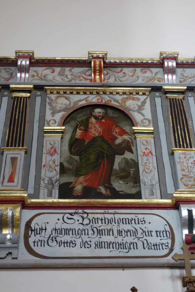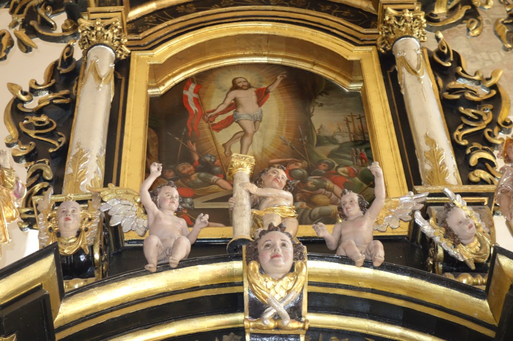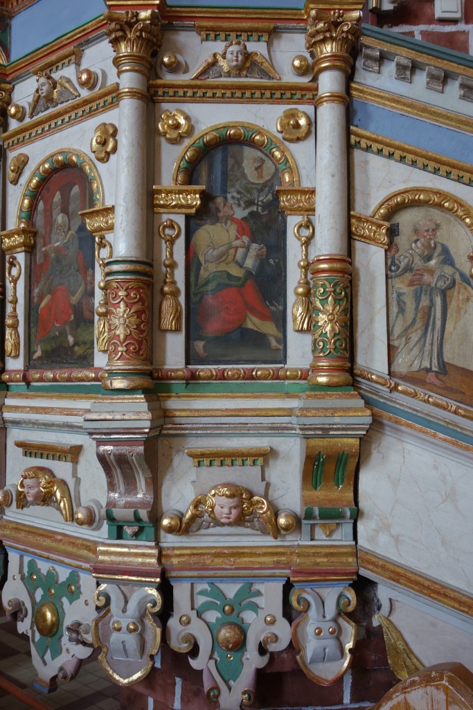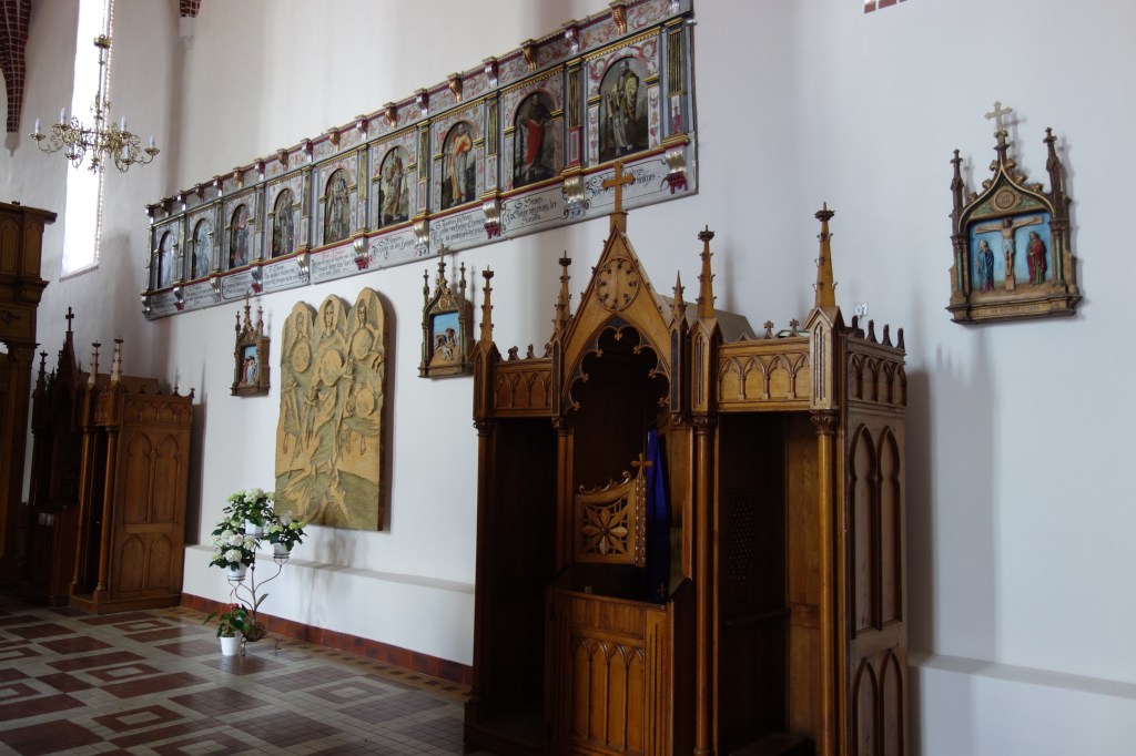 Auch die Kanzel und Teile früherer Emporenbrüstungen wurden restauriert. Als zeitlose bildliche Zeugnisse unseres Glauben schmücken sie wie schon seit Jahrhunderten auch den heutigen Kirchenraum aus. Ihre einfachen Gemälde stellen die Apostel, Evangelisten und biblische Szenen dar. Die Brüstung an der nördlichen Wand des Kirchenschiffs zeigt unterhalb der Apostel die Verse des Glaubensbekenntnisses. Wahrscheinlich kann kaum einer der polnischen Kirchgänger den deutschen Text in der alten Schrifttype lesen. Immerhin hat das dekorative Element einen würdigen Platz gefunden. Es ist direkt oberhalb der beiden Beichtstühle angebracht.