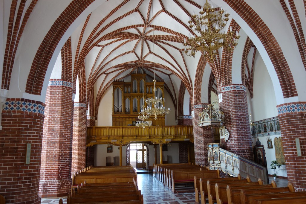 Der Innenraum der Hallenkirche, in polnischer Zeit renoviert, wird durch die kräftigen Pfeiler und durch achtzackige Sterngewölbe geprägt. Von der früheren Innenausstattung, meistenteils Schnitzarbeiten des 17. und 18. Jahrhunderts, sind einige Teile erhalten.
