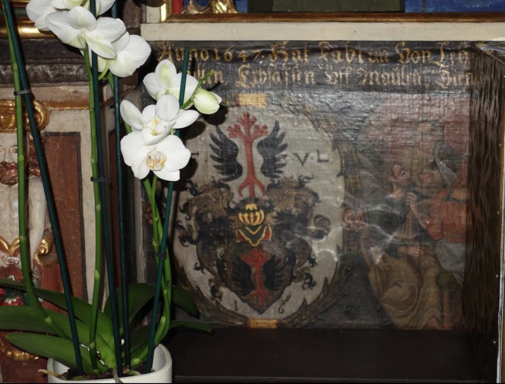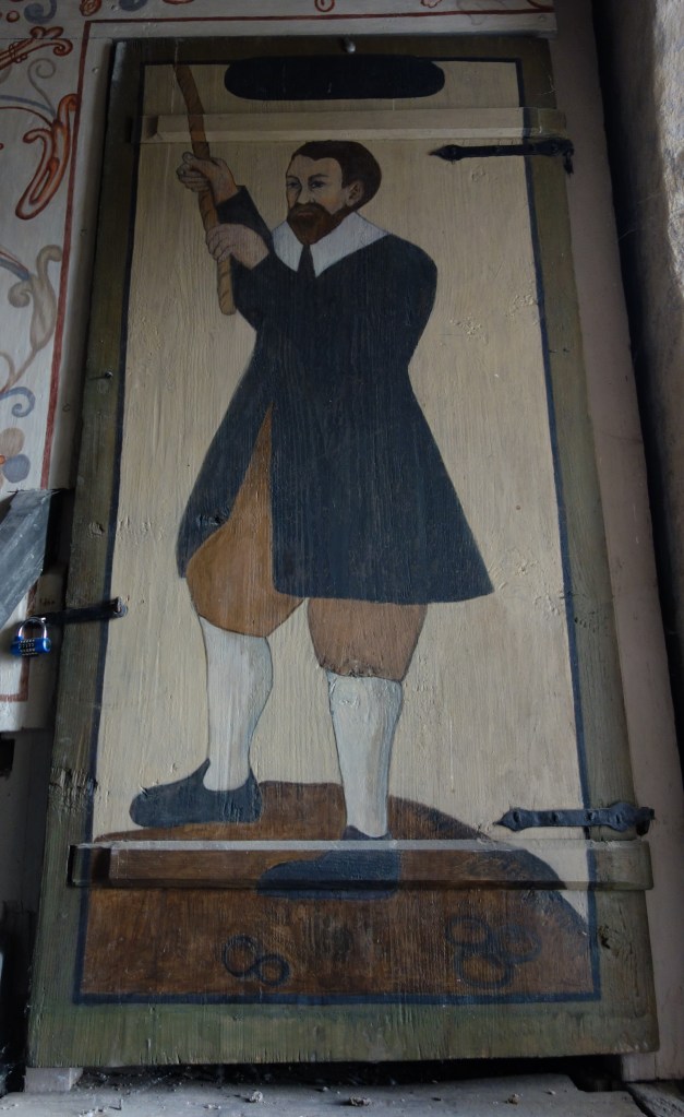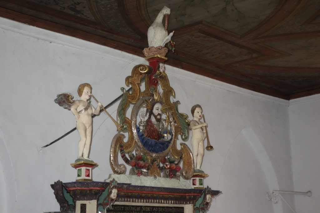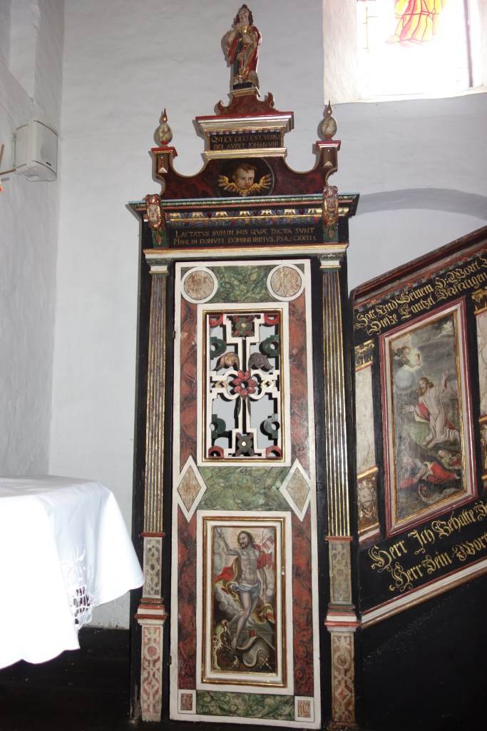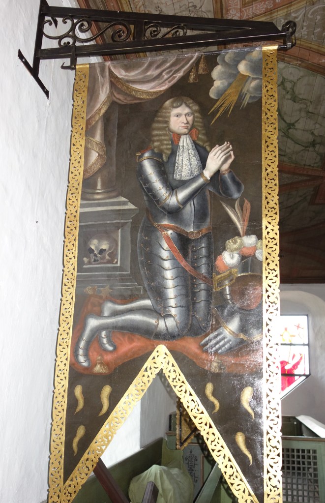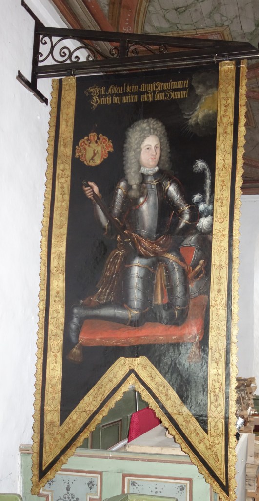 Einzigartig finde ich zwei Totenfahnen aus bemaltem Kupferblech, die zum Gedächtnis an Johann von Sternberg (gest. 1686) und Justus Bernhard von Wilmsdorff (gest. 1711) über der Empore aufgehängt wurden. Aber auch „normale“ Personen hatten wichtige Aufgaben in der Gemeinde, wie zum Beispiel der Glöckner, der mit dem Seil in der Hand in der Turmhalle abgebildet ist. In der Eingangshalle ist eine Glocke aufgestellt, die 1862 in Königsberg umgegossen wurde. Ihre Inschrift gibt Auskünfte über die damaligen Pfarrer und Kirchenvorstände.