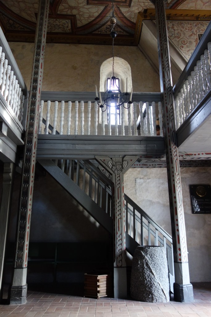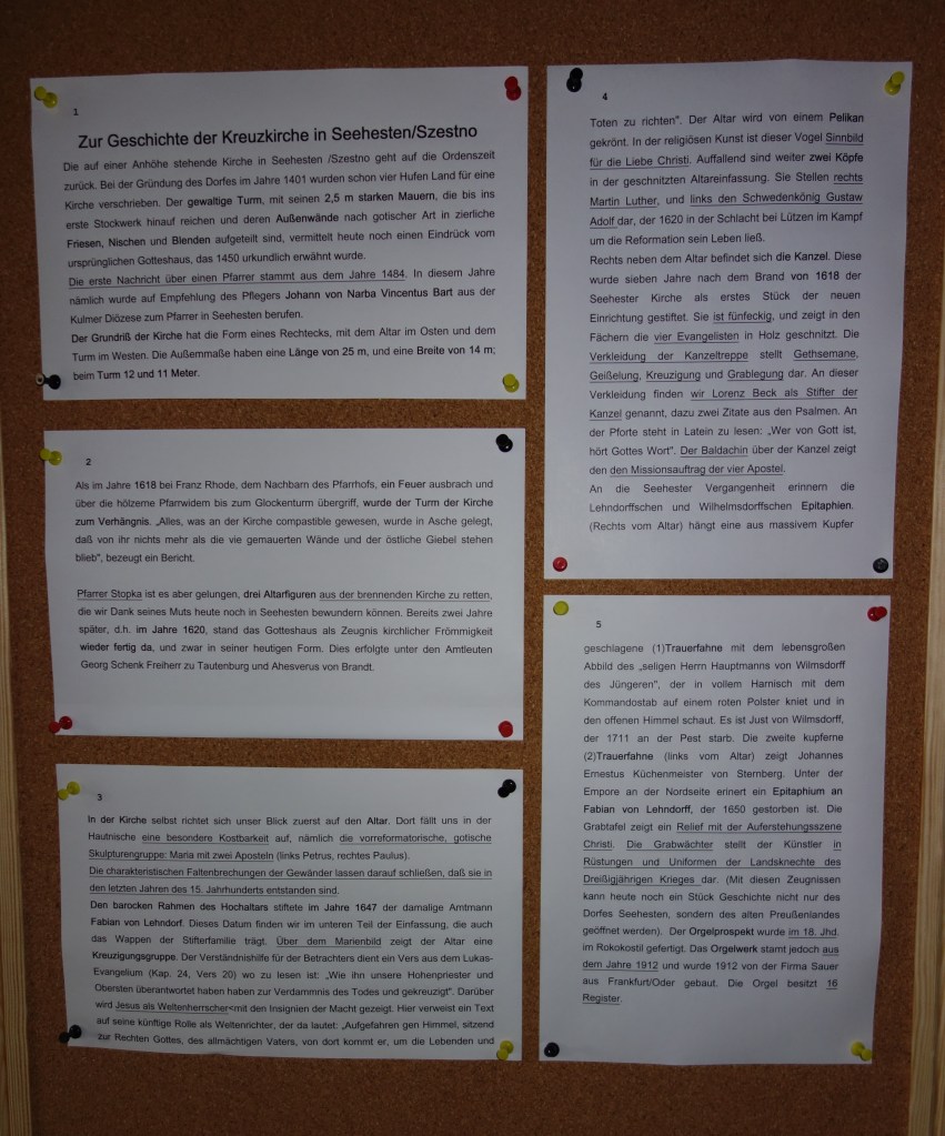 Im Mai 2018 hatte ich Glück. Nach einer Messe für Erstkommunionkinder führte mich Pfarrer Darius Lesniak im polnischen Szęstno höchstpersönlich durch seine Kirche. Die bis 1945 evangelische Kirche im früheren Seehesten in Ostpreußen hat vieles von ihrer Ausstattung aus einer jahrhundertealten Geschichte bewahrt. Lesniak selbst hat eine detaillierte Beschreibung der Kirche in deutscher Sprache verfasst, die – befestigt mit schwarz-rot-gelben Nadeln an einer Pinwand – in der Turmhalle zu lesen ist.