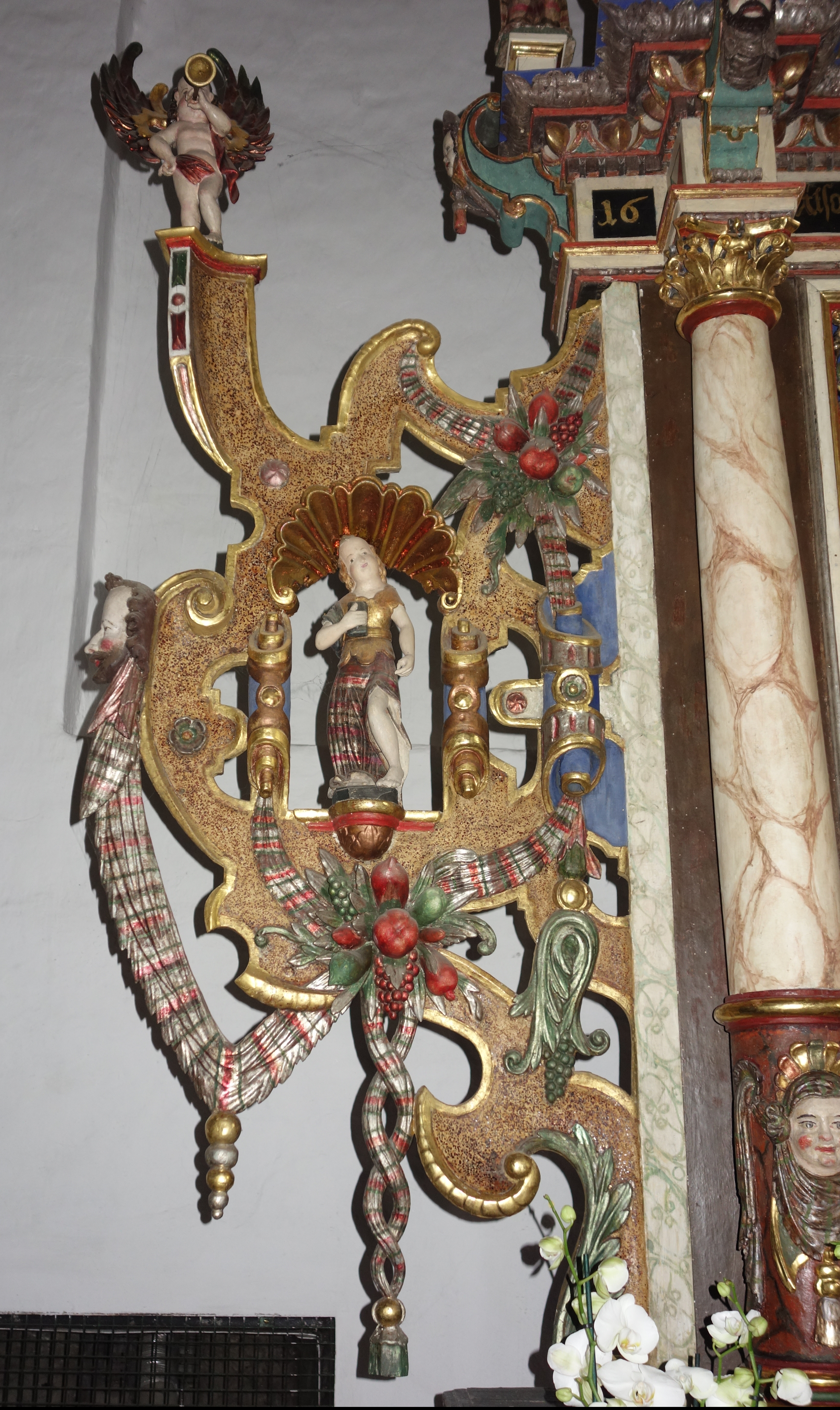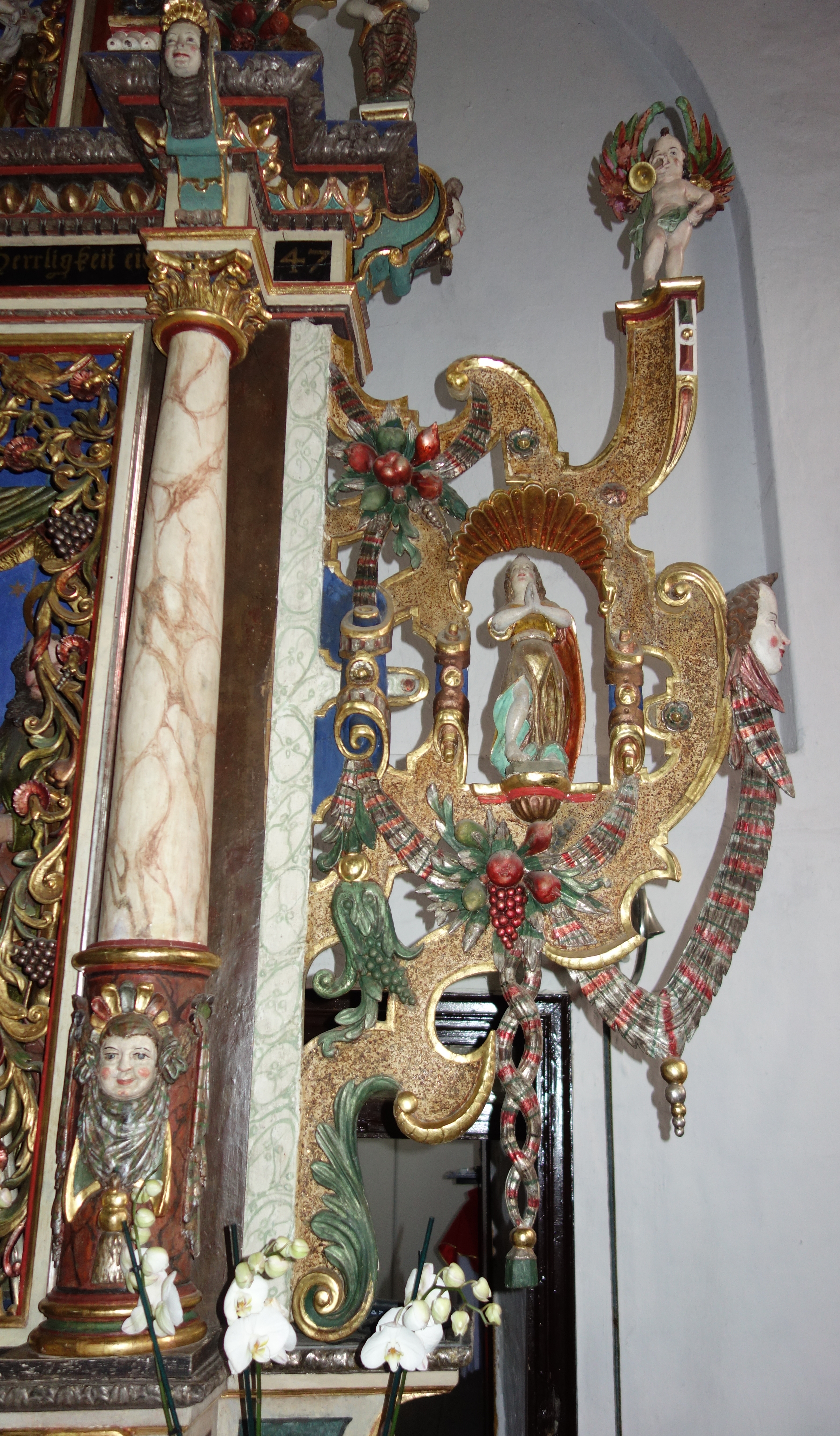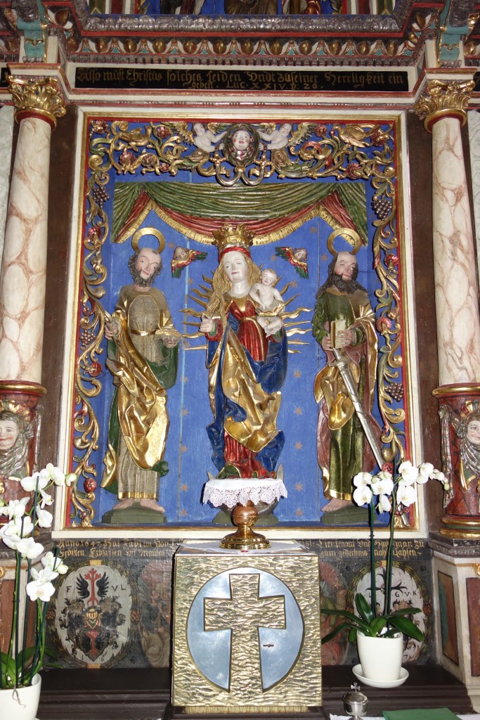 Die Marienskulptur im Zentrum des Altaraufsatzes ist dagegen eher untypisch für eine – bis 1945 – protestantische Kirche. Die Gottesmutter mit dem Kind ist auf einer Mondsichel stehend abgebildet. Sie ist umgeben von einem nur teilweise erhaltenen Strahlenkranz. Die Apostel Petrus und Paulus, zu erkennen an ihren Attributen Schlüssel und Schwert, stehen an ihrer Seite. Die drei Schnitzfiguren stammen aus einem älteren Altar aus der Zeit vor der Reformation. Bei einem Brand der Kirche Anfang des 17. Jahrhunderts wurden sie gerettet und später in den neuen Altar eingefügt.
