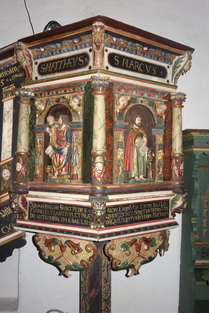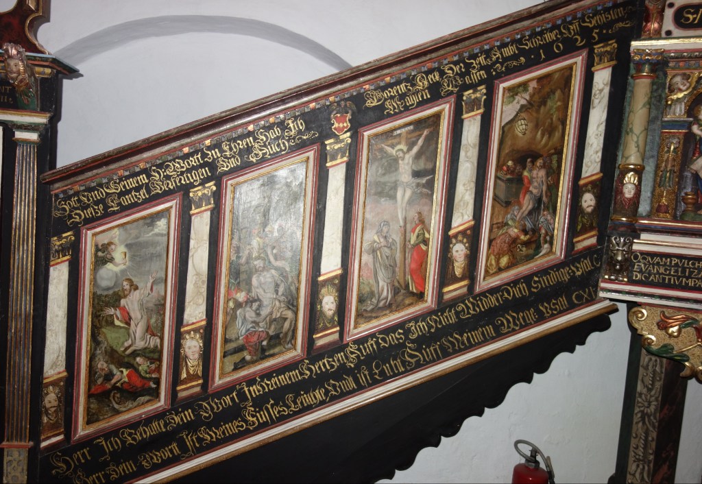Die Gestaltung der Kanzel setzt mit Gemälden an der Tür und der Treppenbrüstung die Reihe von christologischen Darstellungen fort. Während hier Szenen aus der Passionsgeschichte abgebildet sind, ist der Kanzelkorb mit Reliefs der Evangelisten verziert. Lorenz Beck, seines Zeichens Amtsschreiber von Seehesten, hat die Kanzel im Jahr 1625 gestiftet, wie eine Inschrift am Kanzelaufgang erwähnt.