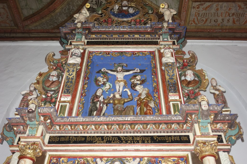 Jesus Christus steht im Mittelpunkt des Bildprogramms der Ausstattungsgegenstände. Ein Pelikan, der ein Junges scheinbar mit seinem Blut nährt – Symbol für Christus und seinen Opfertod – bekrönt den Schnitzaltar aus dem 17. Jahrhundert. Reliefartige Darstellungen zeigen im Gesprenge Christus als Weltenherrscher und eine Kreuzigungsszene im oberen Bildfeld des Retabels. In den seitlichen Schnitzereien sind nach den Erklärungen von Pfarrer Lesniak die Häupter von König Gustav Adolf von Schweden und Martin Luther zu erkennen.