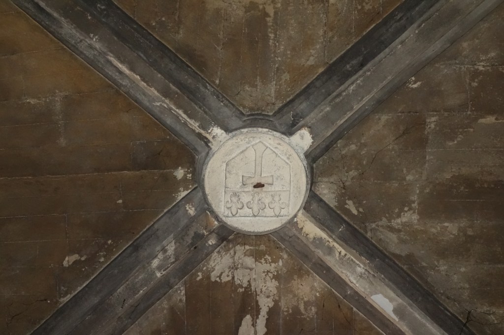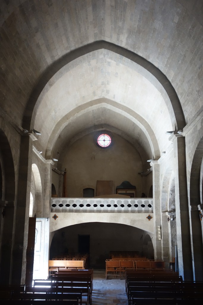 Durch die wenigen kleinen Fenster der Außenmauern dringt nur wenig Tageslicht in den Kirchenraum. Das Mittelschiff, der aus dem 12. Jahrhundert stammende älteste Gebäudeteil, ist von einer Spitztonne überwölbt. Das Gewölbejoch vor der Chorapsis im Westen wird von einer Kuppel gebildet, der der Glockenturm aufsitzt.