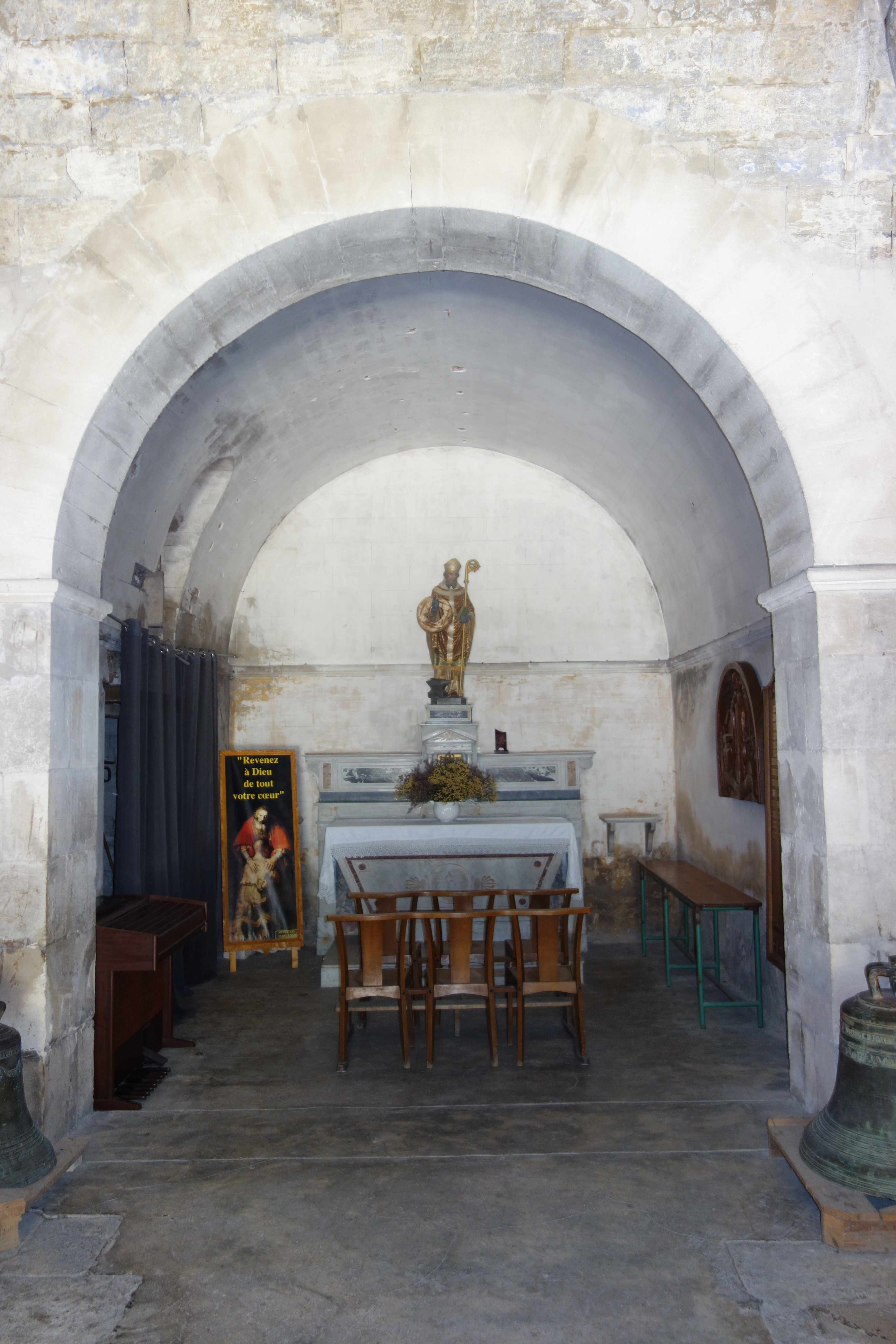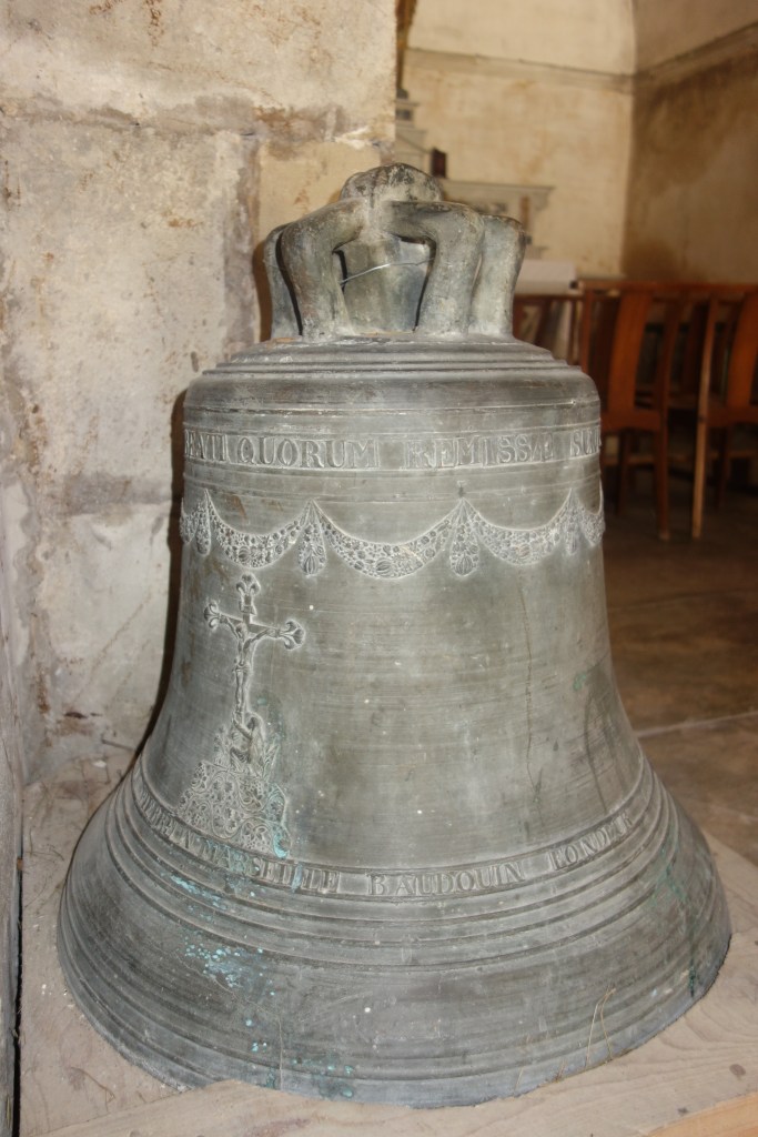 Diese lateinische Inschrift, ein Vers aus einem der „Bußpsalmen“, ist am Hals einer der beiden Glocken, die im Innenraum aufgestellt sind, eingraviert. Möglicherweise wurde der Text von zwei Angehörigen der „Weißen Büßer“ (französ. „pénitents blancs“) vorgegeben, deren Namen im unteren Teil der Glocke genannt werden. Sie könnten beim Guss als Auftraggeber und Sponsoren eine Rolle gespielt haben. Die katholische Bruderschaft, die ihren Sitz in Montpellier hat, verfügte über eine Kapelle in Noves, die noch heute existiert. Auch der Namenszug der in Marseille ansässigen Firma Baudouin ist auf der Oberfläche der Glocken zu lesen. Dort wurden sie im Jahr 1822 gegossen.