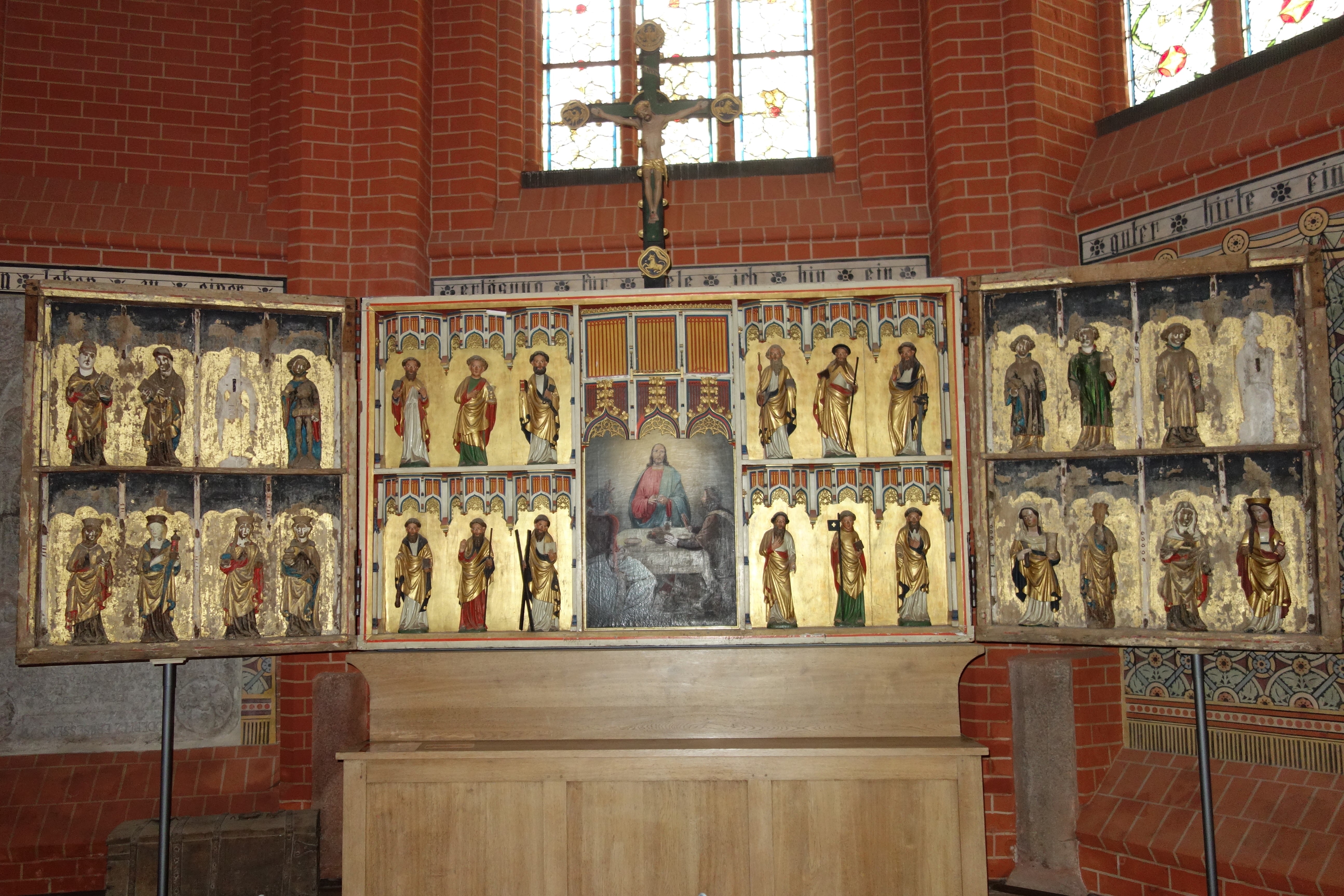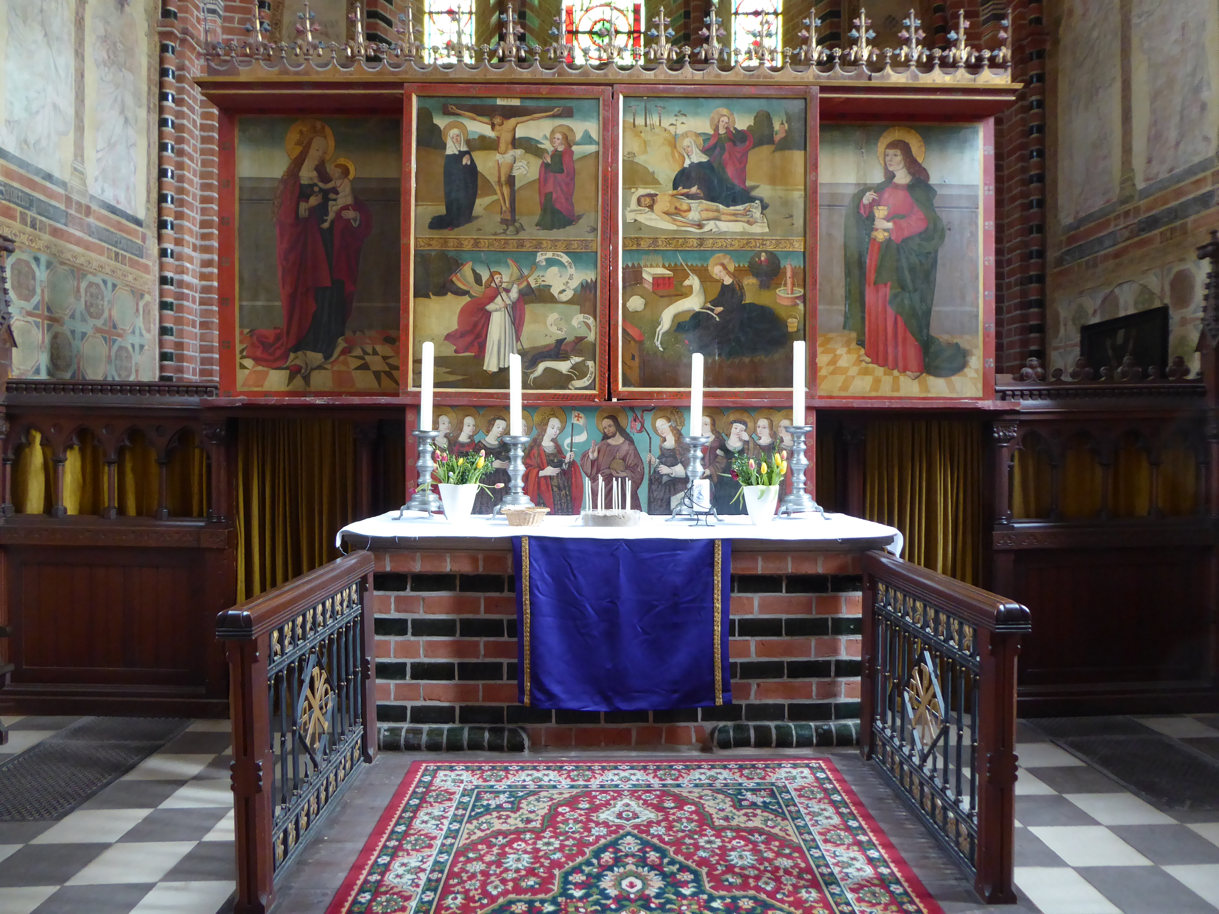 Die Bedeutung der mittelalterlichen Marienverehrung veranschaulicht auch das Altarretabel aus der Zeit um 1500. Seine geöffnete „Festtagsseite“ zeigt inmitten einer Vielzahl von geschnitzten Heiligenfiguren eine Madonna im Strahlenkranz. Die Gemälde der beiden Wandlungen haben Szenen aus dem Leben Marias zum Inhalt.