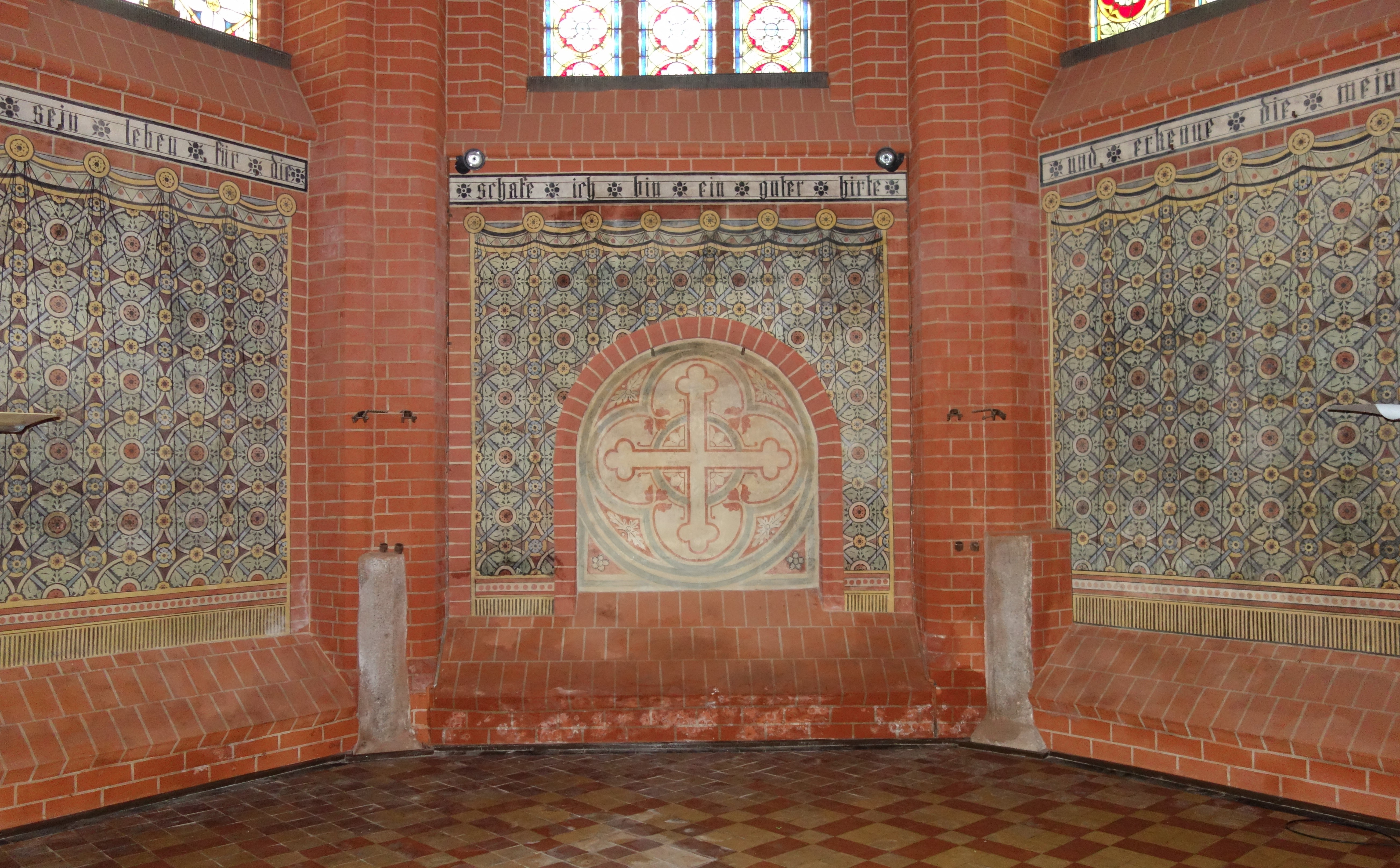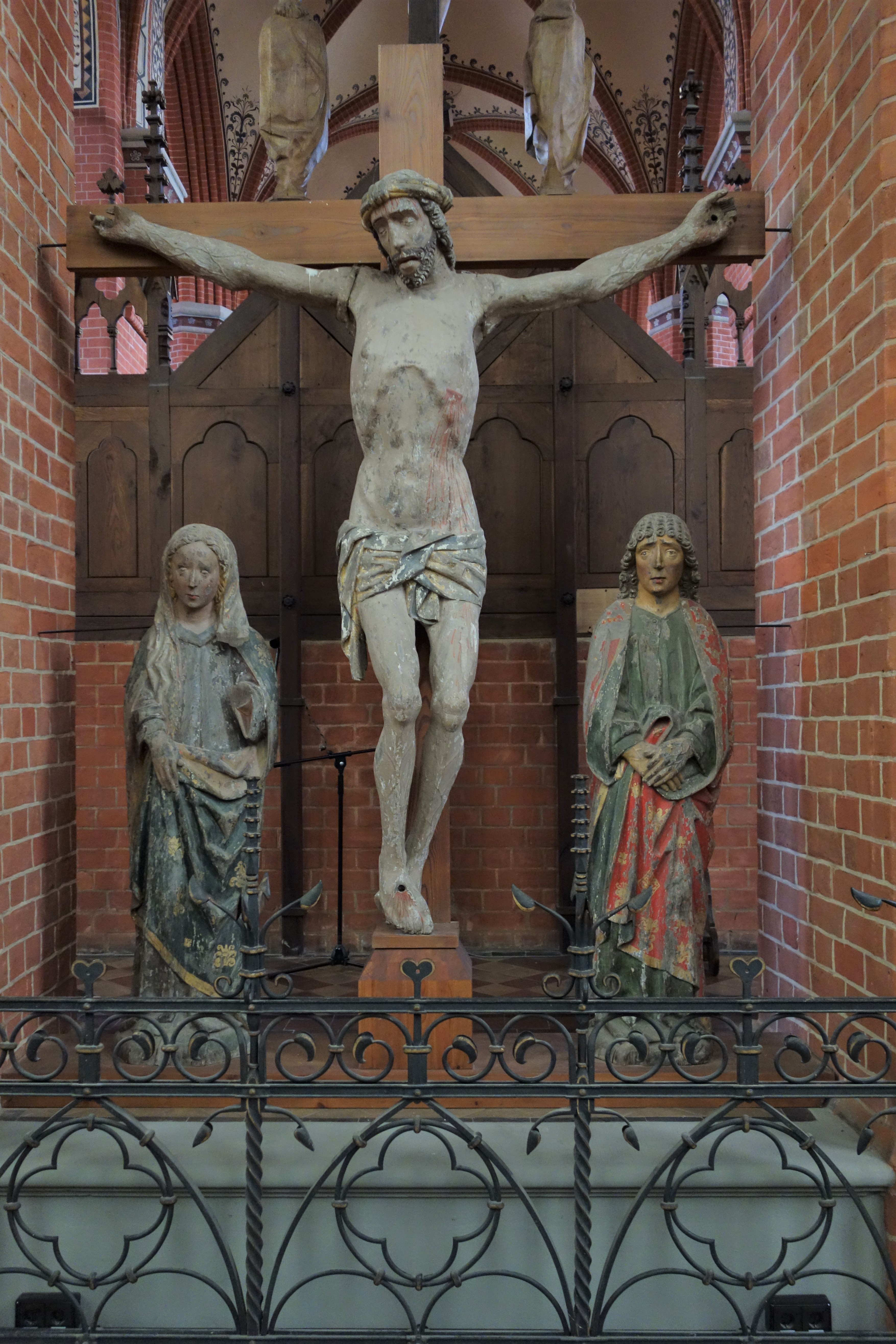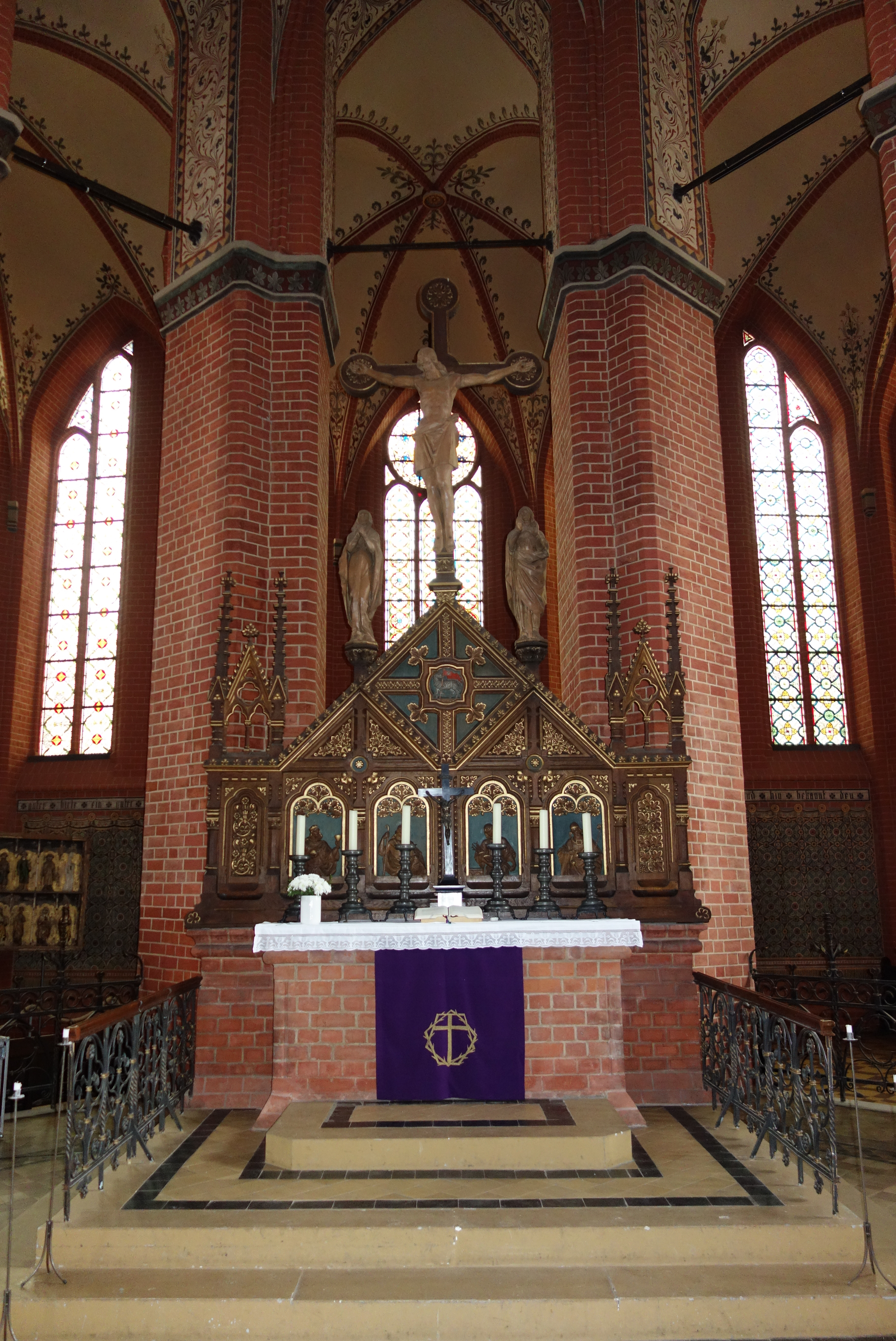 Im 17. Jahrhundert wurden für das Retabel des früheren Hauptaltars, das jetzt im Chorumgang aufgestellt ist, Gemälde mit Passionsszenen gefertigt. Diese wurden später wieder getrennt und an der nördlichen Langhauswand aufgehängt. Der Altaraufsatz mit geschnitzten Heiligenfiguren aus mittelalterlicher Zeit erhielt im 19. Jahrhundert eine gemalte Abbildung des Emmausmahls. Ein hölzernes Kruzifix bekrönt den Mittelschrein. Eine Triumphkreuzgruppe und ein Christus als Schmerzensmann, beides mittelalterliche Schnitzarbeiten, setzen diese Reihe fort.