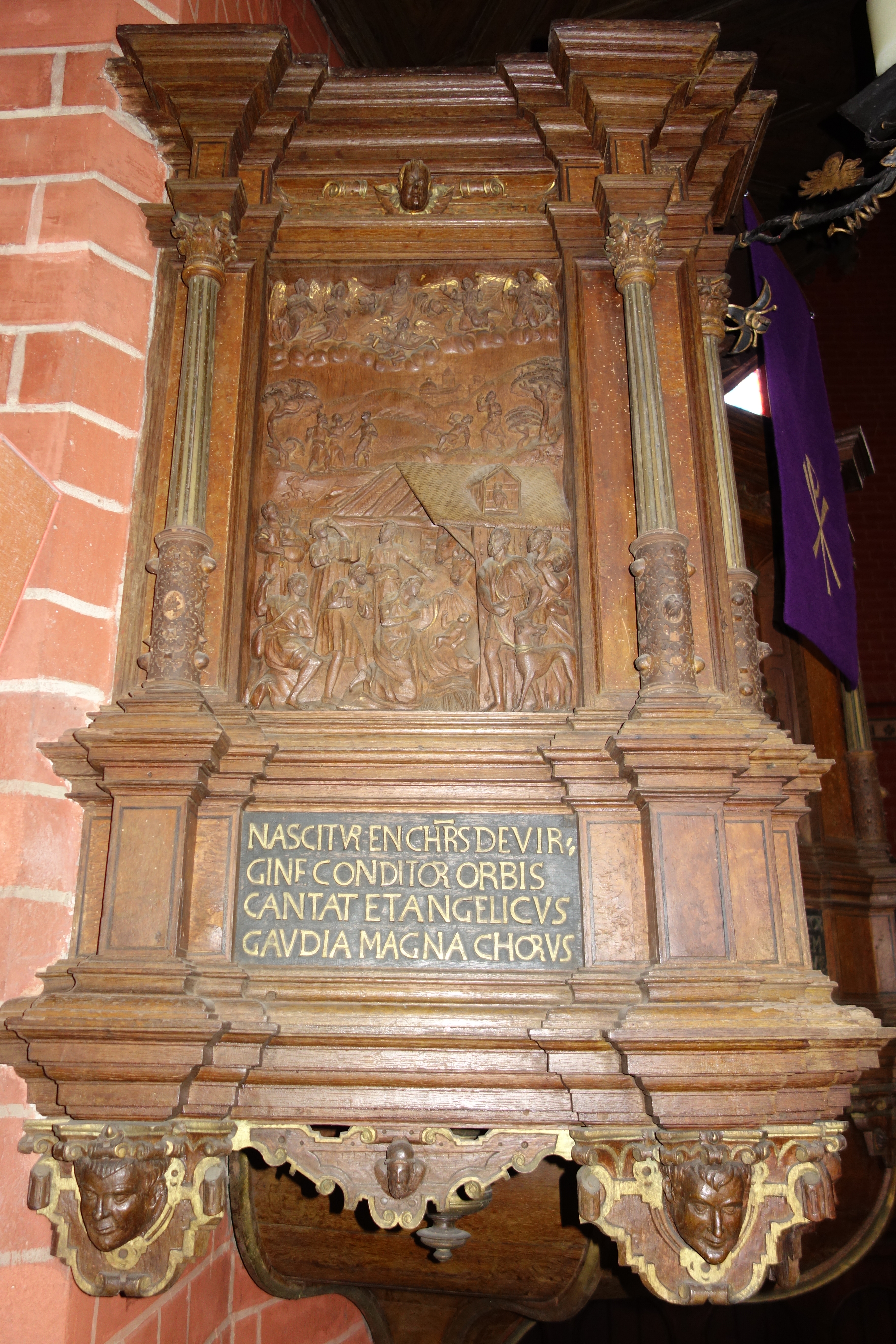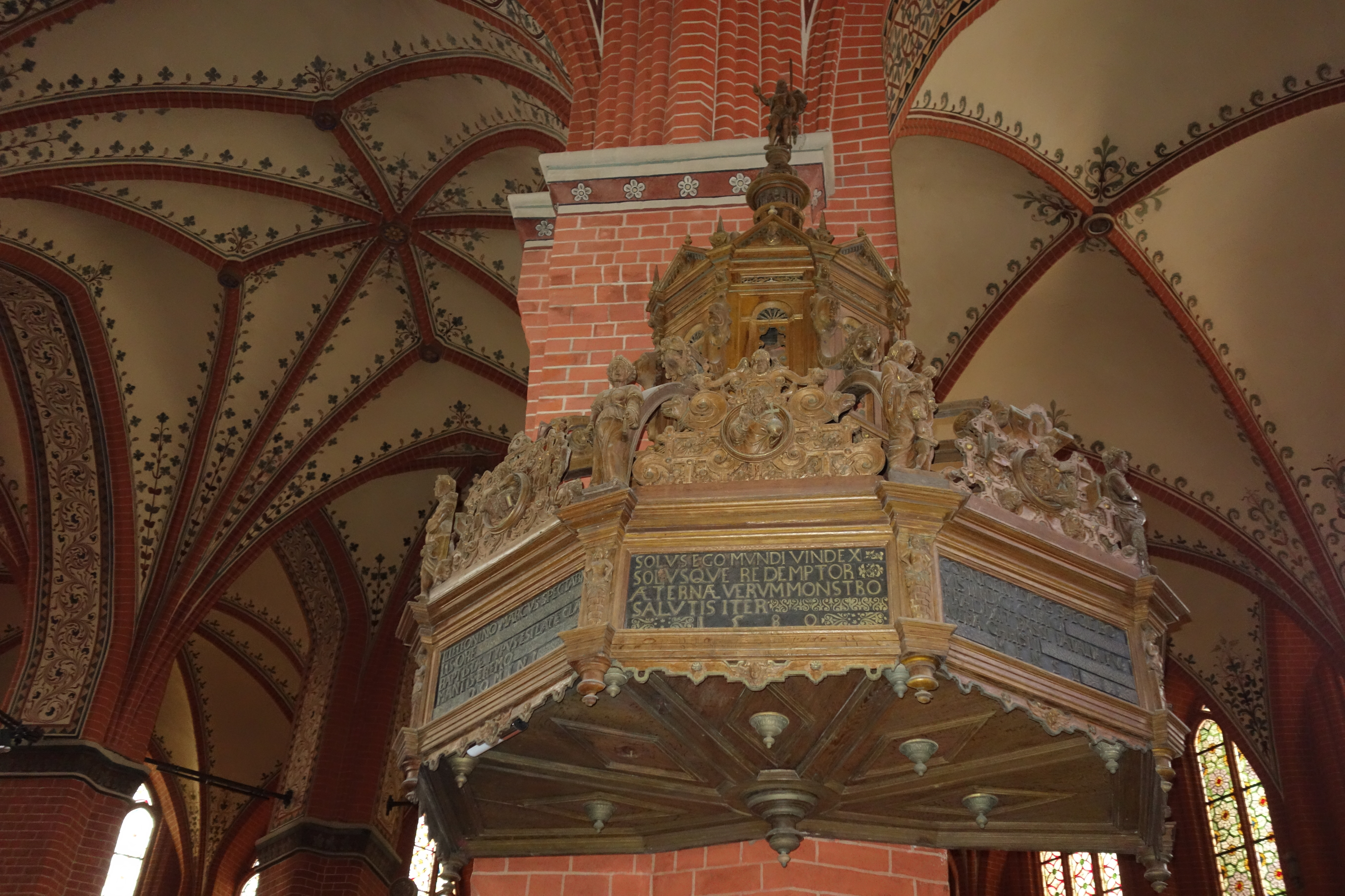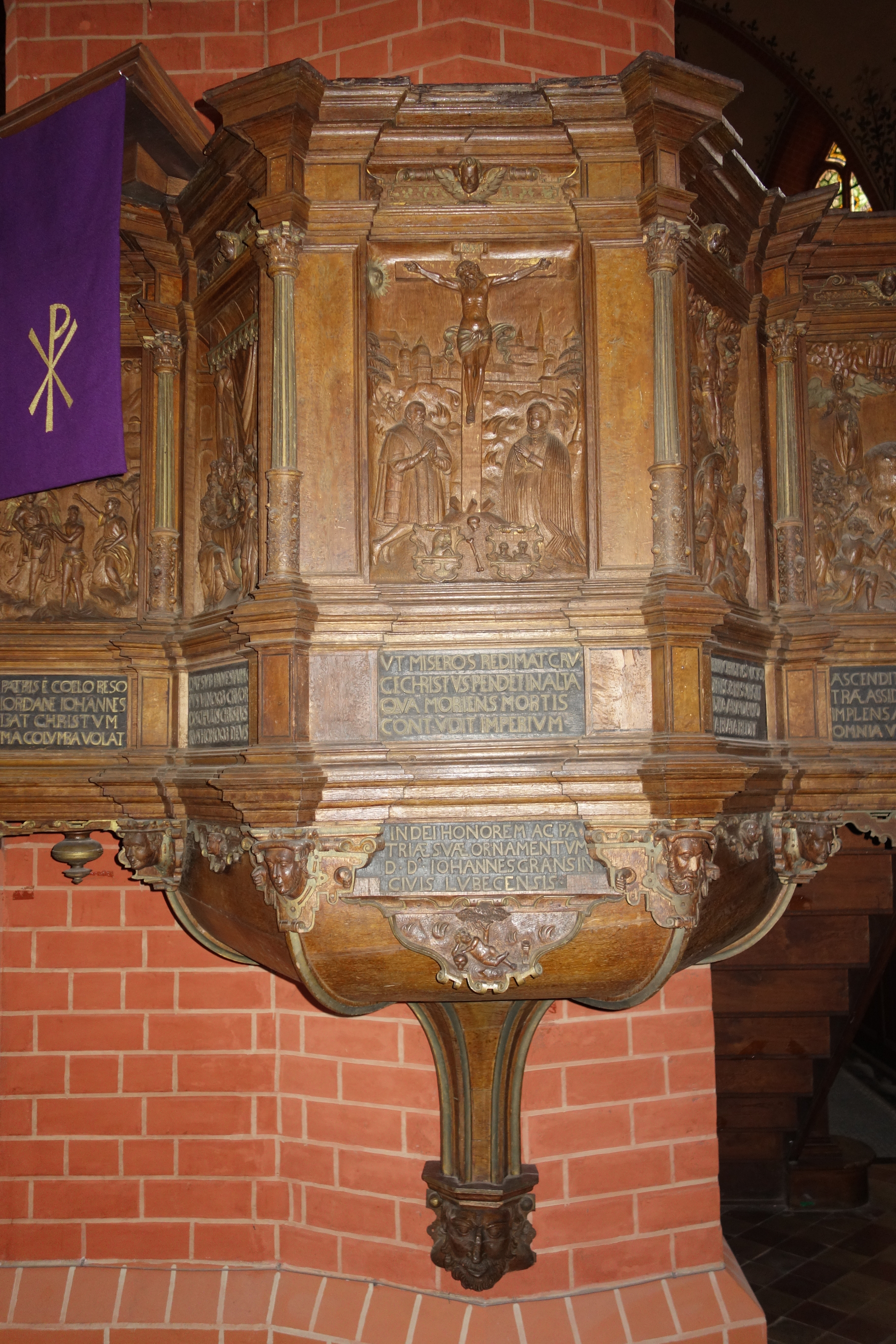 Das Leben und Sterben Jesu Christi steht auch im Focus des Bildprogramms der Kanzel, die sich durch ihre kunstvollen Schnitzarbeiten auszeichnet. Bedeutsame biblische Szenen wie die Kreuzigung, die Auferstehung und Christi Himmelfahrt schmücken, untertitelt mit lateinischen Bibelversen, den Kanzelkorb.