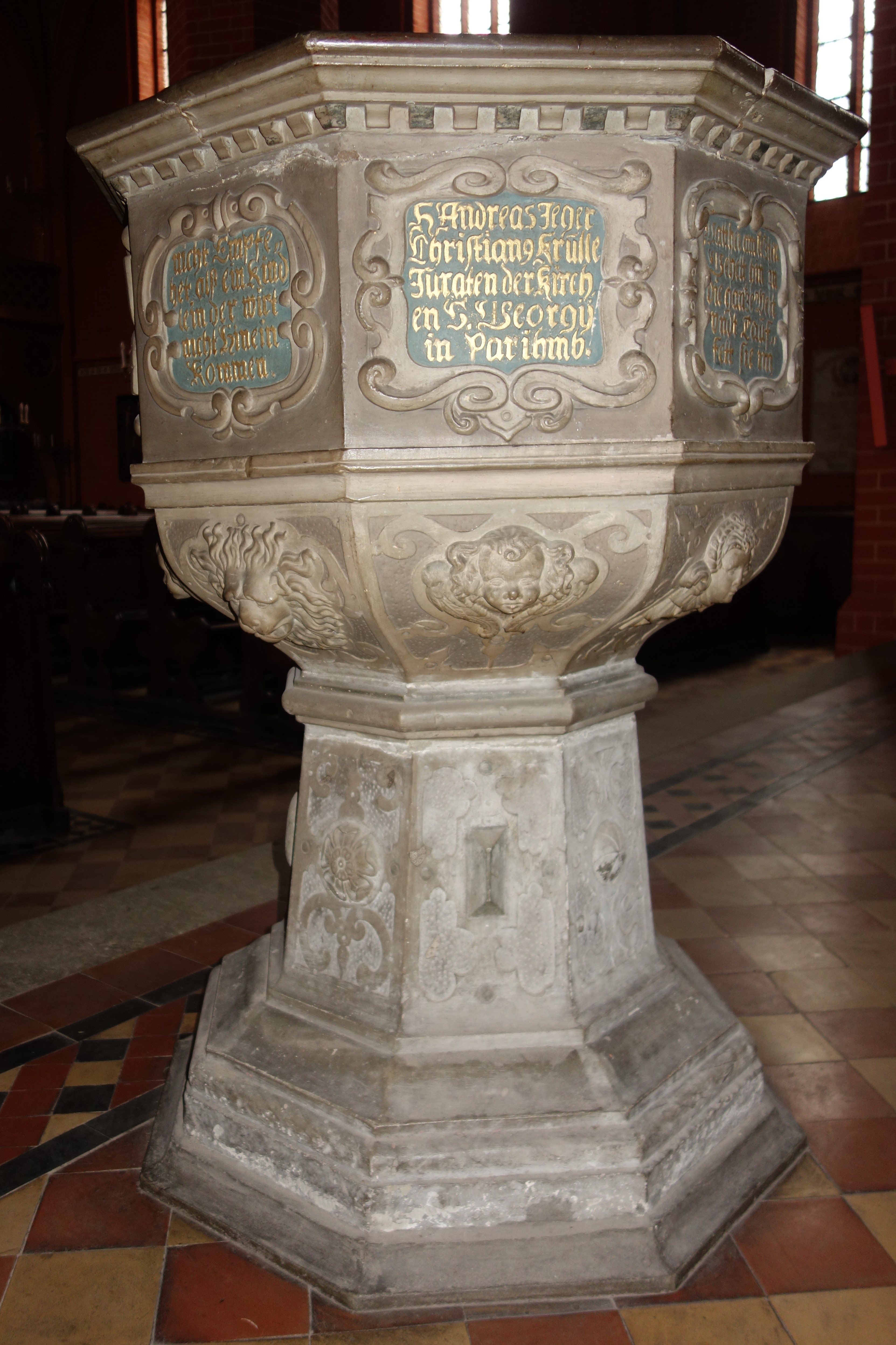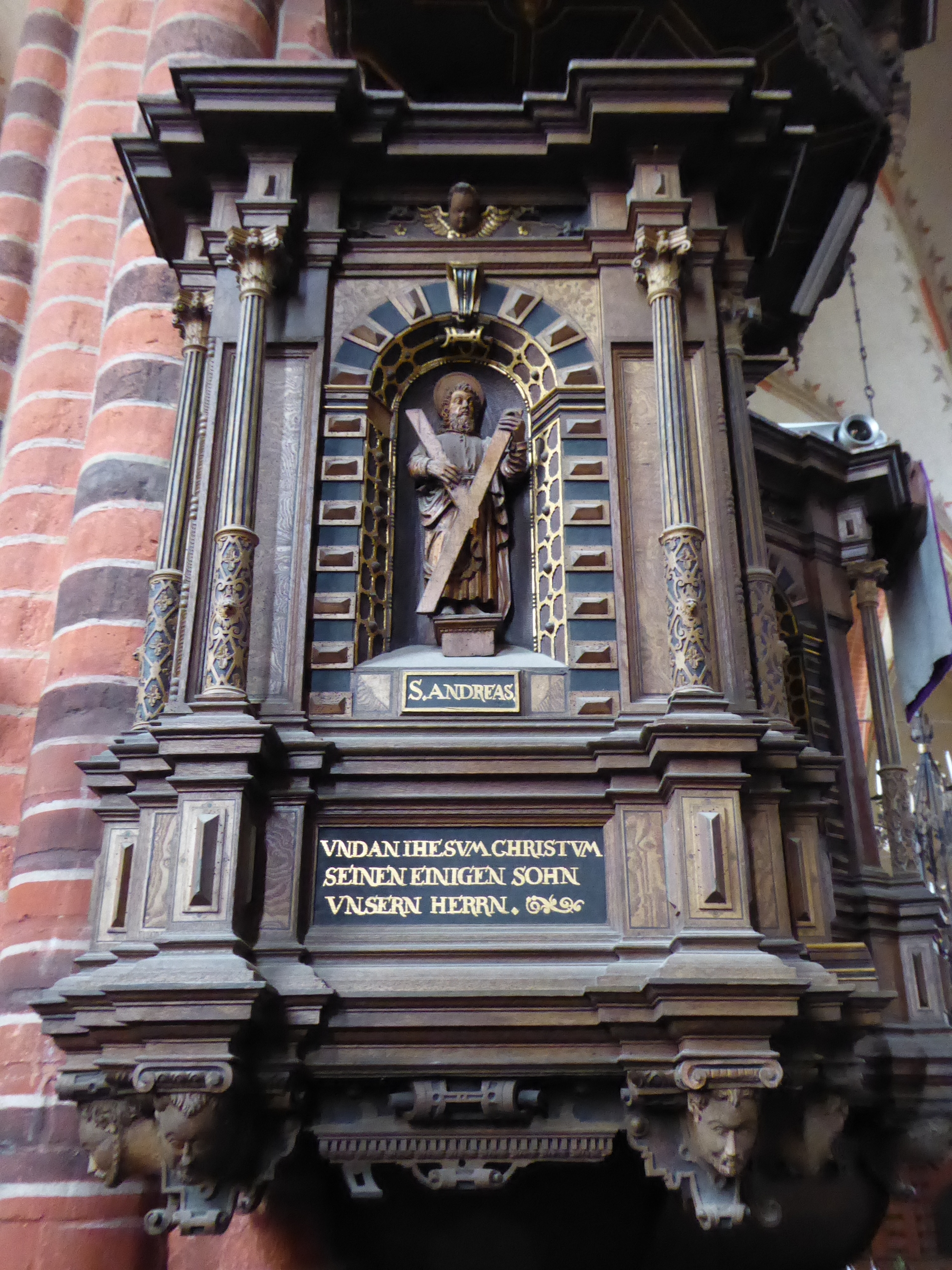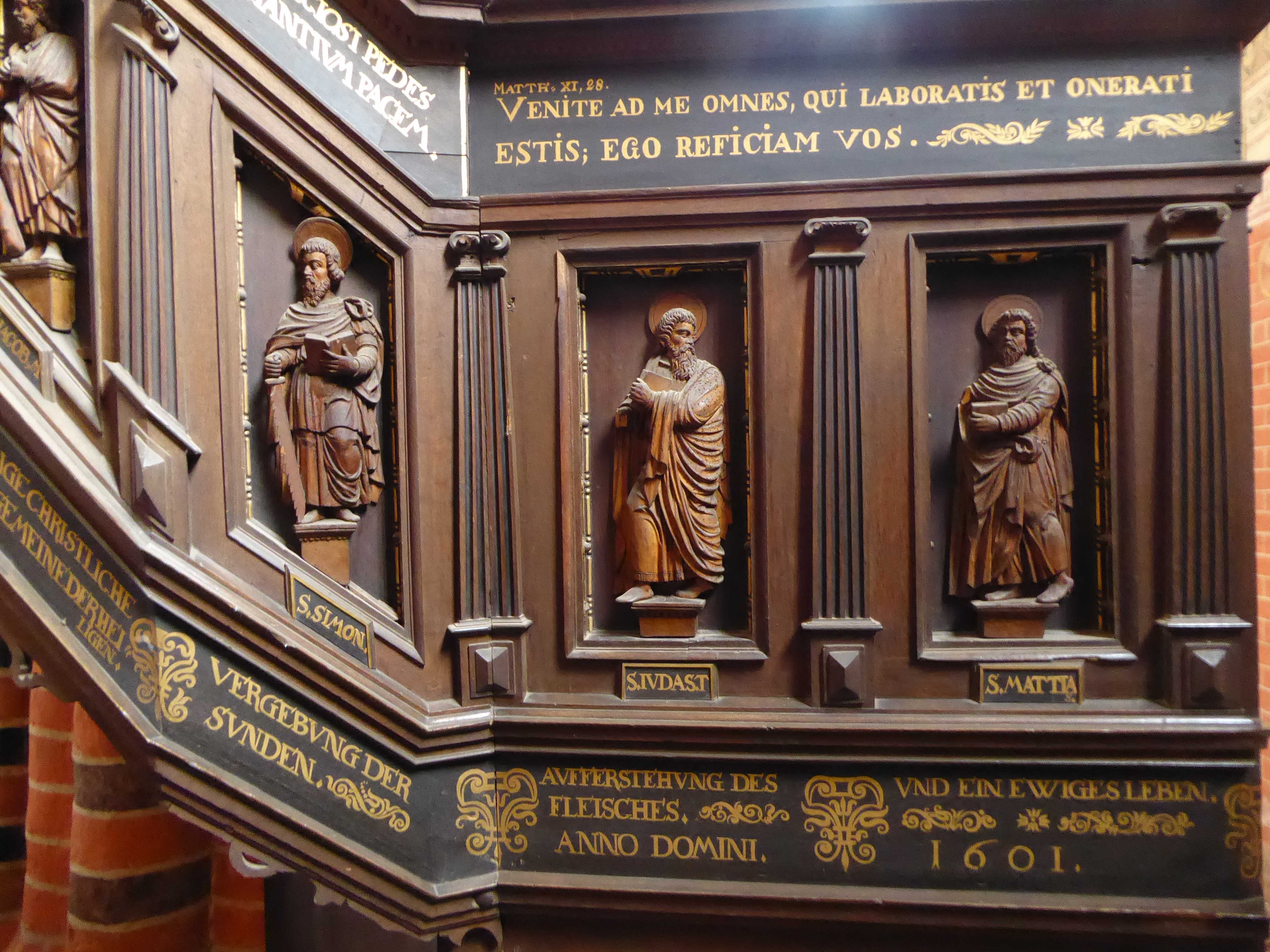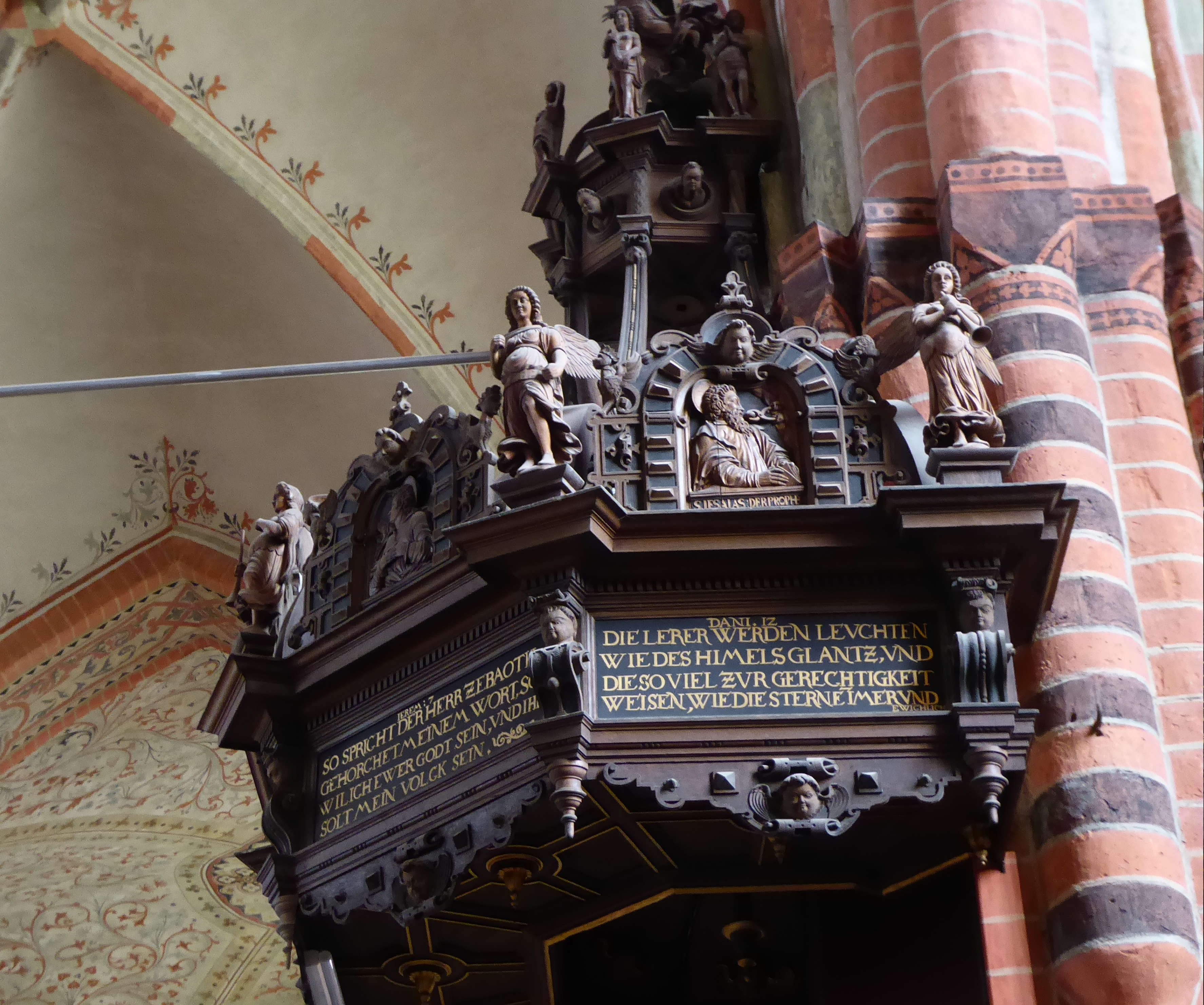 Apostel schmücken schließlich auch die Brüstungsfelder von Kanzelaufgang und -korb, während der Schalldeckel Darstellungen von vier Propheten enthält. Darunter sind in Schriftfeldern die Passagen des Glaubensbekenntnisses und Bibelsprüche zu lesen. Altes und Neues Testament, Glaube und Verkündigung des Wortes sind hier zusammengefasst.