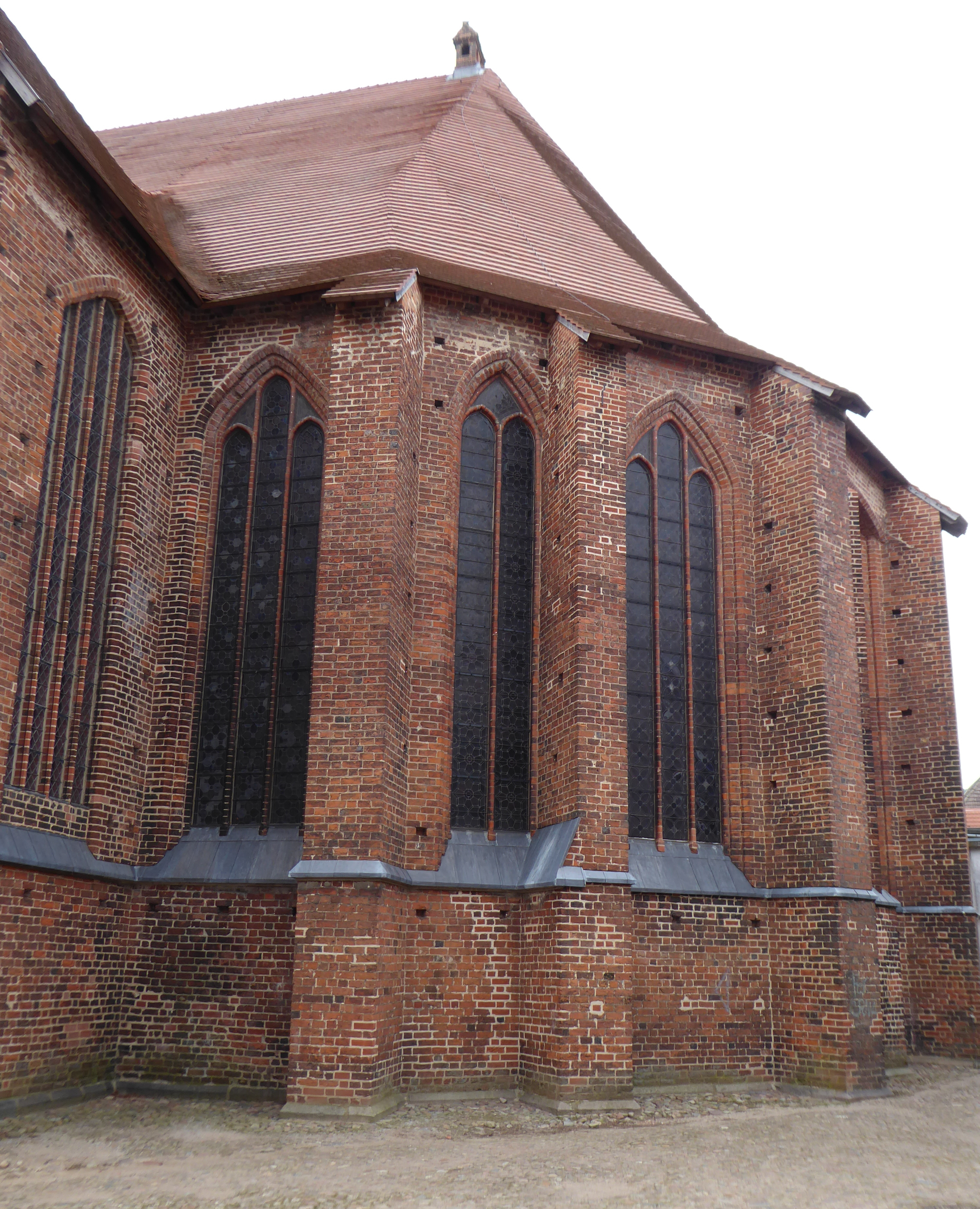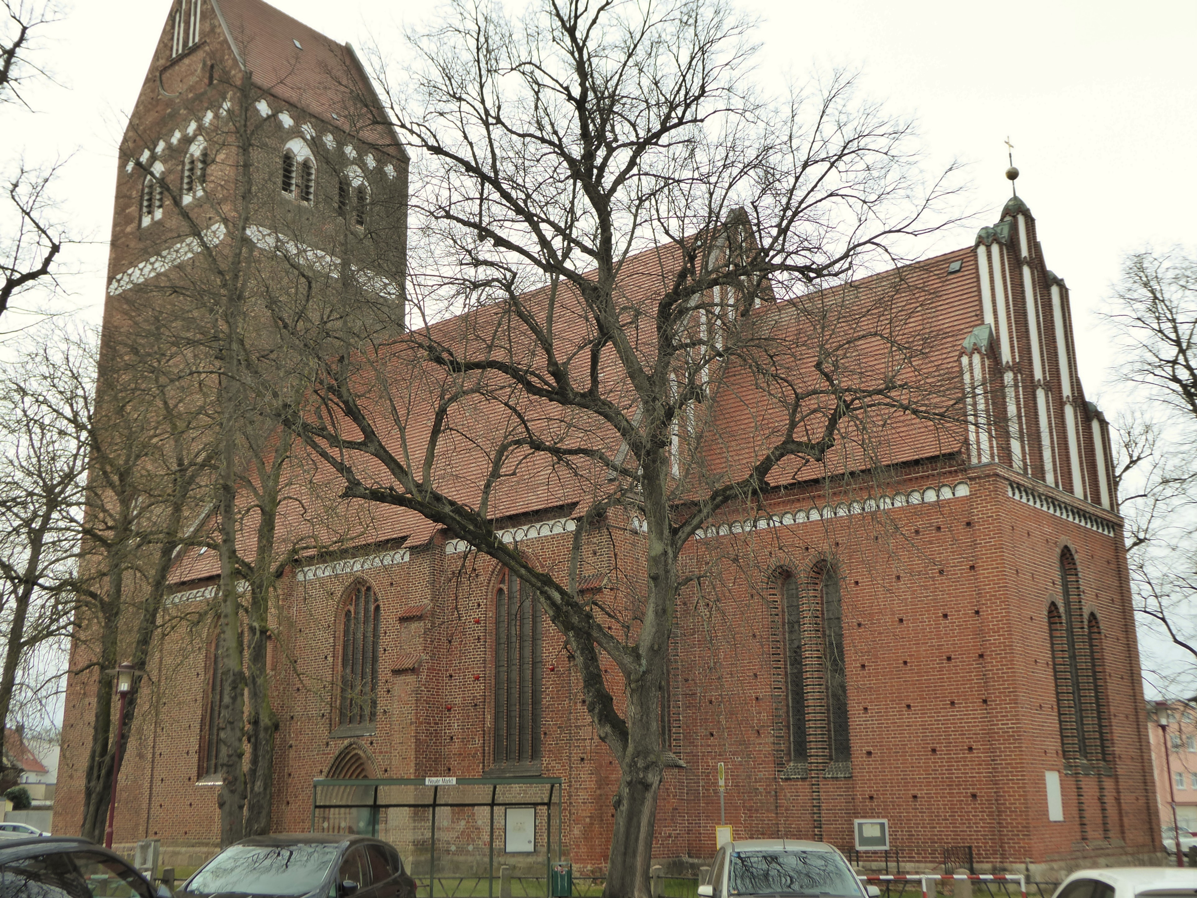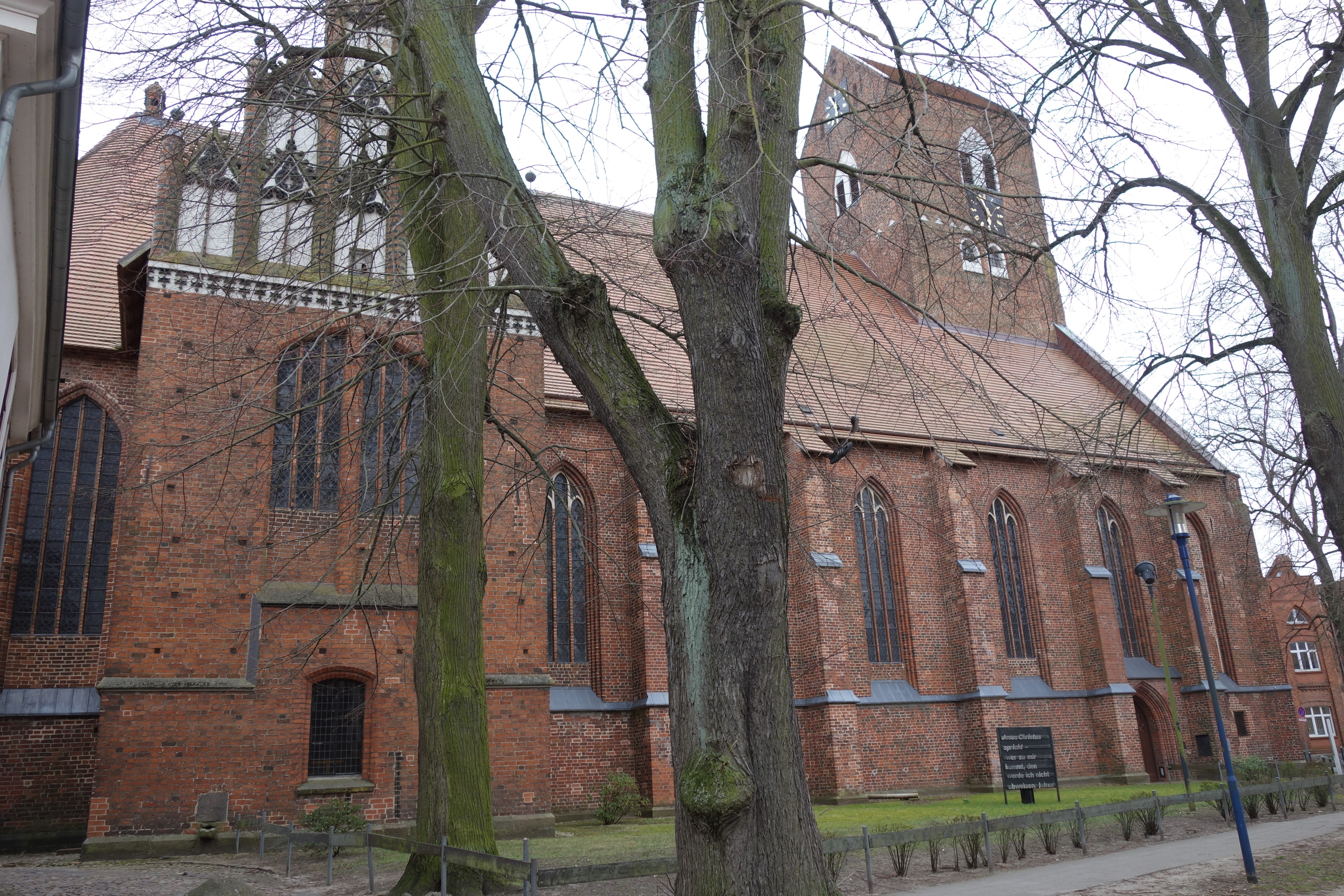 Mit dem Bau der Neustadtkirche wurde Mitte des 13. Jahrhunderts begonnen. Der frühgotische Backsteinbau mit Westturm und eingezogenem Rechteckchor erhielt im 15. Jahrhundert an der Nordseite einen Anbau mit zwei quergestellten Giebeln, der heute als Winterkirche dient. In dessen Außenwand sind seitlich des Portalbogens zwei große glasierte Steine mit figürlichen Reliefs eingelassen. Neben einem Bischof, erkennbar an einem Krummstab, ist hier Maria mit dem Jesuskind dargestellt, die Patronin der Kirche.