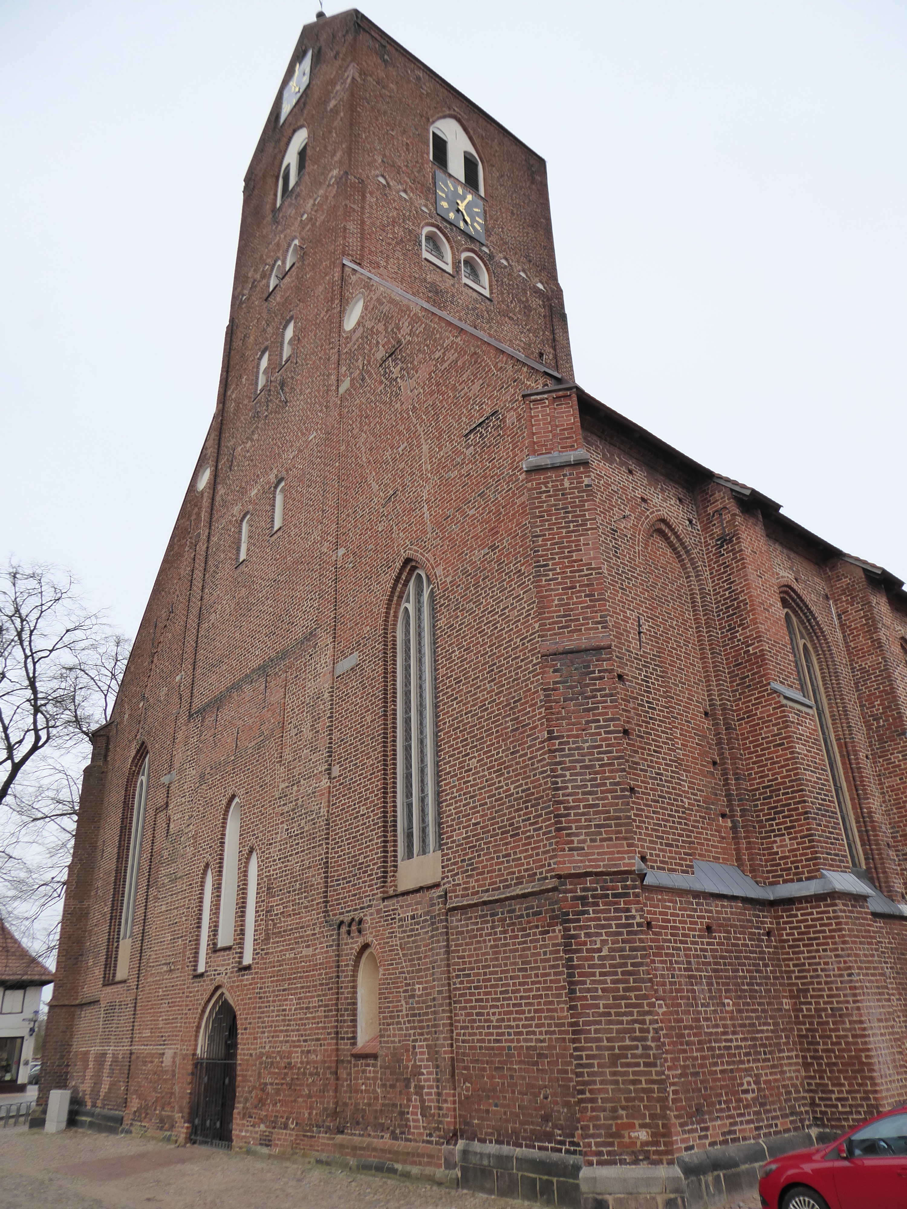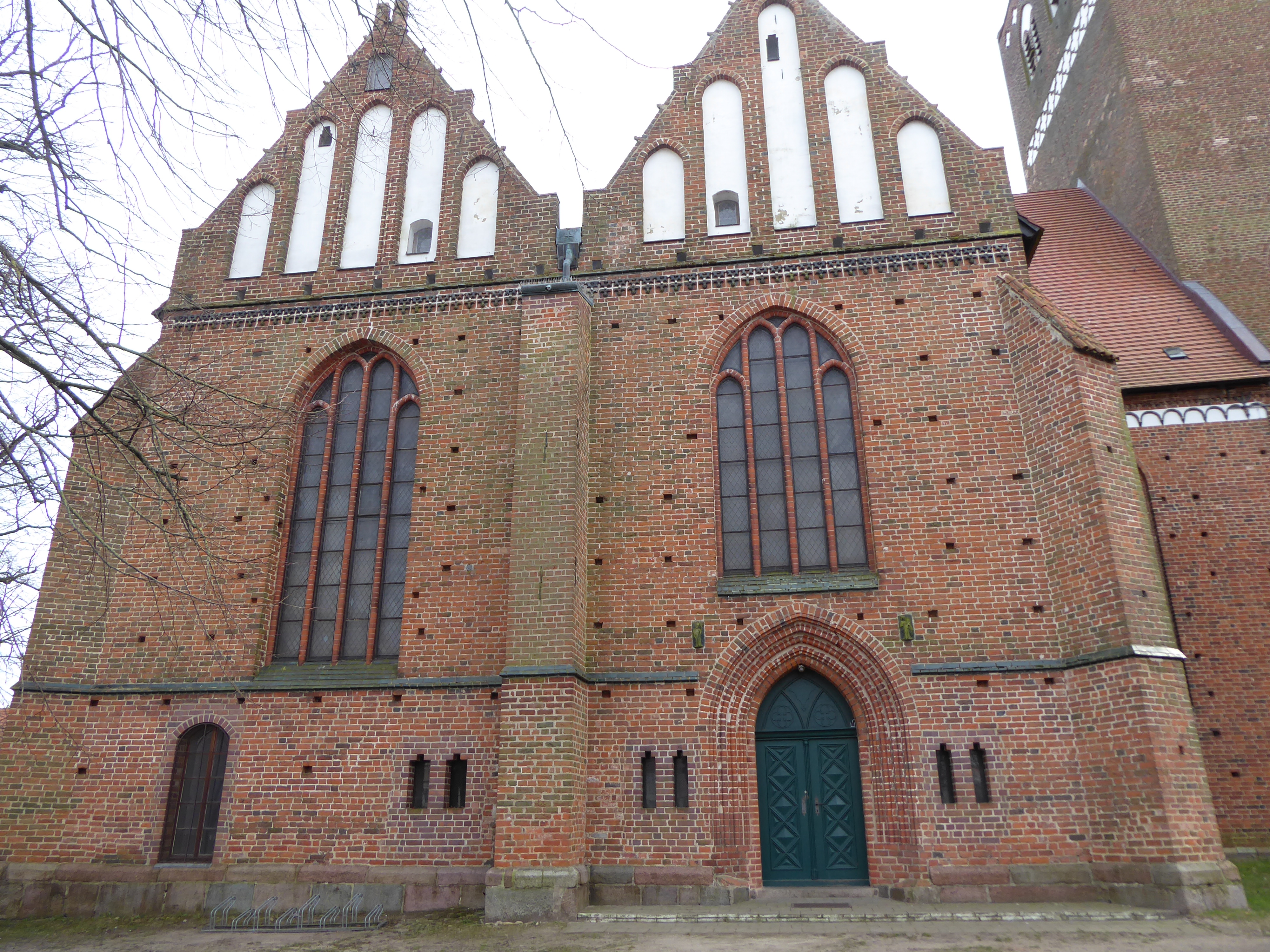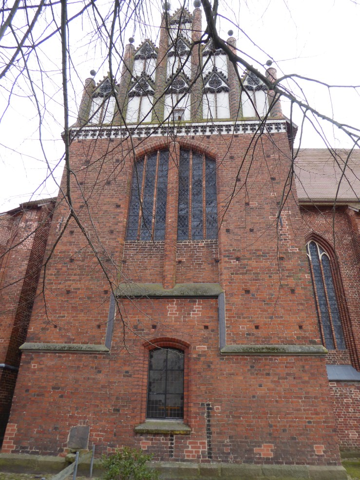 Mit dem Bau der Neustadtkirche wurde Mitte des 13. Jahrhunderts begonnen. Der frühgotische Backsteinbau mit Westturm und eingezogenem Rechteckchor erhielt im 15. Jahrhundert an der Nordseite einen Anbau mit zwei quergestellten Giebeln, der heute als Winterkirche dient. In dessen Außenwand sind seitlich des Portalbogens zwei große glasierte Steine mit figürlichen Reliefs eingelassen. Neben einem Bischof, erkennbar an einem Krummstab, ist hier Maria mit dem Jesuskind dargestellt, die Patronin der Kirche.
