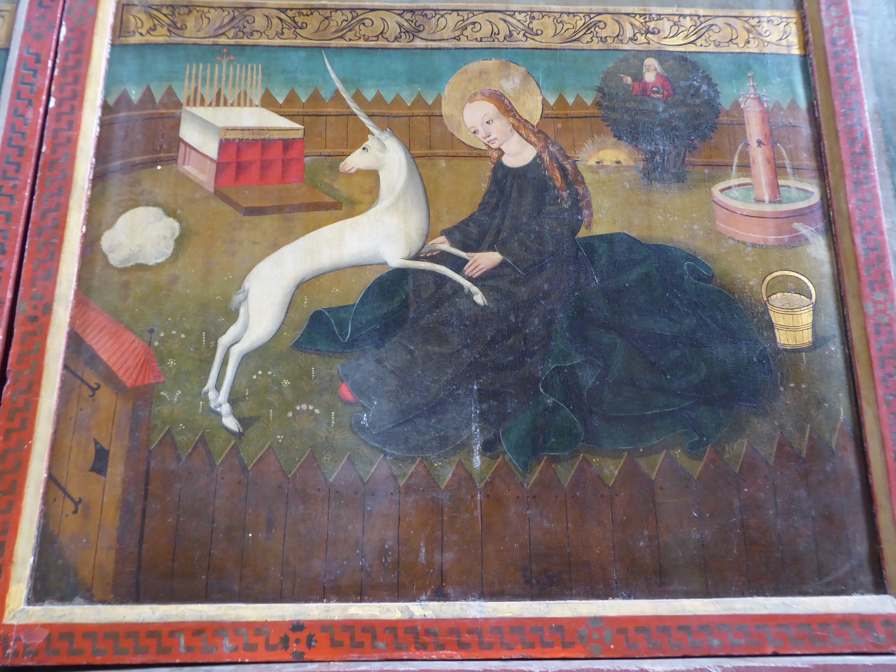 Auf einer der Tafeln ist Maria in einem geschlossenen Garten sitzend mit einem Einhorn auf ihrem Schoß abgebildet. Während der Garten symbolhaft für die Jungfräulichkeit der Gottesmutter steht, bezeichnet das Fabeltier das Gute schlechthin, das im Schoße Marias auch als Jesus Christus gedeutet wird.