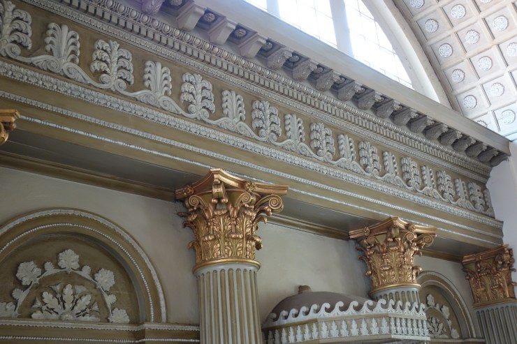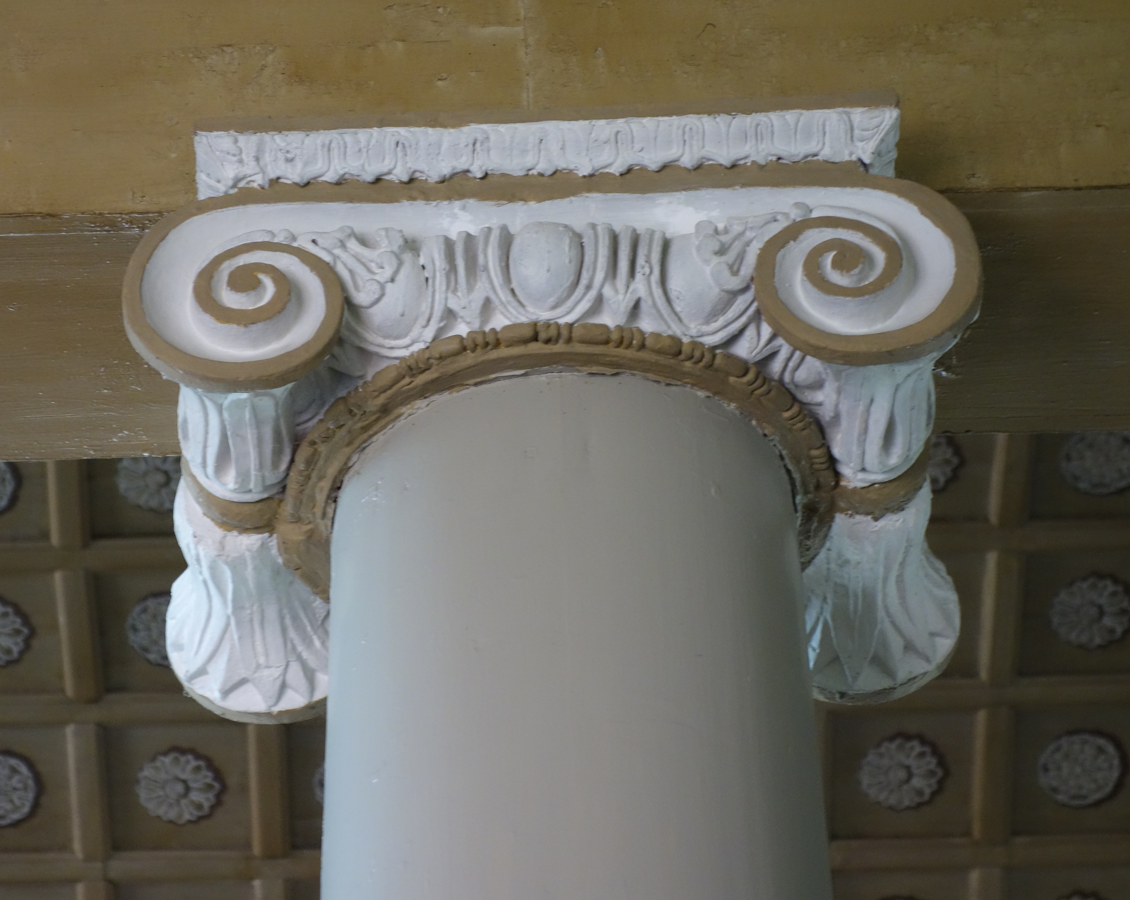 Weiter oben wird die Ausstattung des Kirchenraums kunstvoller. Die Säulen im Emporengeschoss enden mit fein gearbeiteten ionischen Kapitellen. Sie stützen die Decke, die sich über dem Mittelschiff mit einem weiten hölzernen Tonnengewölbe nach oben, zum Himmel öffnet. Gemälde mit himmlischen Heerscharen schmücken die Decke allerdings nicht. Jede einzelne der unzähligen Kassetten enthält eine gemalte Rosette.