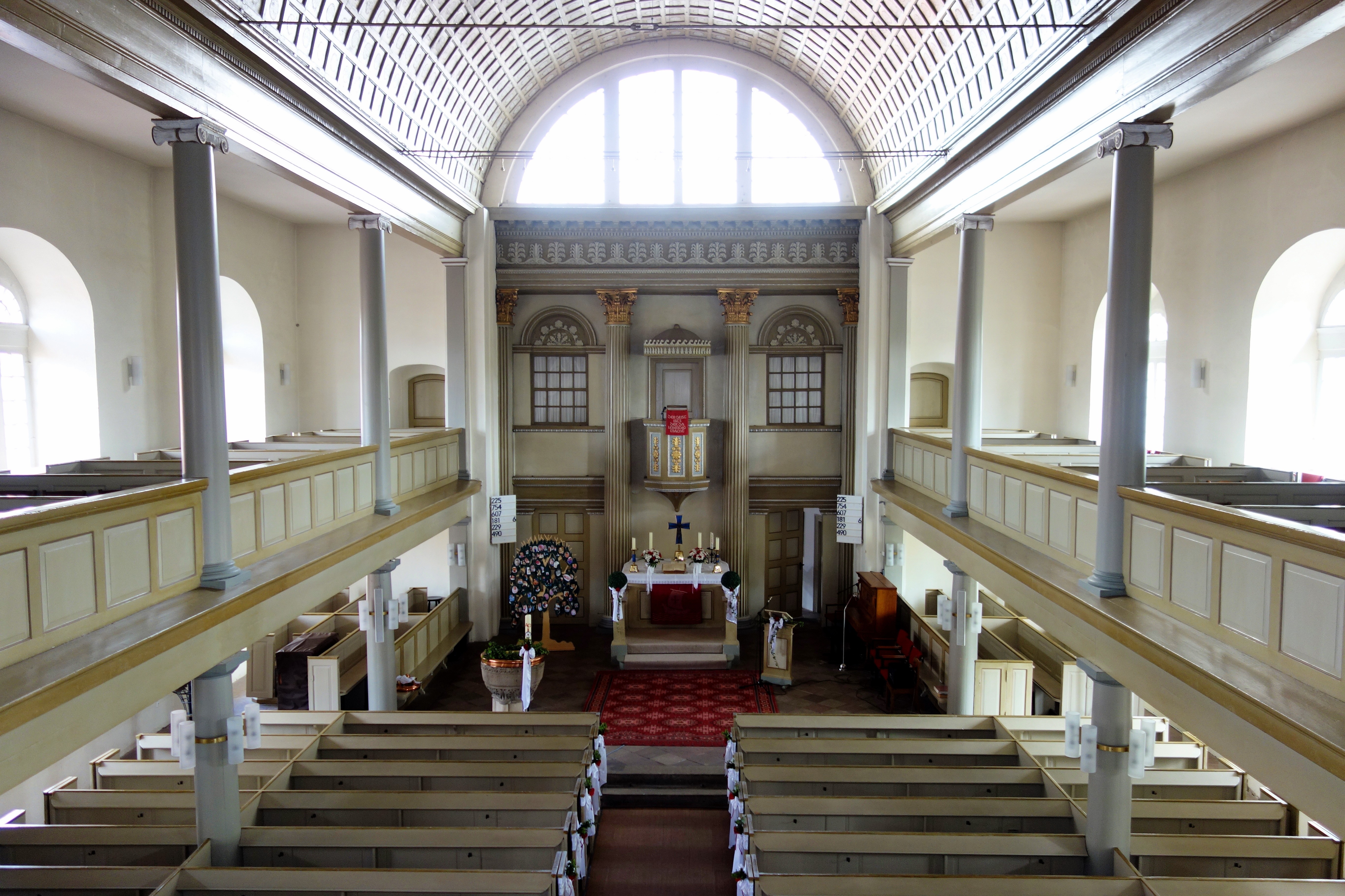 Bänke wohin das Auge blickt – das ist der erste Eindruck im Innenraum der Kirche. Unten, auf der Erde, wo das Gestühl für die Gemeinde steht, bestimmt Schlichtheit den Raum. Einfache dorische Holzsäulen stützen die Empore. Der Altar mit seinen Kerzen und dem modernen Kreuz, die darüber angebrachte Kanzel und der steinerne Taufstein aus dem Mittelalter mit der Osterkerze prägen, wie auch die Orgel auf der Westempore, den Raum als Ort des Gottesdienstes.