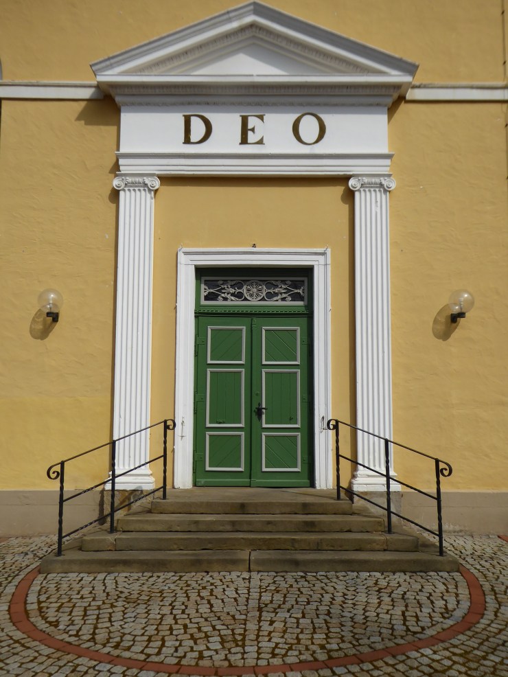 … kürzer und ausdrucksstärker kann eine Inschrift kaum sein. Die drei Buchstaben zieren das breite Gebälk des Hauptportals der St. Jacobi Kirche zu Stolzenau. „Dem Gott“ oder auch „Für Gott“ – so kann man das kurze lateinische Wort übersetzen. Der Sinngehalt des Gebäudes wird damit jedem klar werden. Zwei Pilaster mit ionischen Kapitellen stützen das Gebälk, ein spitzer Giebel schließt das Portal ab. Wie der Eingang in einen antiken Tempel wirkt diese Pforte.