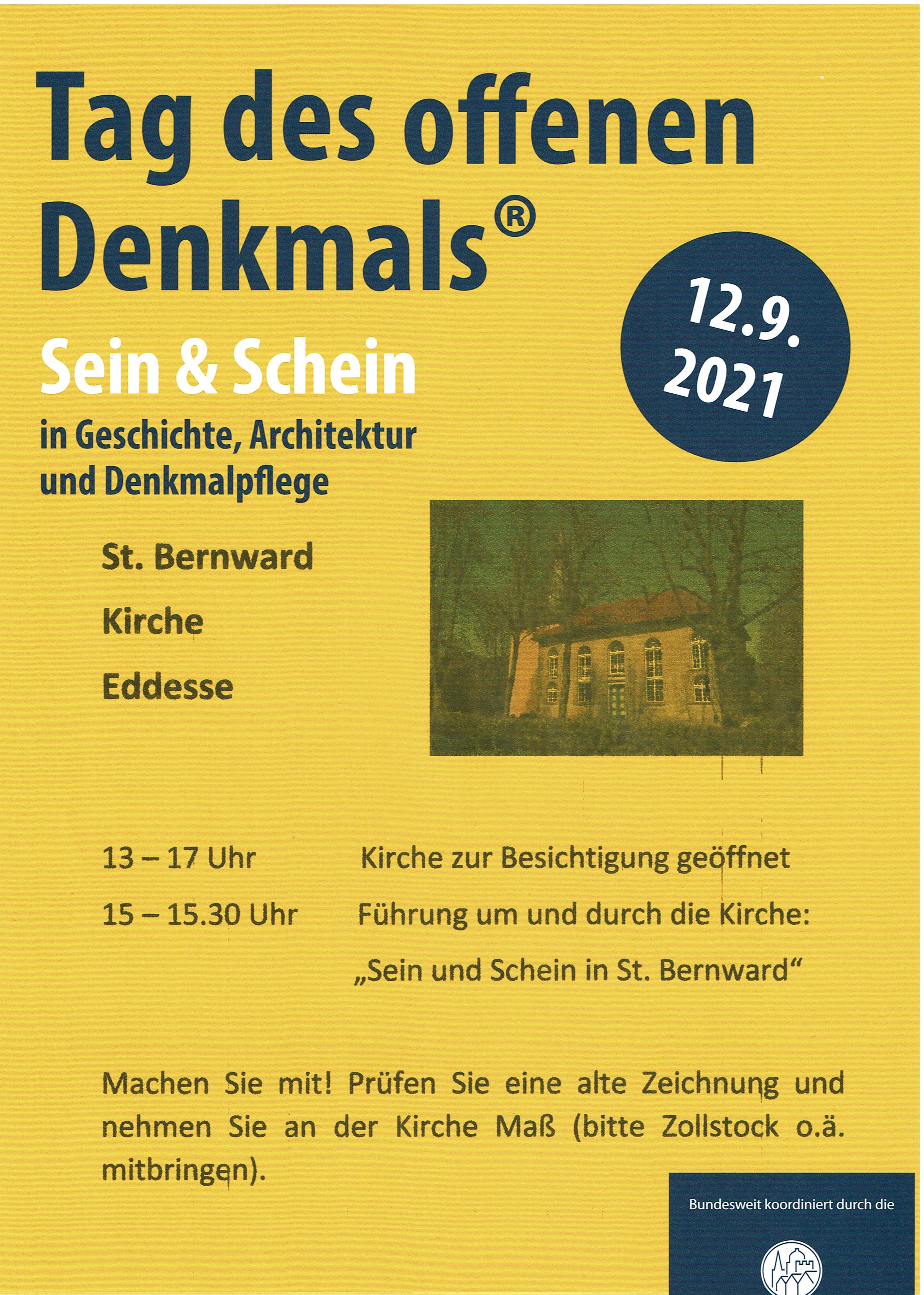 „Schein und Sein“ – unter dem Motto des Denkmaltags im Jahr 2021, der im Gegensatz zum Vorjahr wieder Präsenzveranstaltungen ermöglichte, stellte ich die St. Bernwardkirche in Eddesse einem interessierten Kreis vor. Den Ablauf der Veranstaltung finden Sie hier: